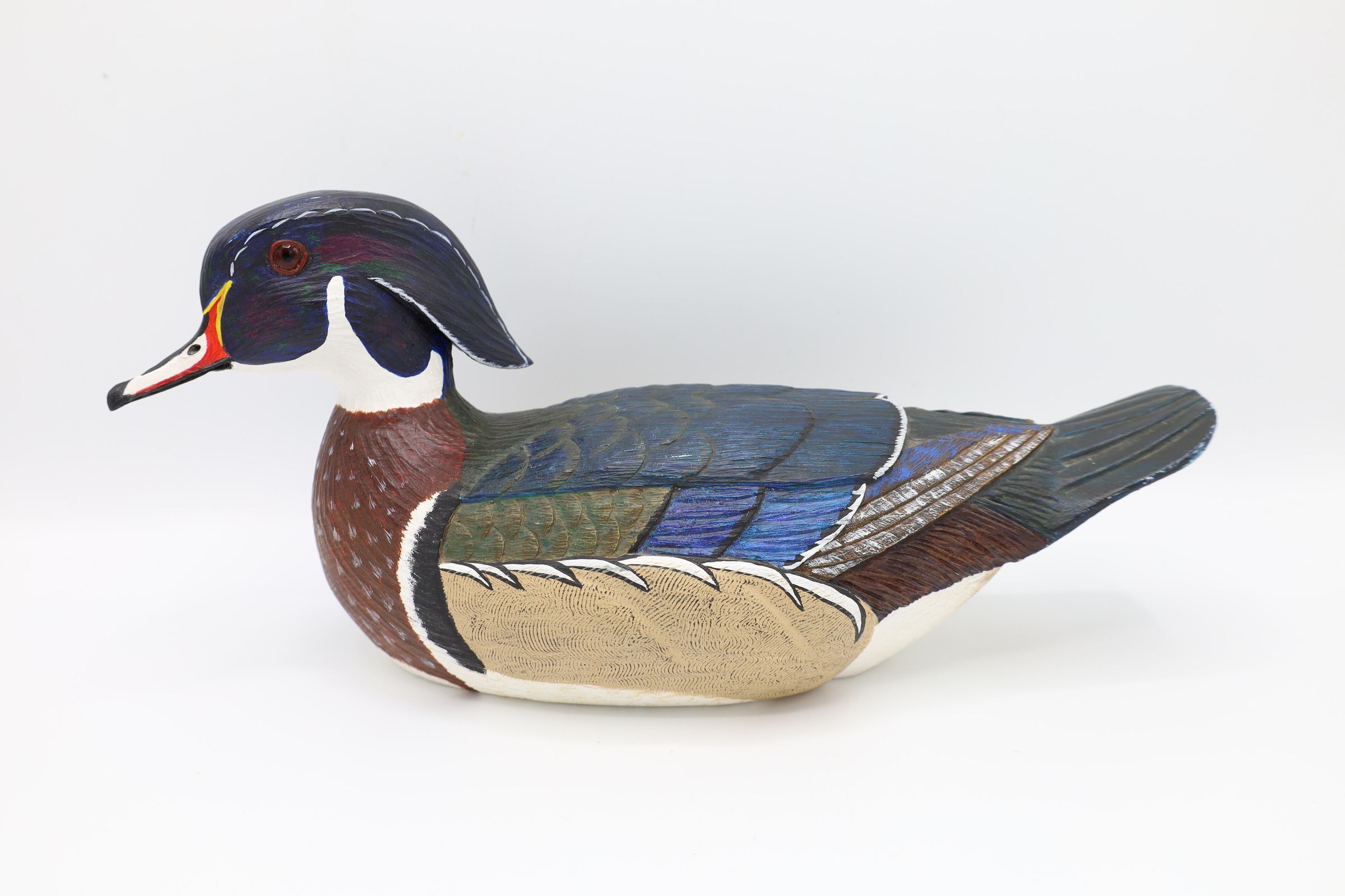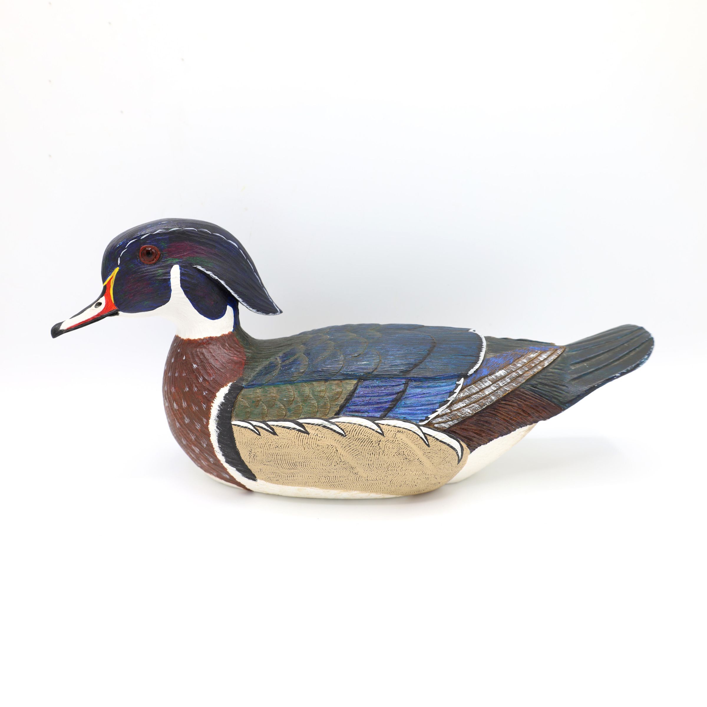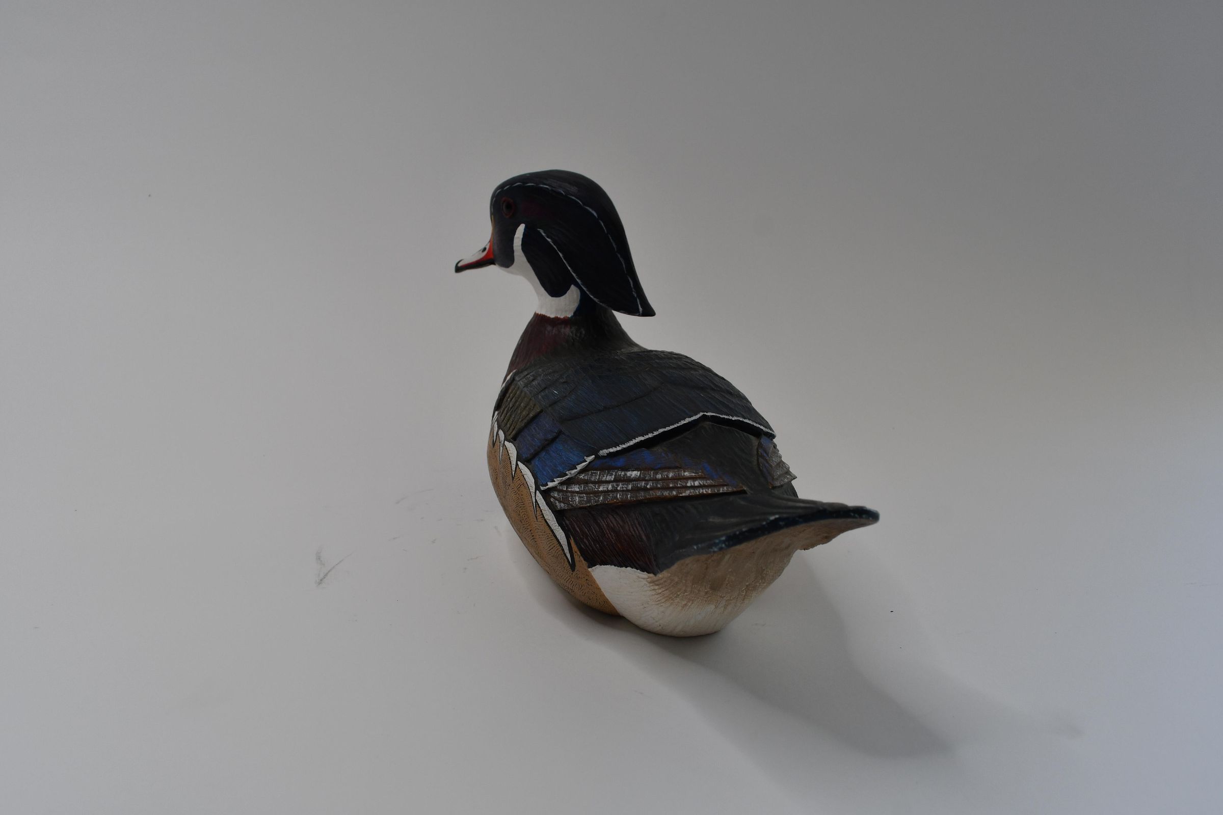 This Wood Duck decoy is an example of John Sharon's later work. Circa 1972, the decoy, carved from pine, shows significant realism and details in the carving and painting.Context