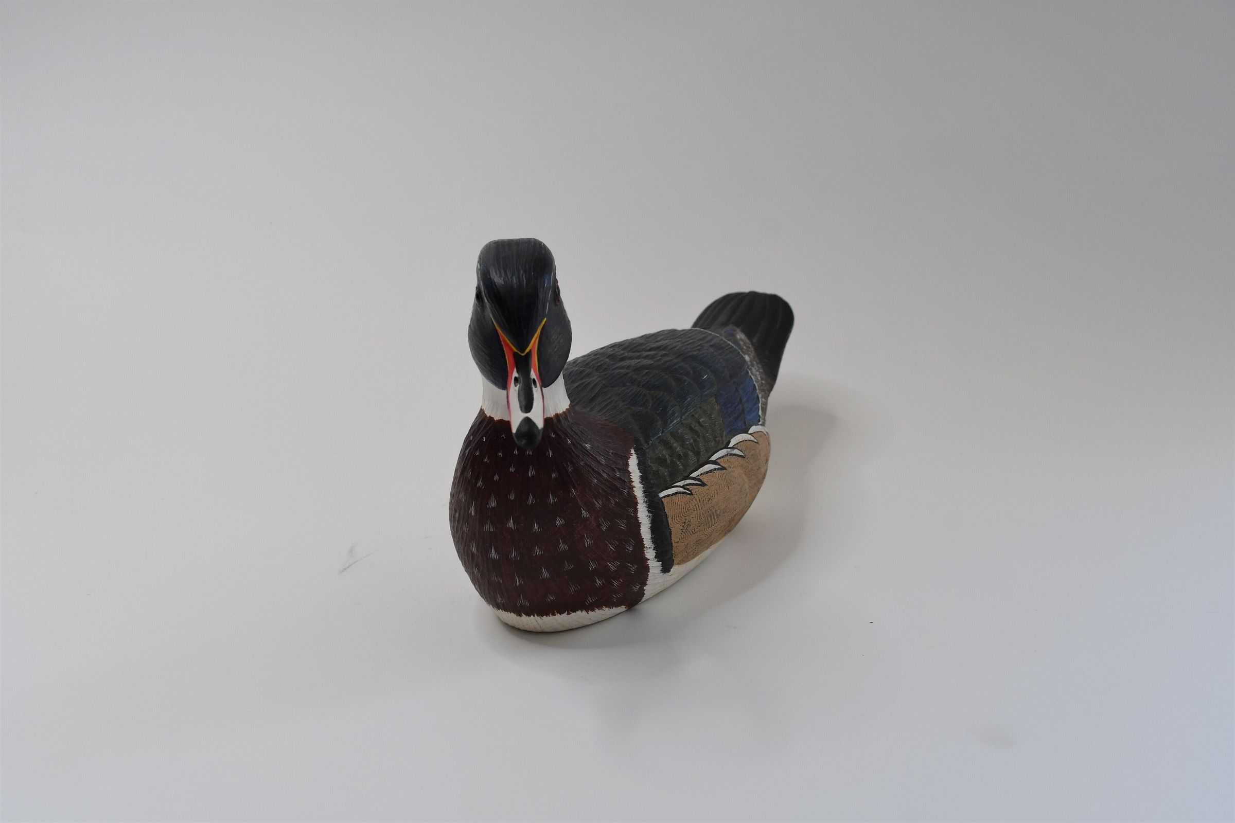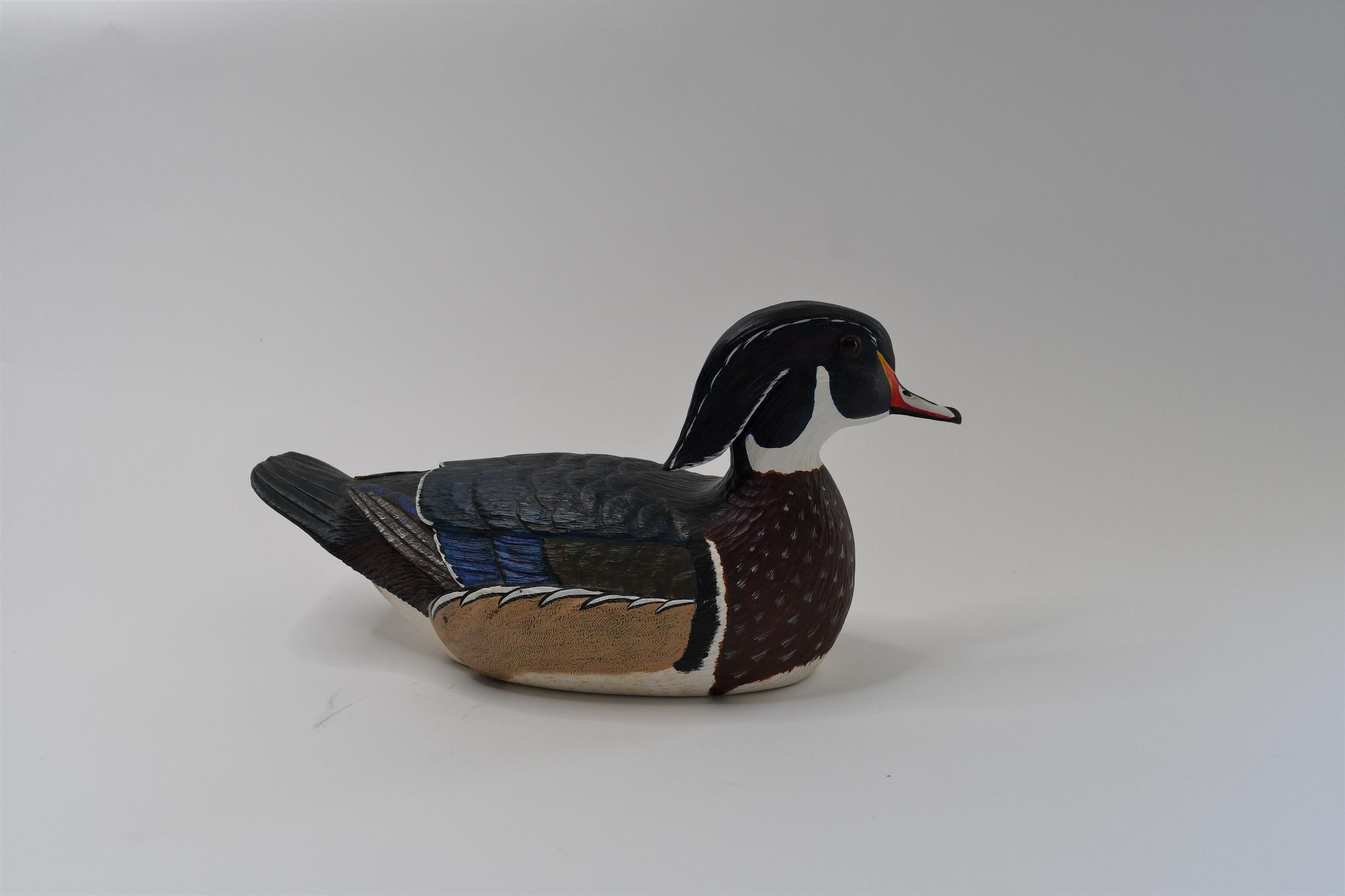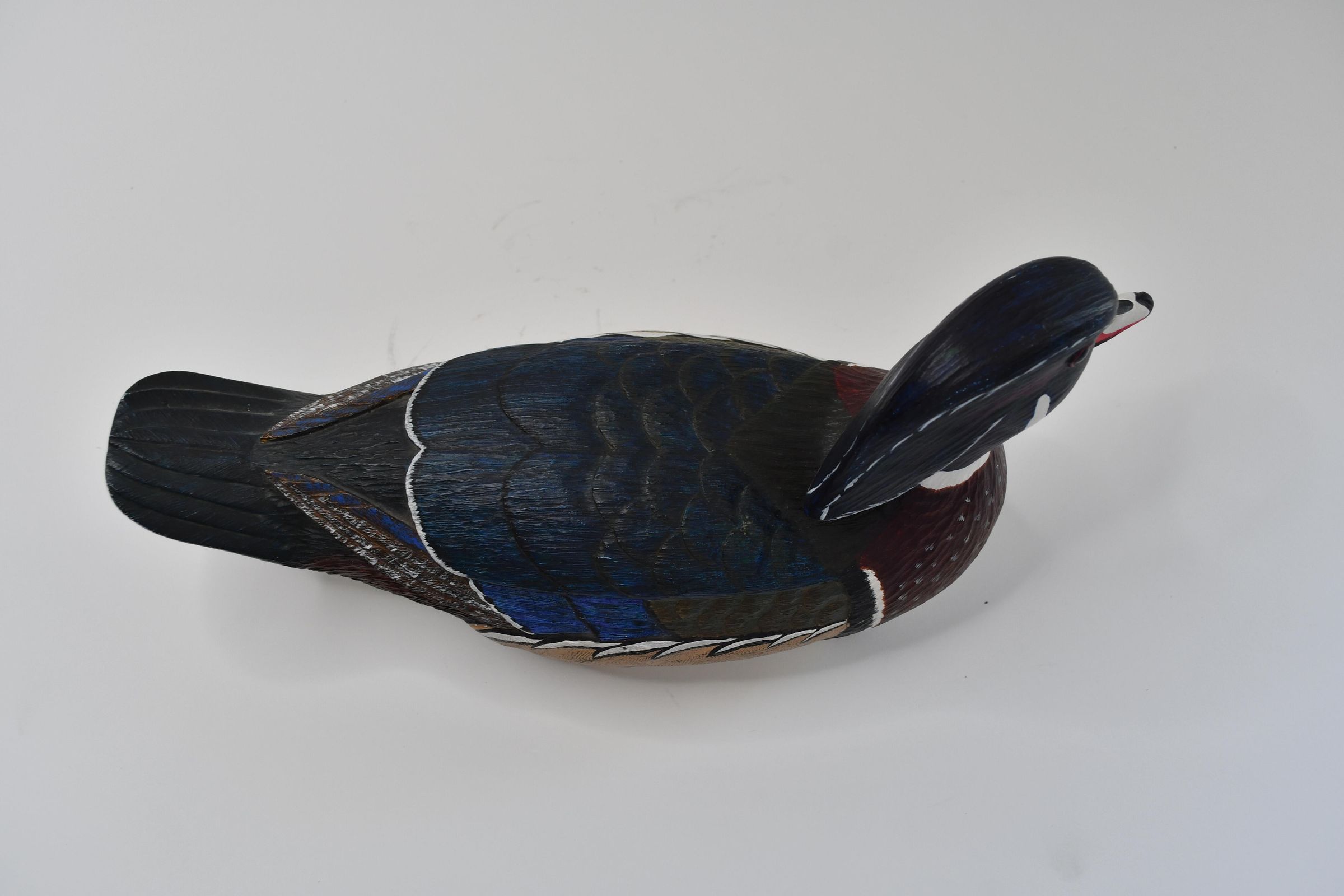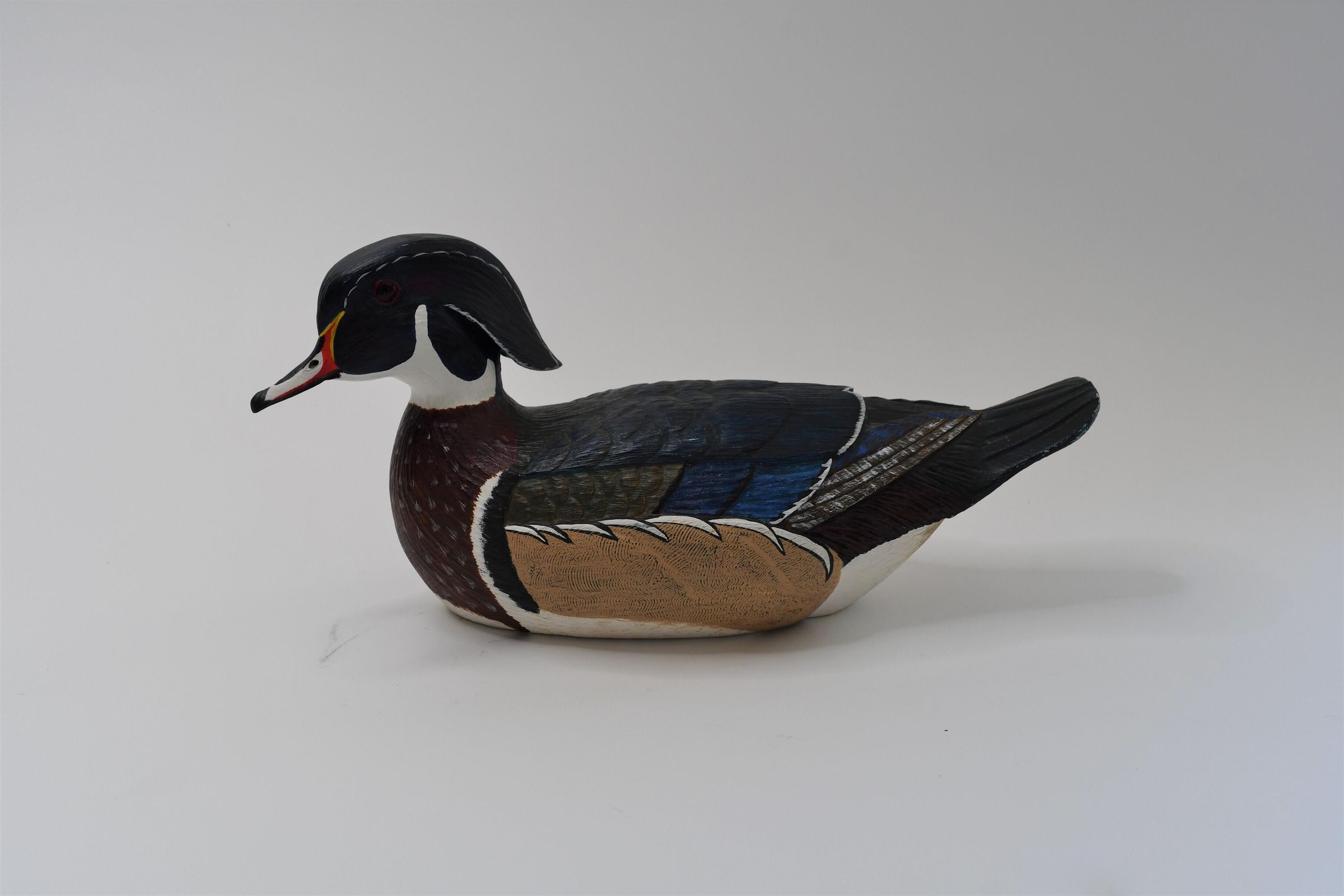 This Wood Duck decoy is an example of John Sharon's later work. Circa 1972, the decoy, carved from pine, shows significant realism and details in the carving and painting.Context