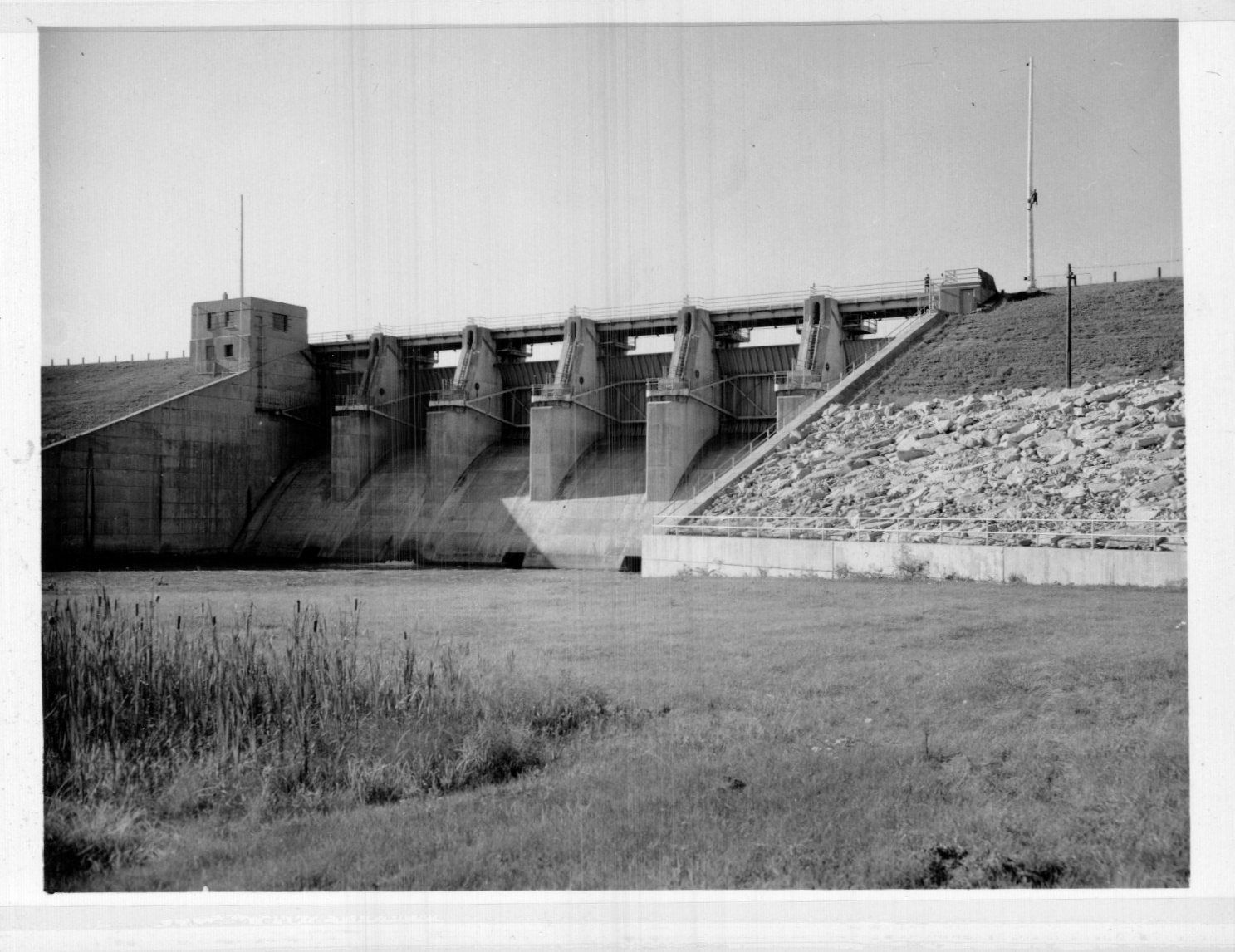 A photograph taken August 27, 1957, of Delaware Dam from near the spillway.