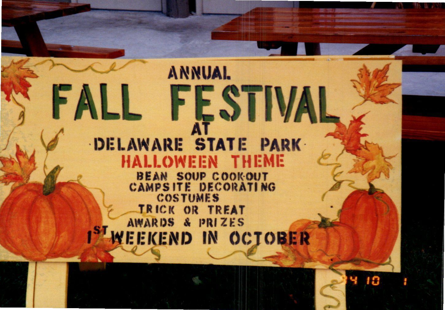 A festive, hand-painted sign advertising Delaware State Park's annual fall festival that takes place the first week of October.