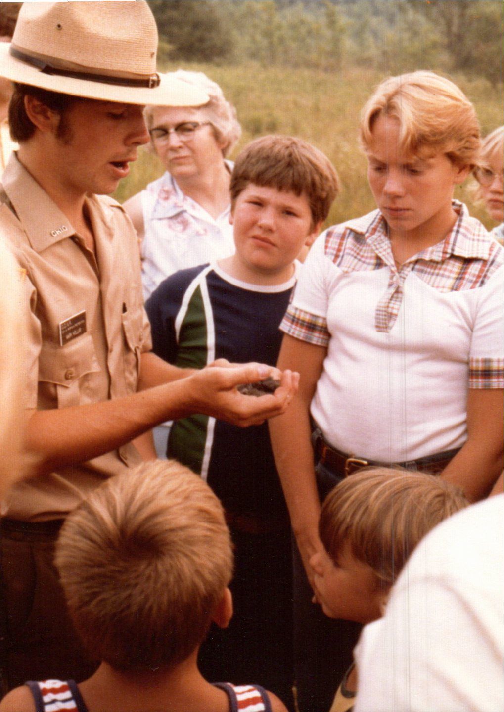 A naturalist leads an educational program for children at Delaware State Park. Children crowd in as he shows them something with his hands-perhaps a frog.Cataloged By