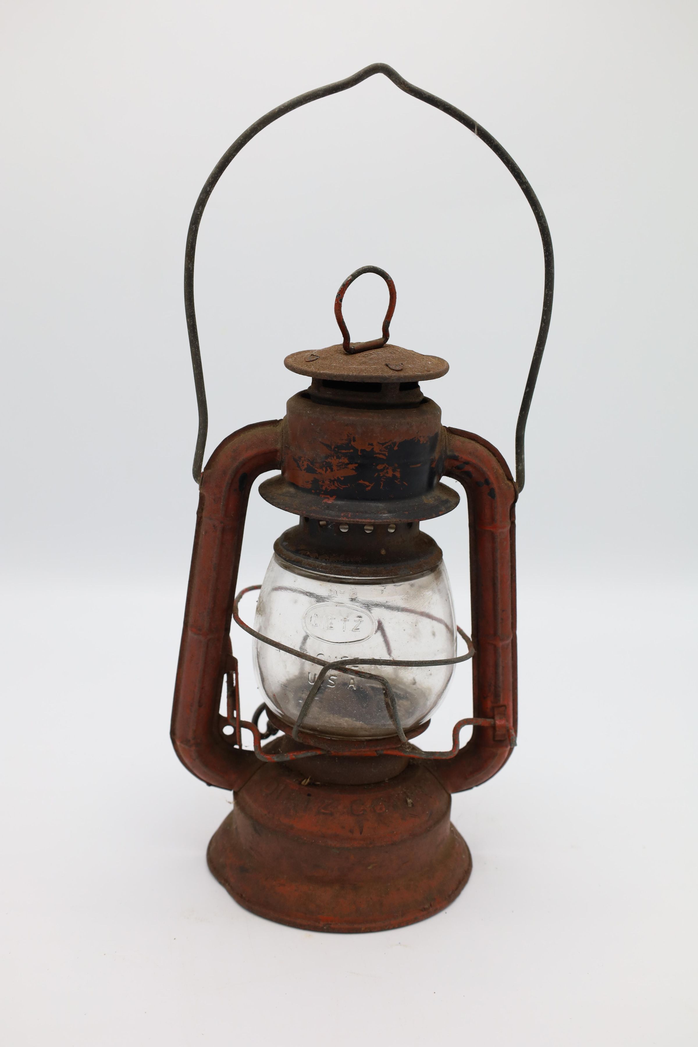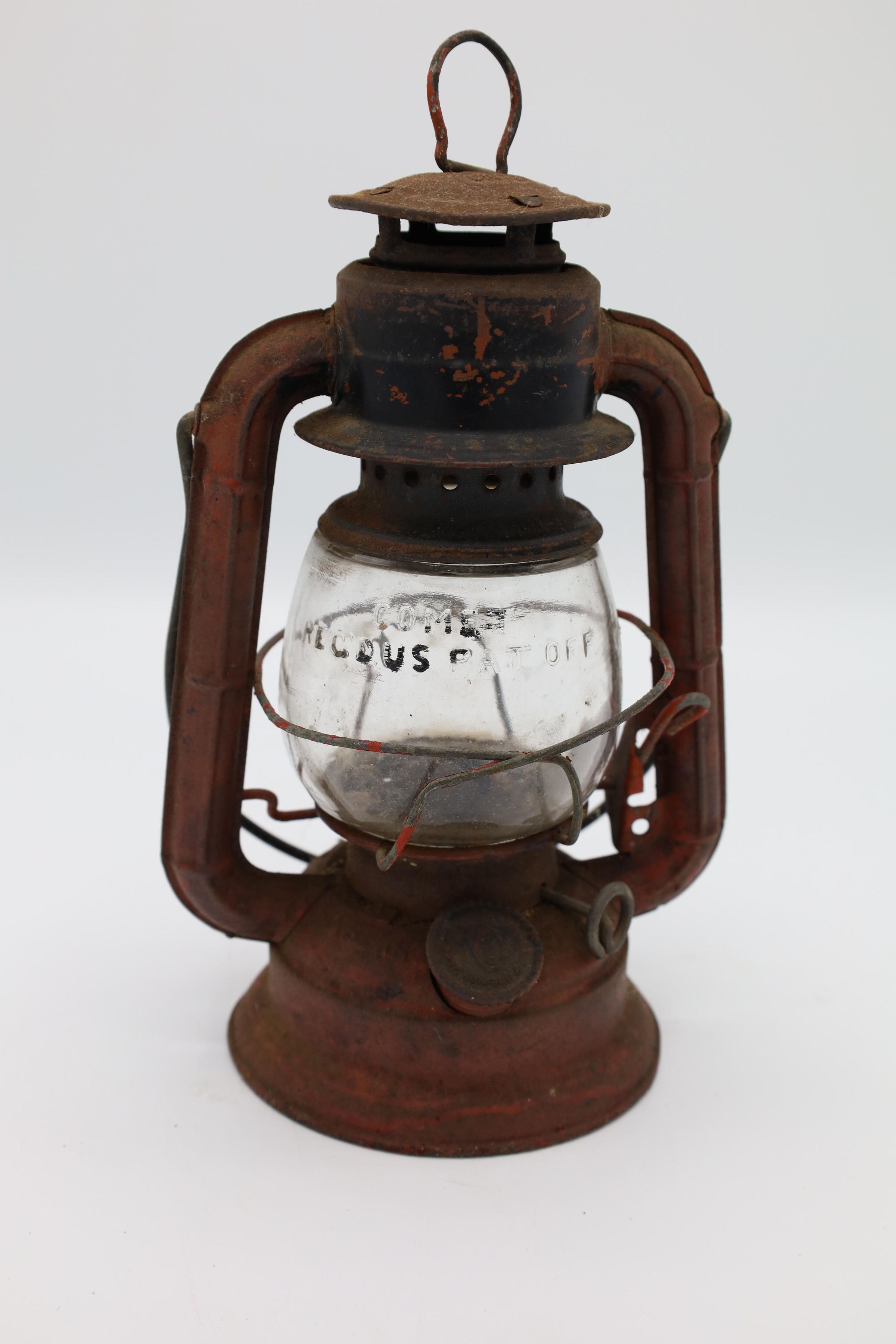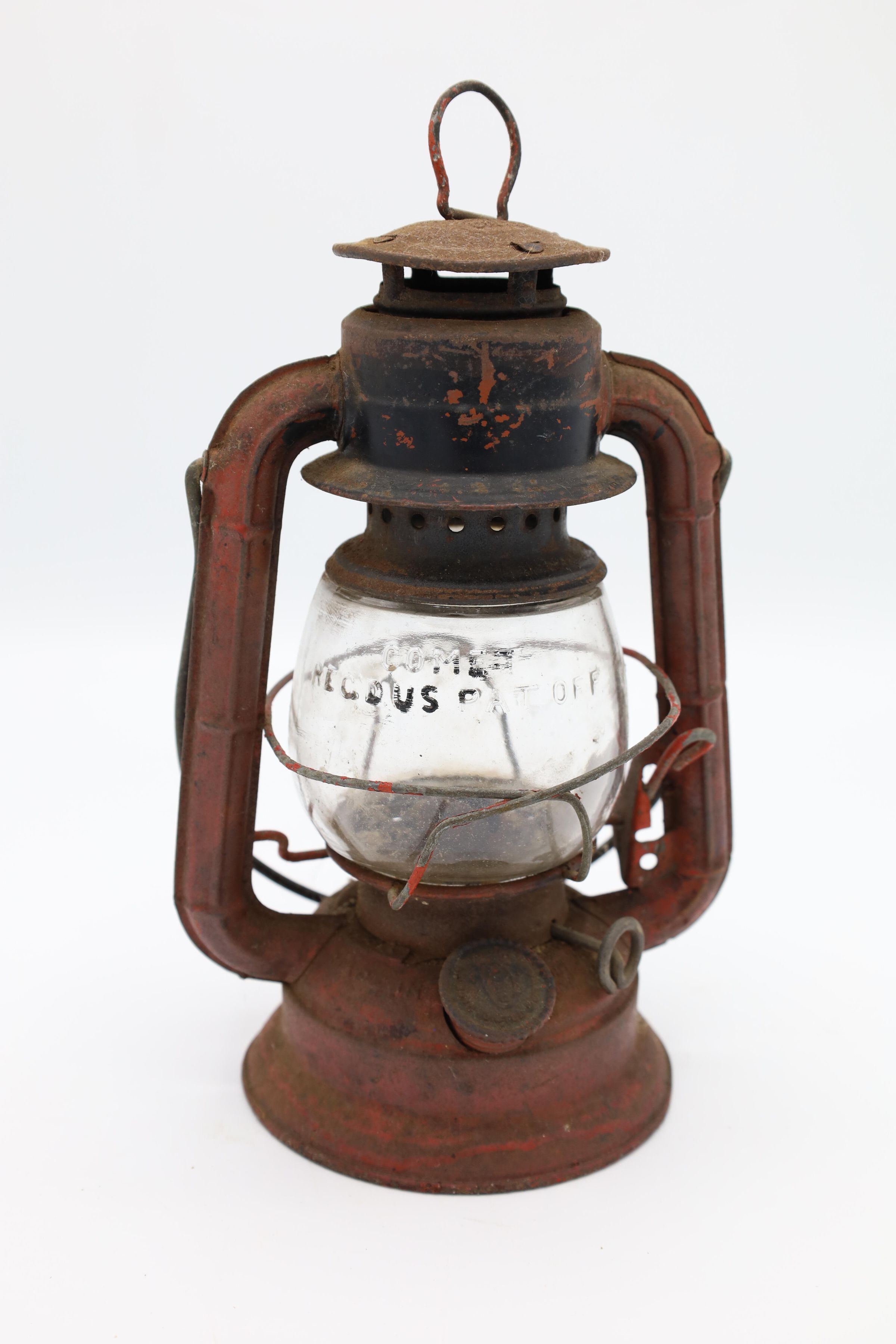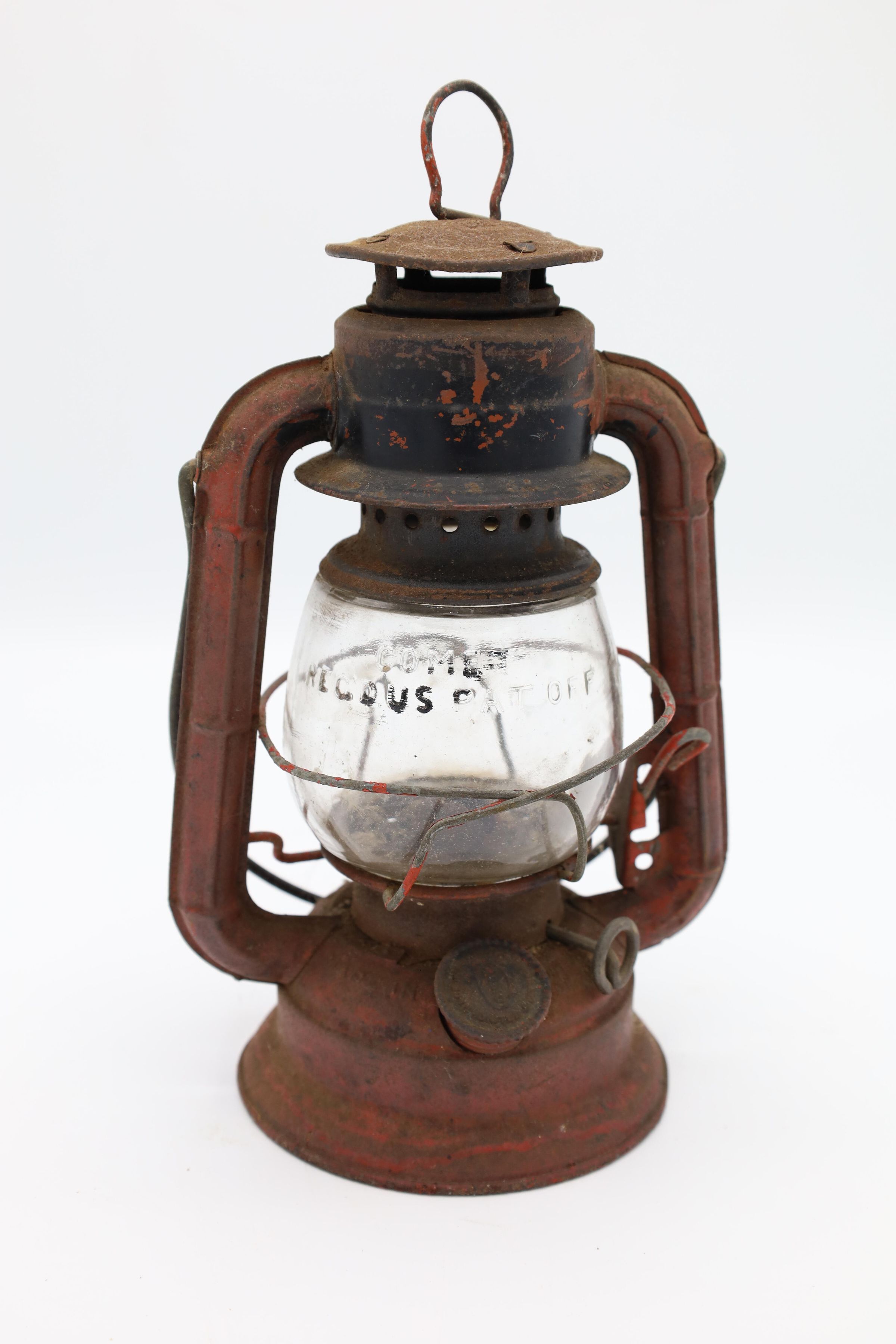 This Comet Red Dietz kerosene lantern is made out of tin, stands 8.5" tall, and weighs about 12 oz. Brass plates sit at the top and the bottom of this lantern. The production month and year is inscribed on Comet lanterns produced between 1915 and 1956. Although, it is difficult to read the date on this particular lantern, an S is visible to the right of the fuel cap indicating that it was produced in the Syracuse factory.