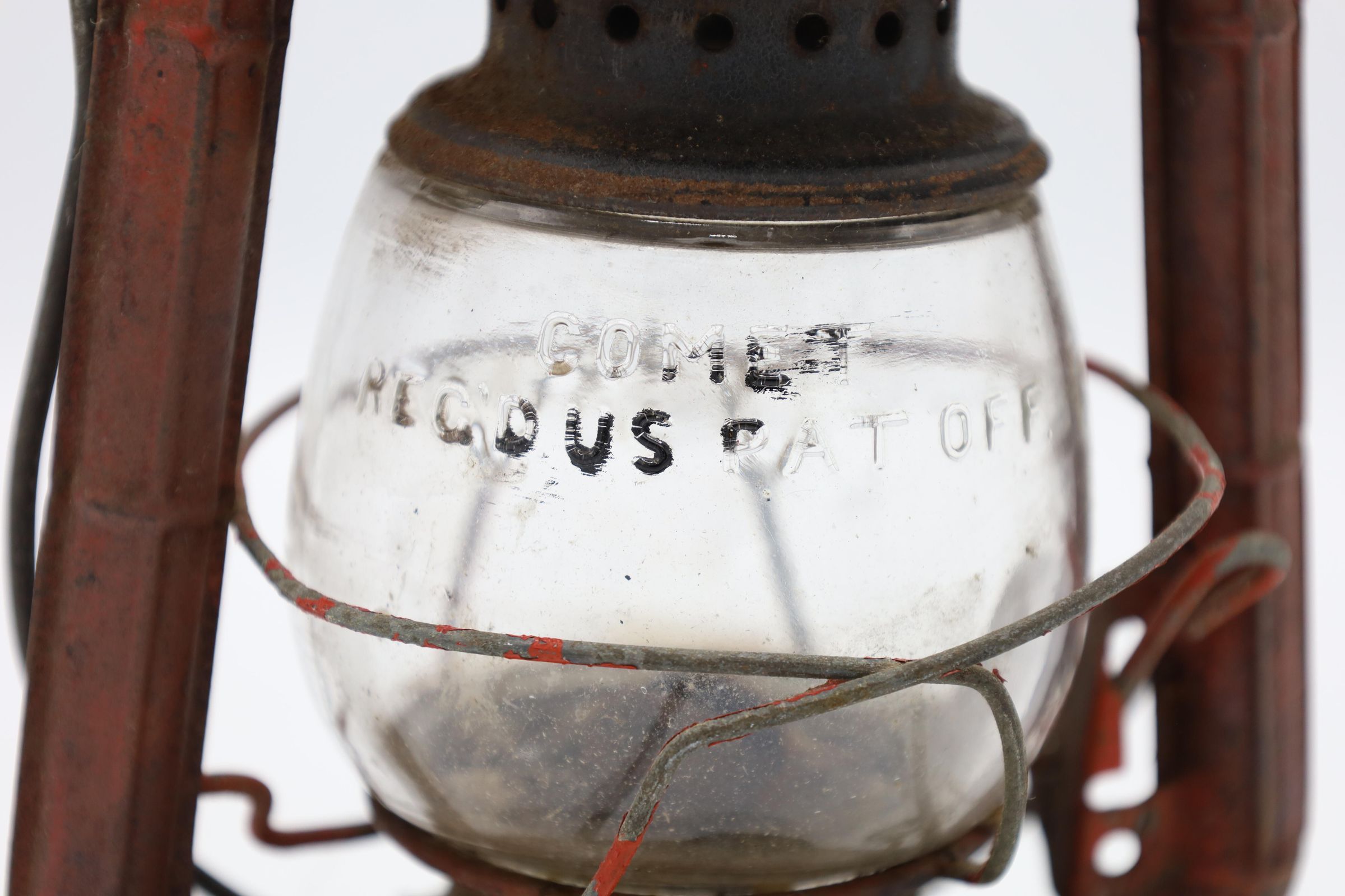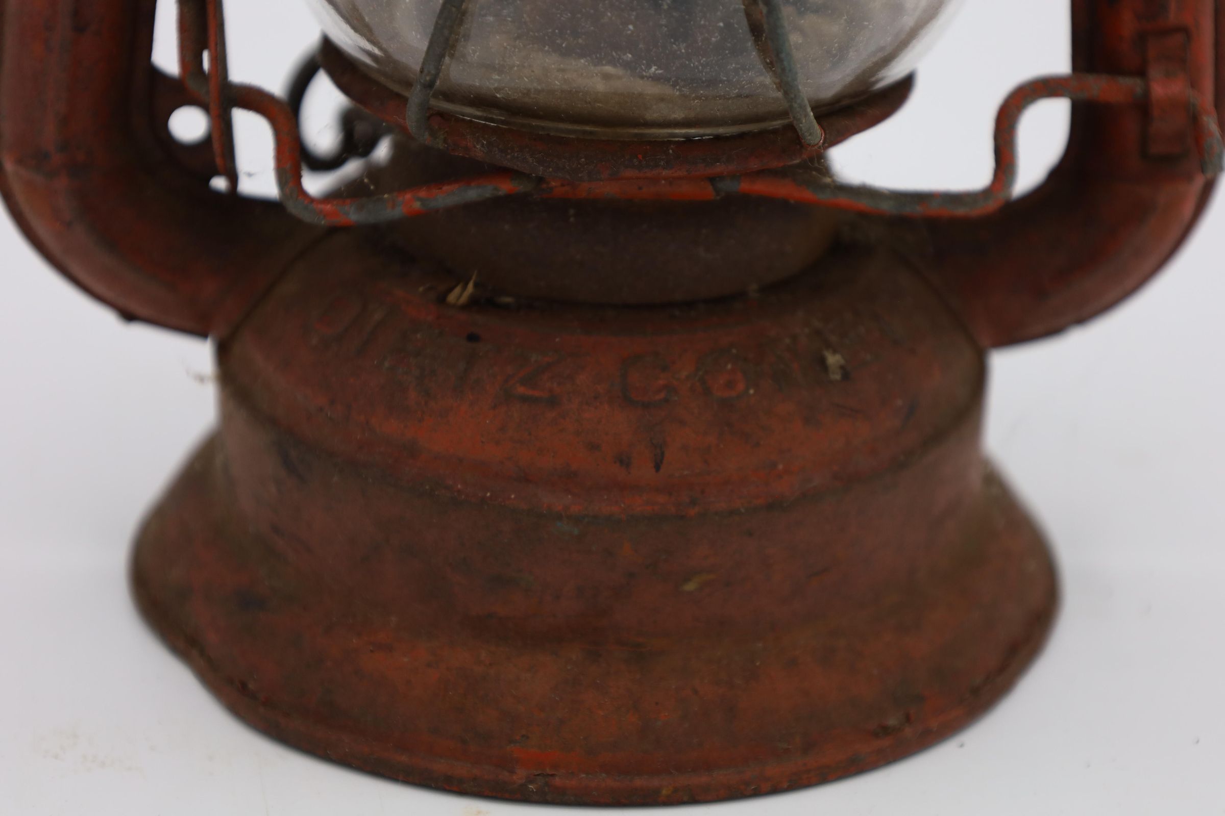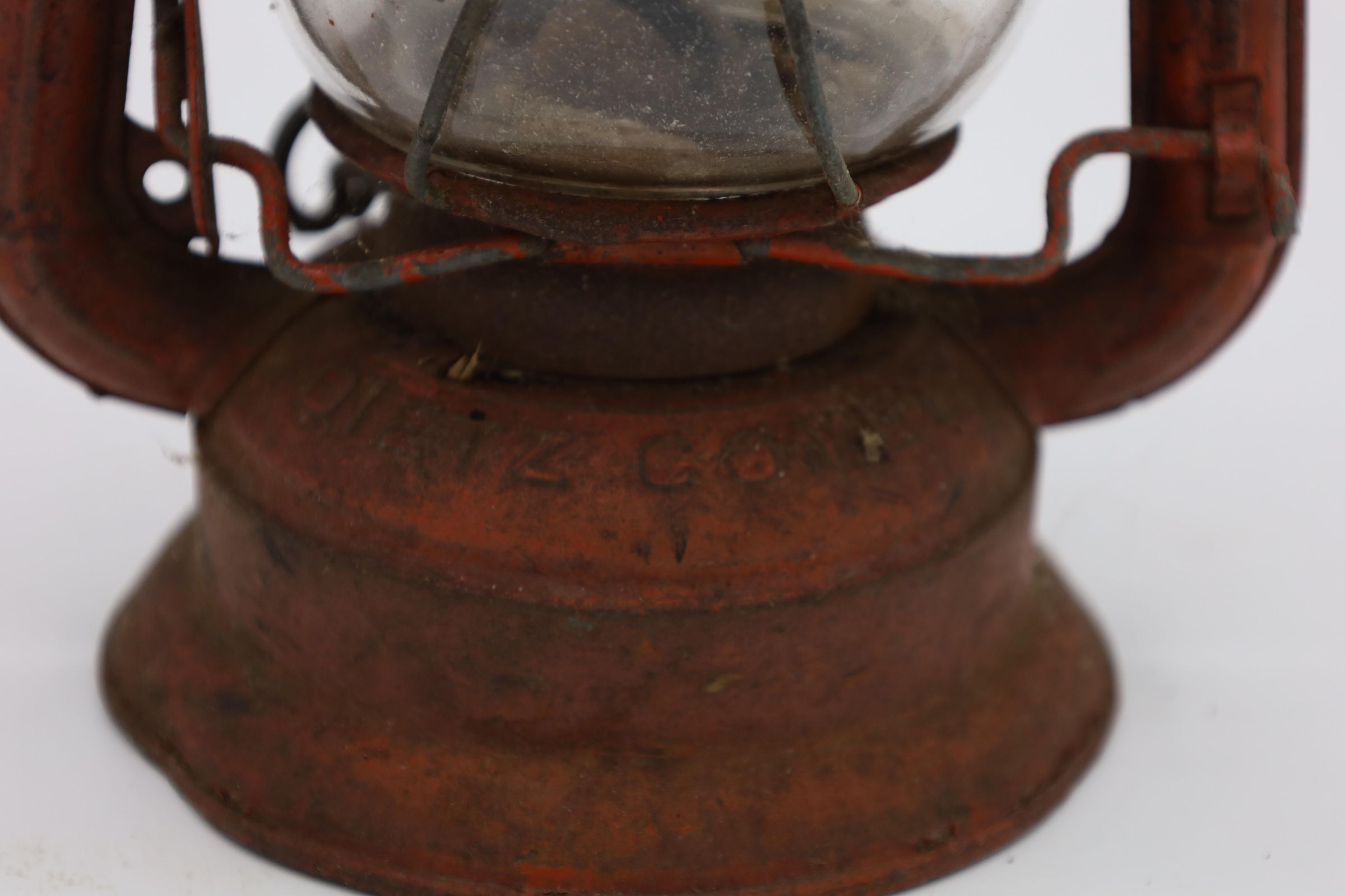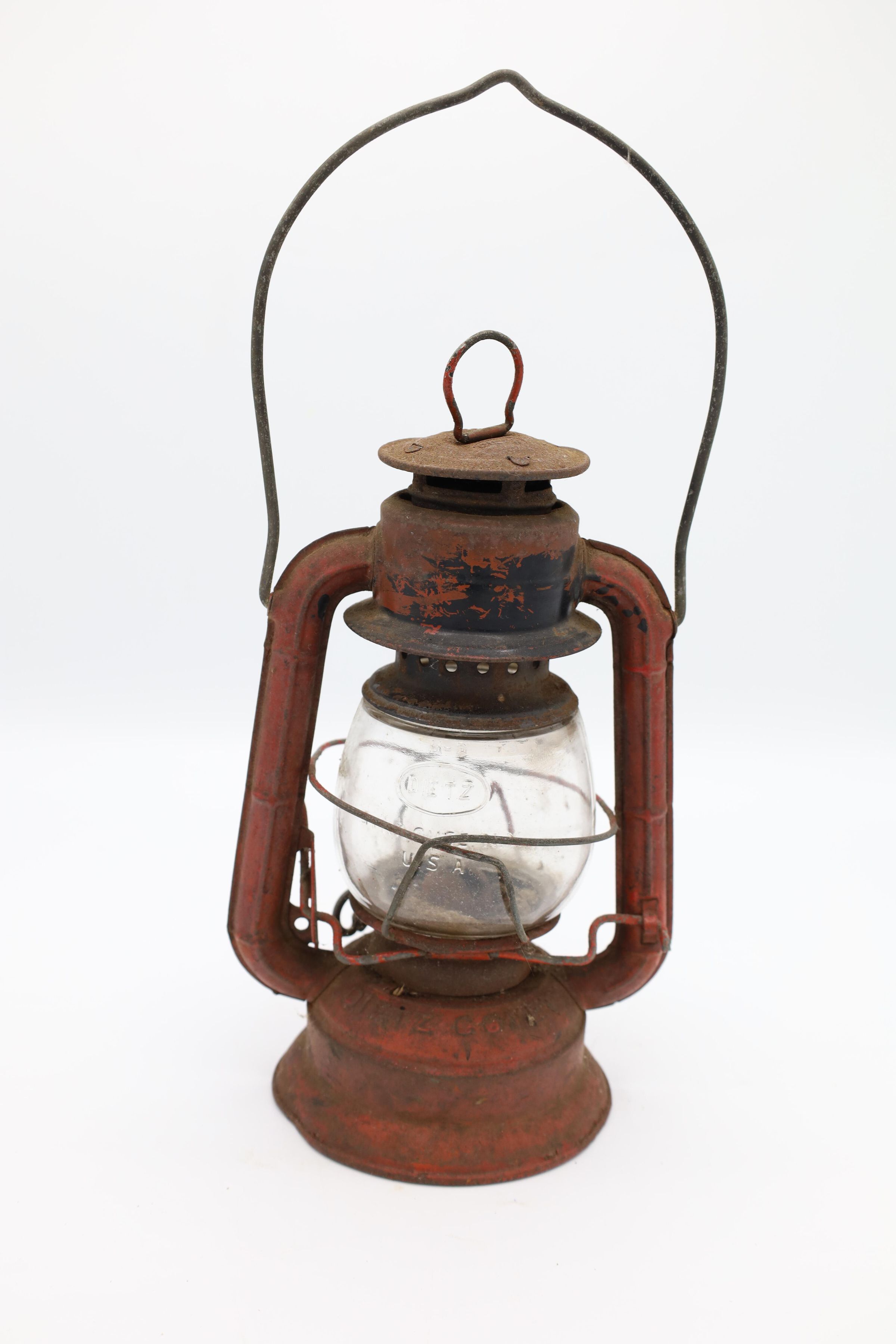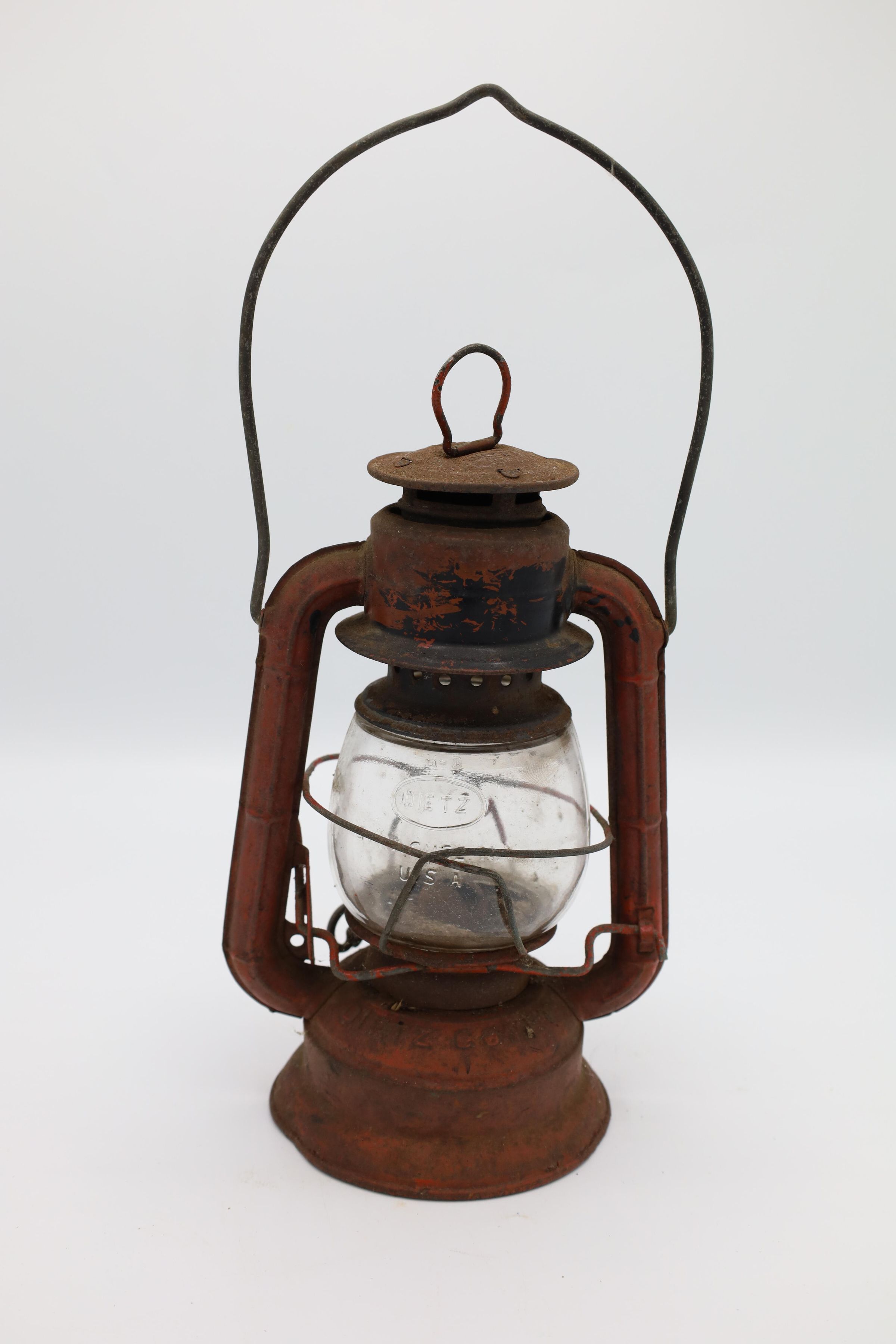 This Comet Red Dietz kerosene lantern is made out of tin, stands 8.5" tall, and weighs about 12 oz. Brass plates sit at the top and the bottom of this lantern. The production month and year is inscribed on Comet lanterns produced between 1915 and 1956. Although, it is difficult to read the date on this particular lantern, an S is visible to the right of the fuel cap indicating that it was produced in the Syracuse factory.