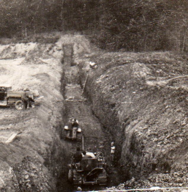 Civilian Conservation Corps (CCC) enrollees from Company 503 at Camp Pike dig the ditch to lay the foundation for Pike Like Dam. Many workers gained experience with heavy equipment during their time in the CCC. In this photograph, two bulldozers remove earth from this large trench.