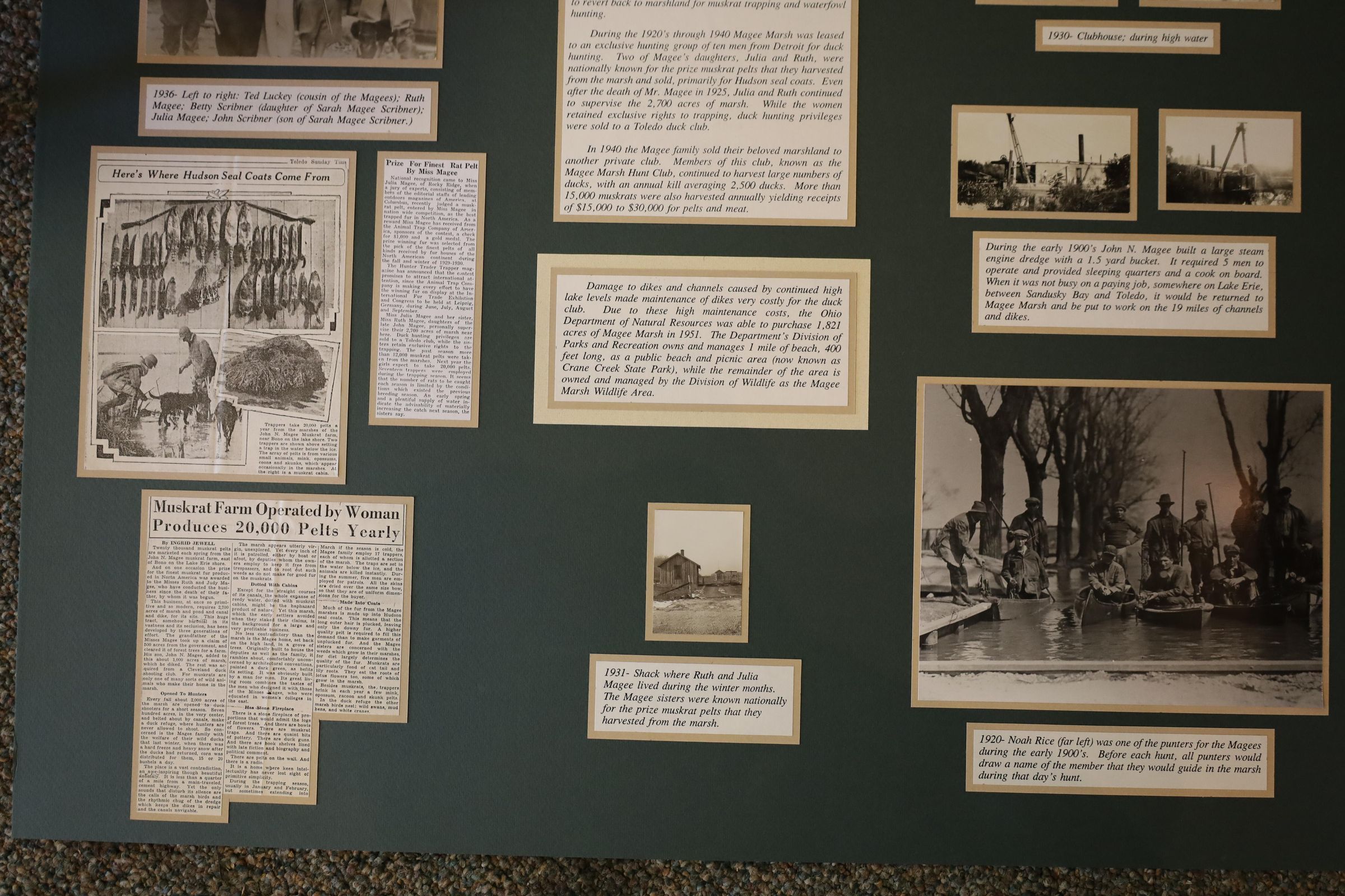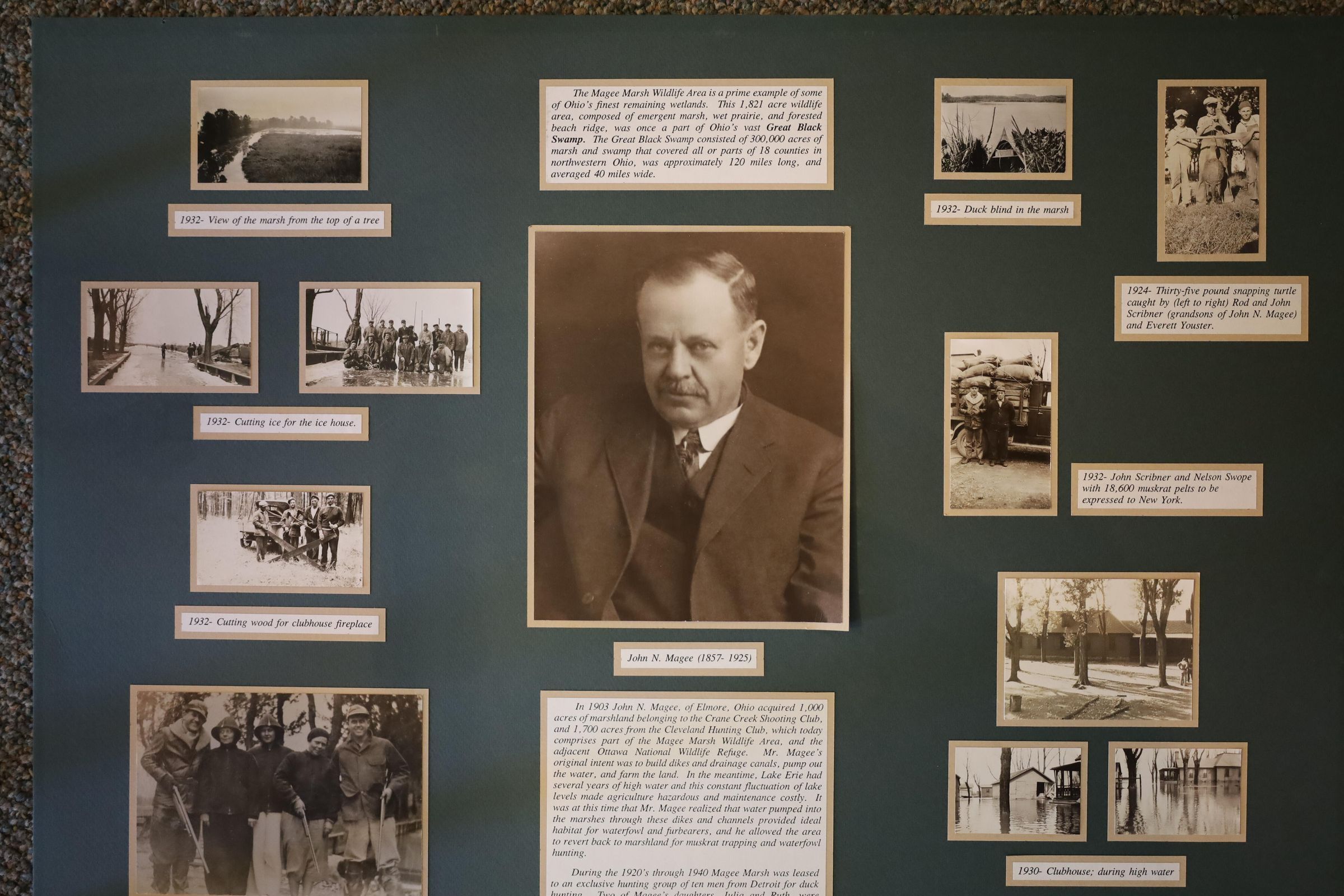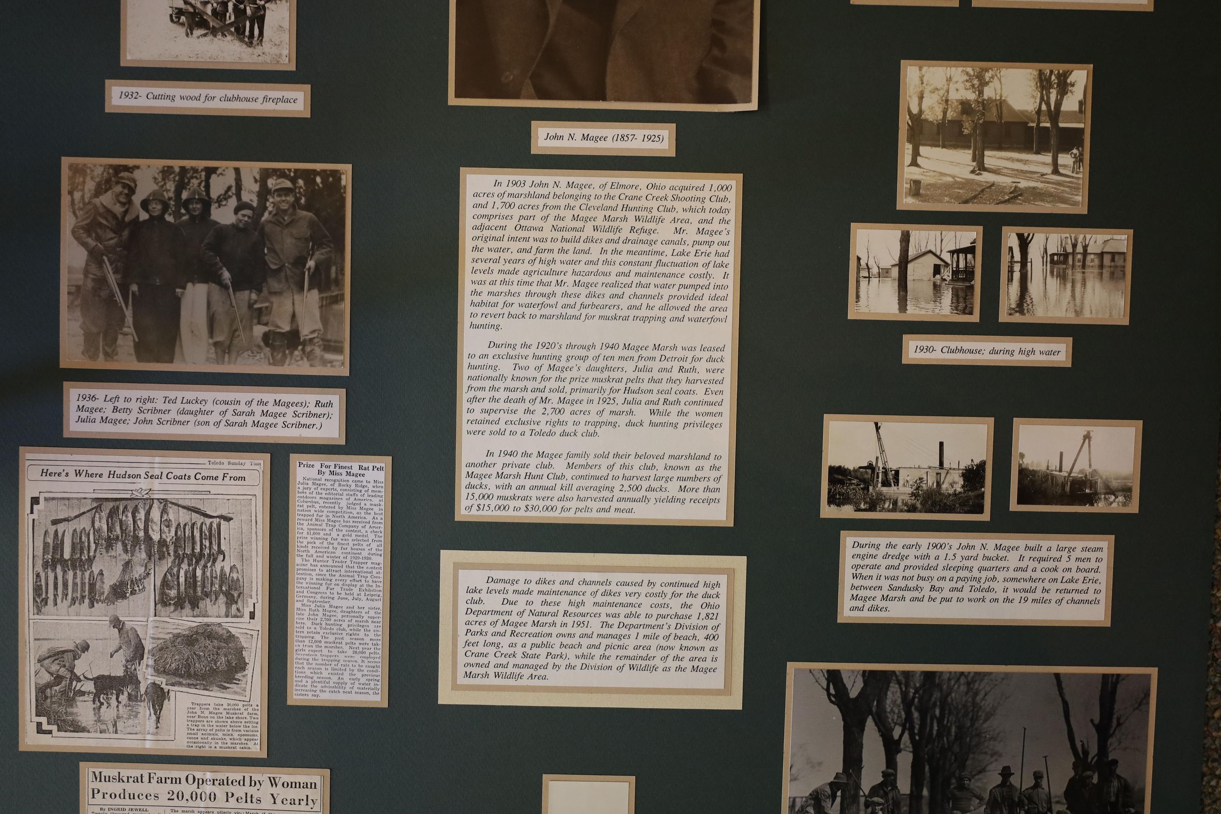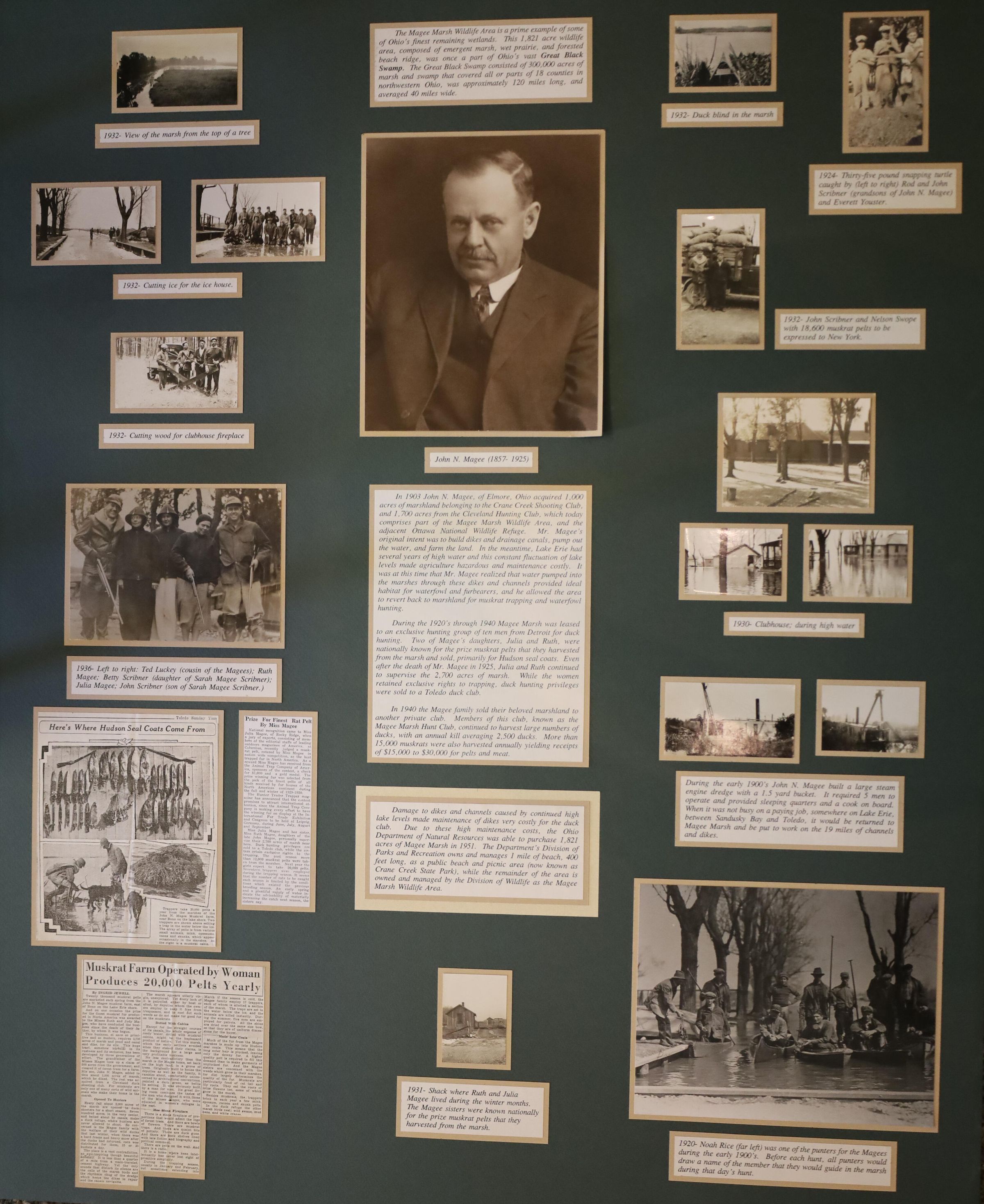 This display features historical photos, newspaper clippings, and information about John N. Magee and Magee Marsh Wildlife Area. Magee acquired the land that would become Magee Marsh Wildlife Area in 1903. Eventually, the Ohio Department of Natural Resources bought the land from the Magee Marsh Hunt Club.Collection