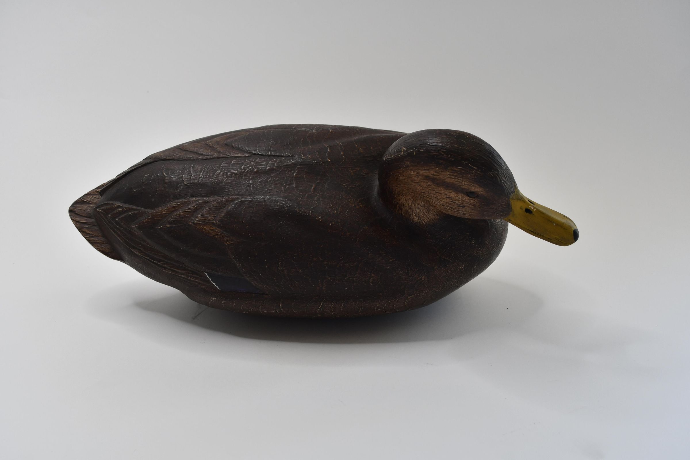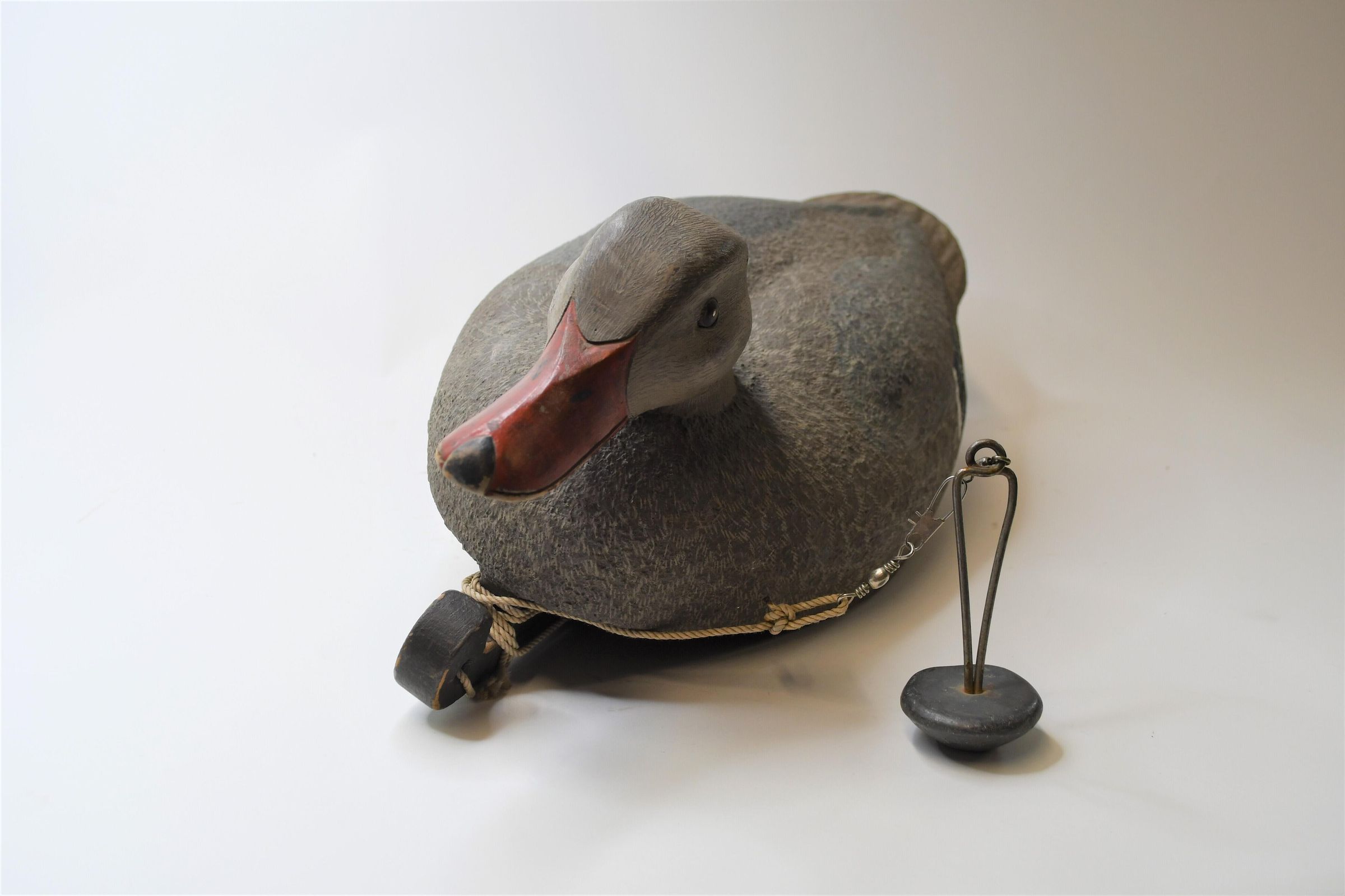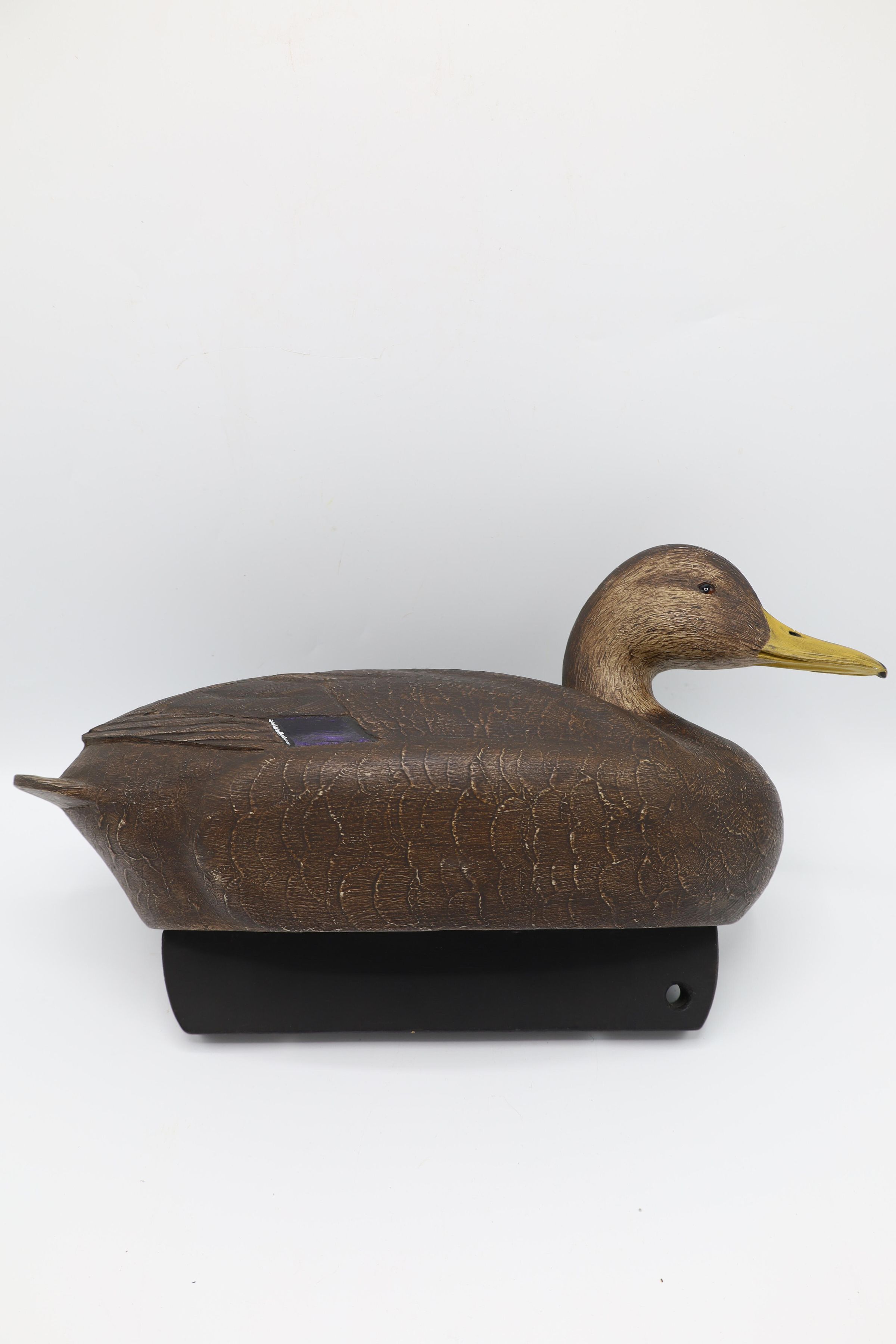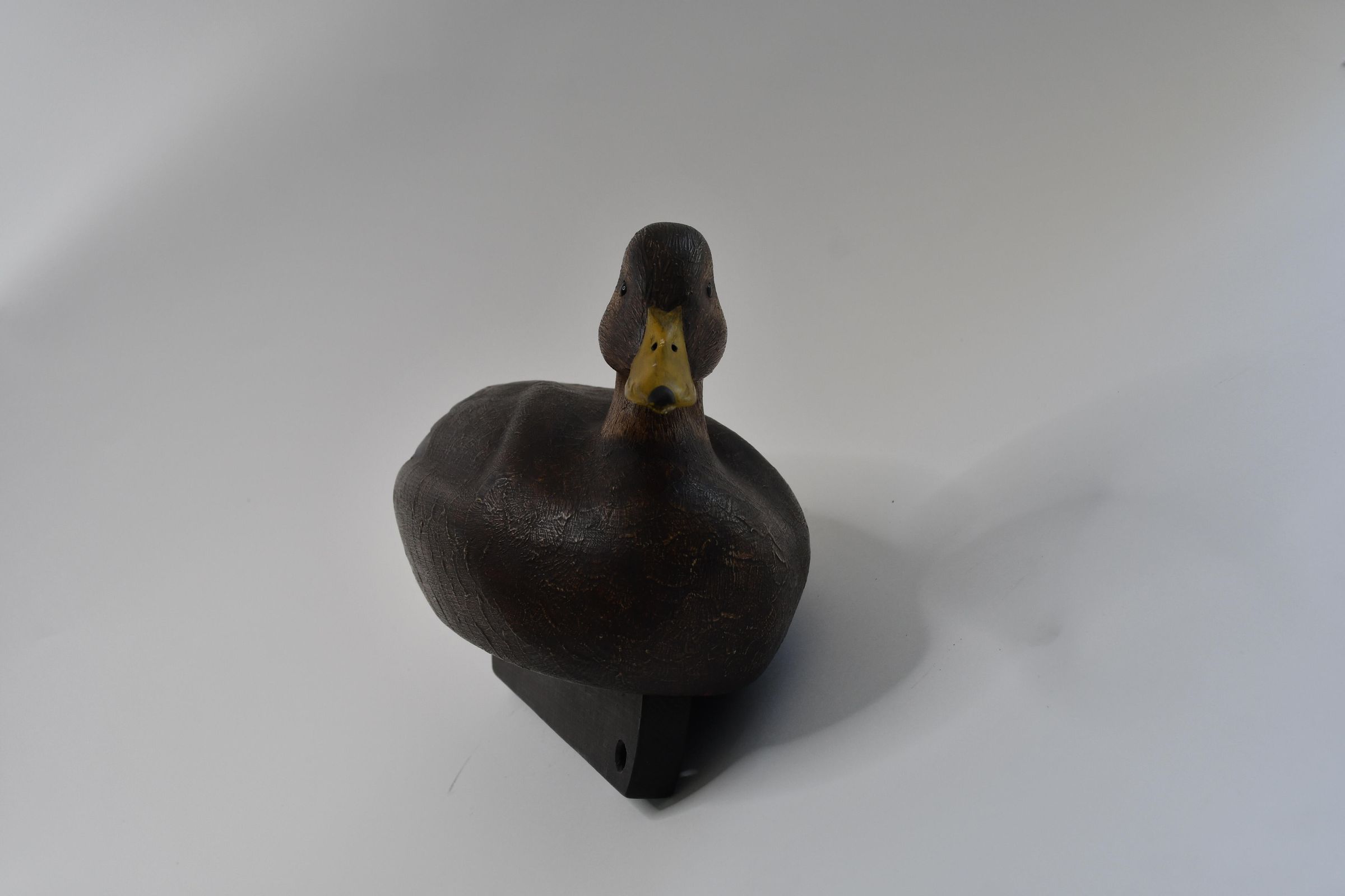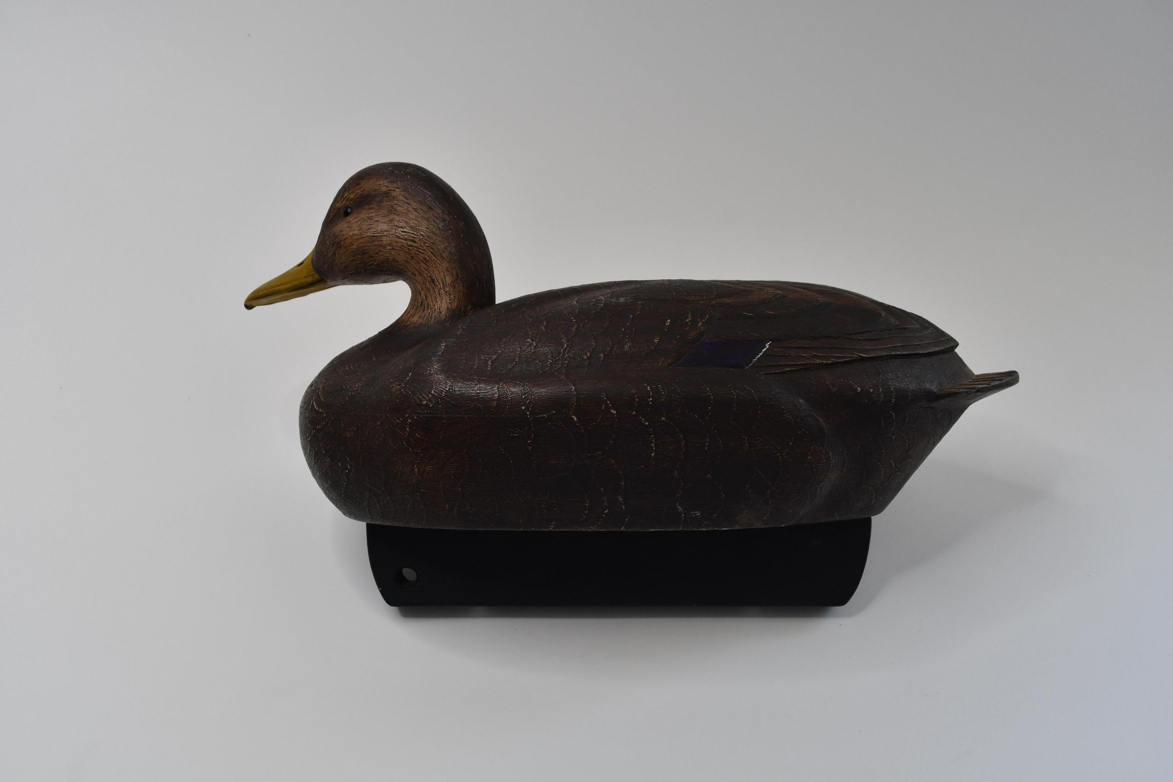 The final step of making a decoy is including the specific details of the bird. The artist will burn or carve in the finer feather details, such as that around the head. The artist will also paint the bird to match its natural coloration. The level of detail that occurs here depends on the artist's preference and the use of the decoy. For a decoy that is being made for hunting use, the details do not need to be as finely drawn. Art pieces or collectible decoys will be much more detailed in an attempt to recreate the bird in nature. While highly realistic and detailed, this example is for hunting use, as indicated by the keel on the bottom.Collection