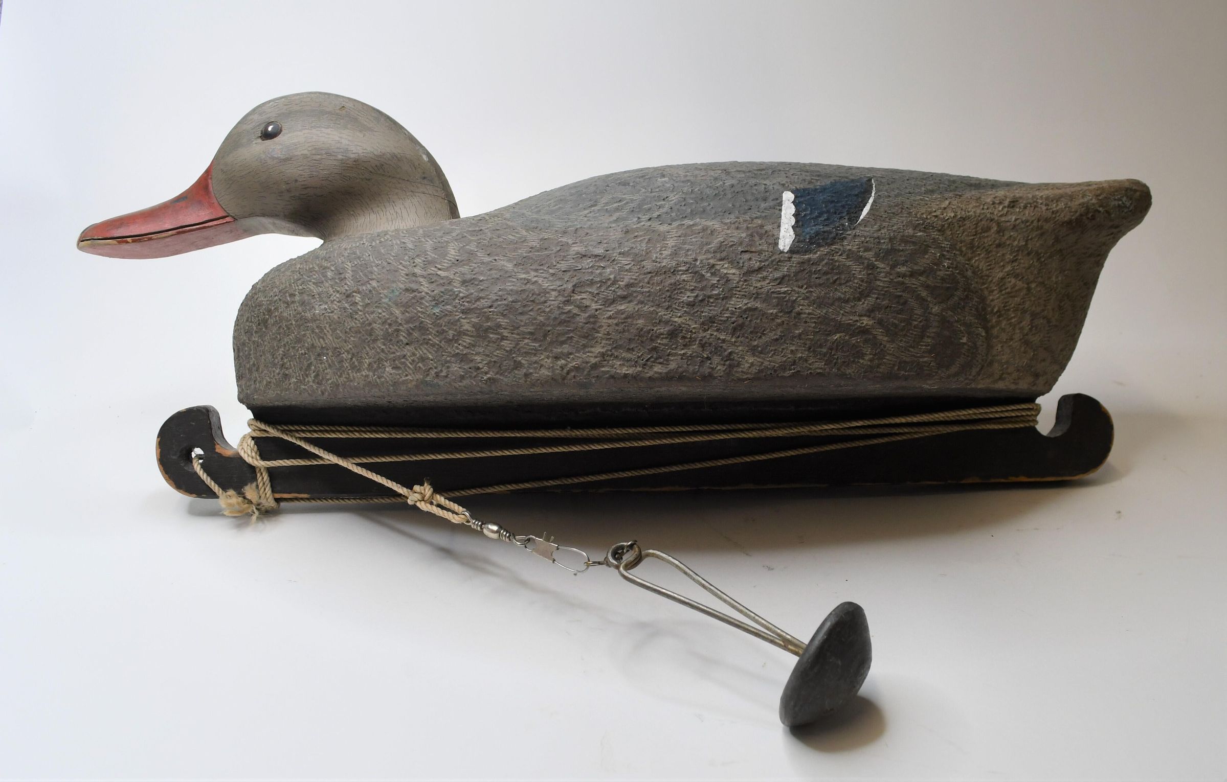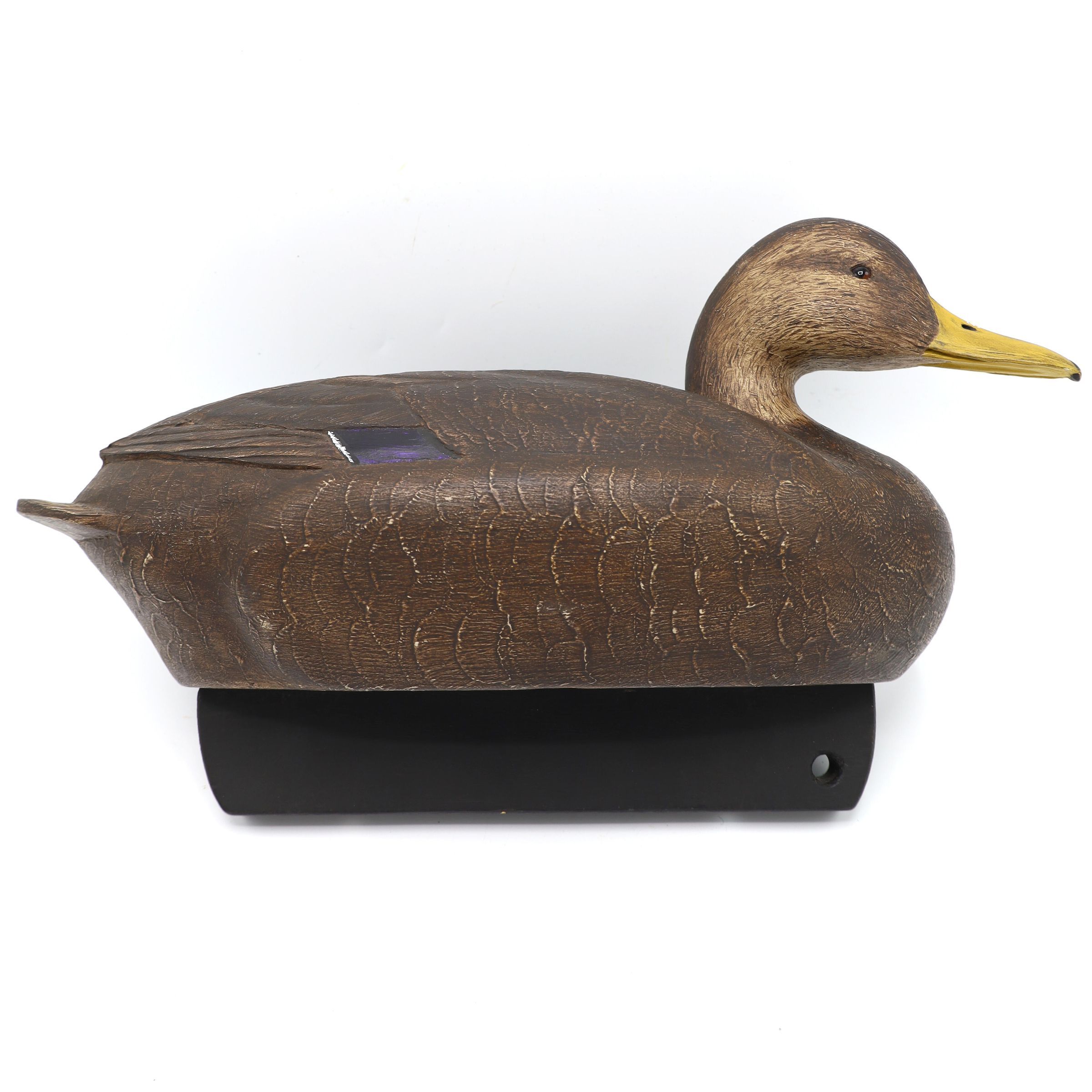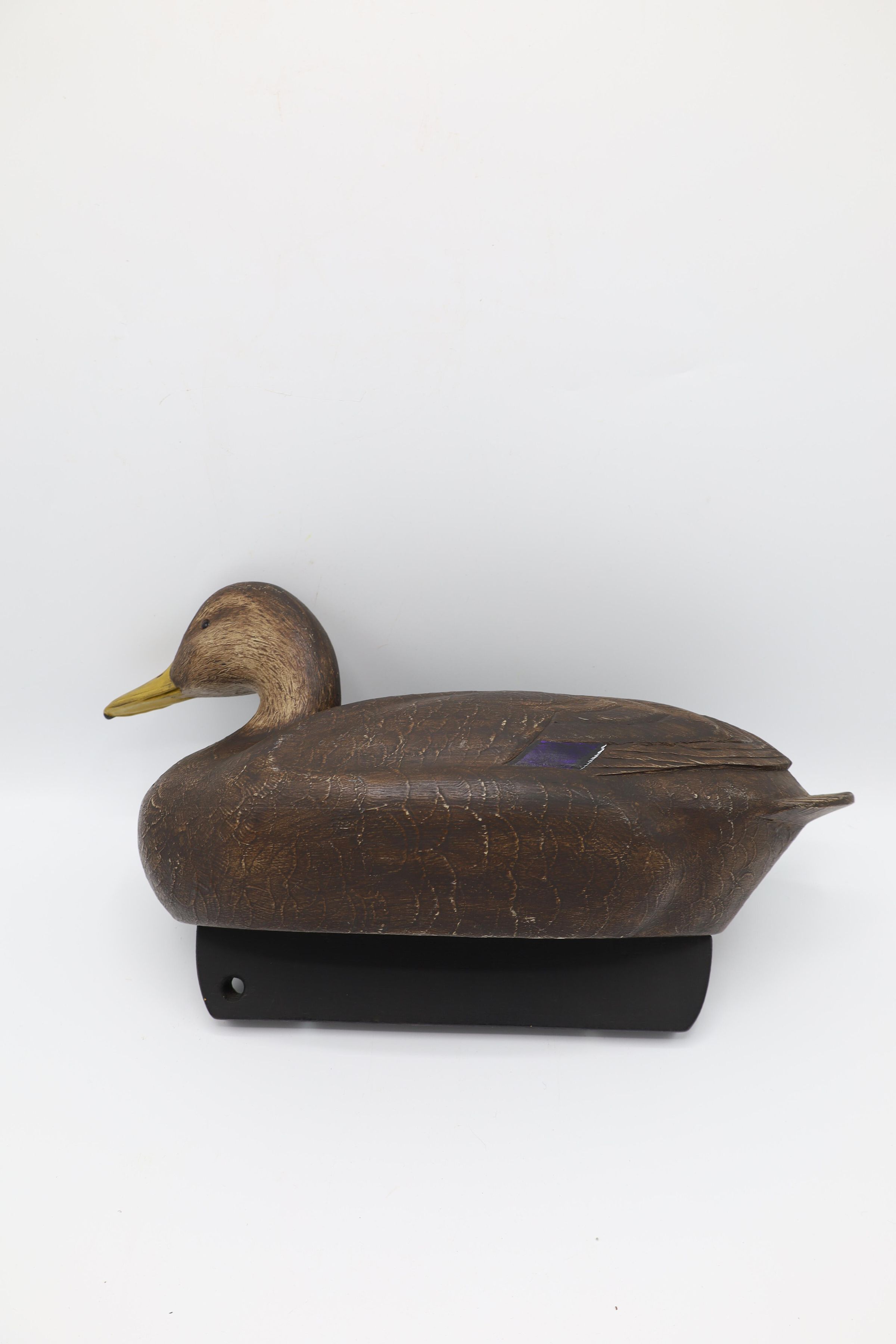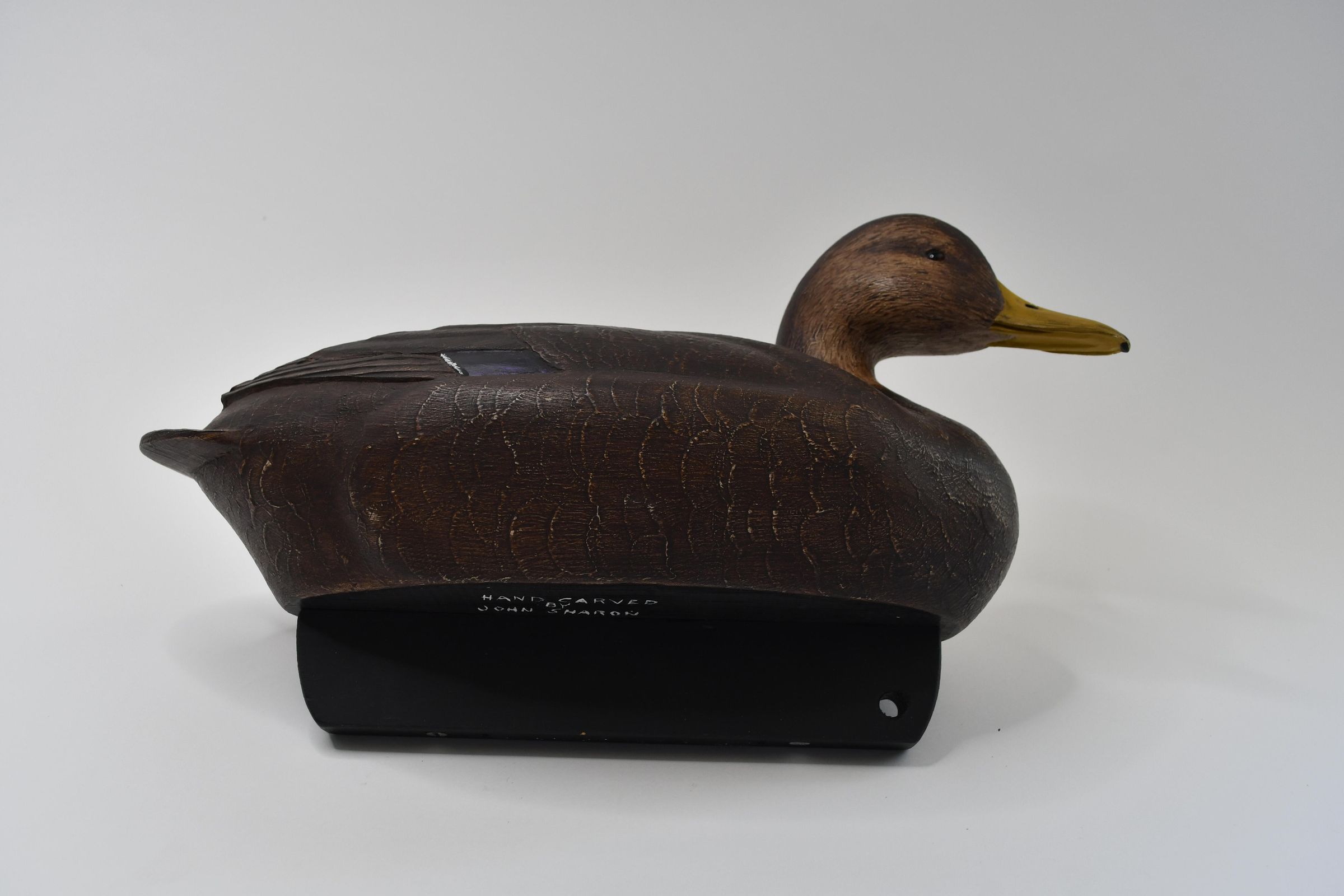 The final step of making a decoy is including the specific details of the bird. The artist will burn or carve in the finer feather details, such as that around the head. The artist will also paint the bird to match its natural coloration. The level of detail that occurs here depends on the artist's preference and the use of the decoy. For a decoy that is being made for hunting use, the details do not need to be as finely drawn. Art pieces or collectible decoys will be much more detailed in an attempt to recreate the bird in nature. While highly realistic and detailed, this example is for hunting use, as indicated by the keel on the bottom.Collection