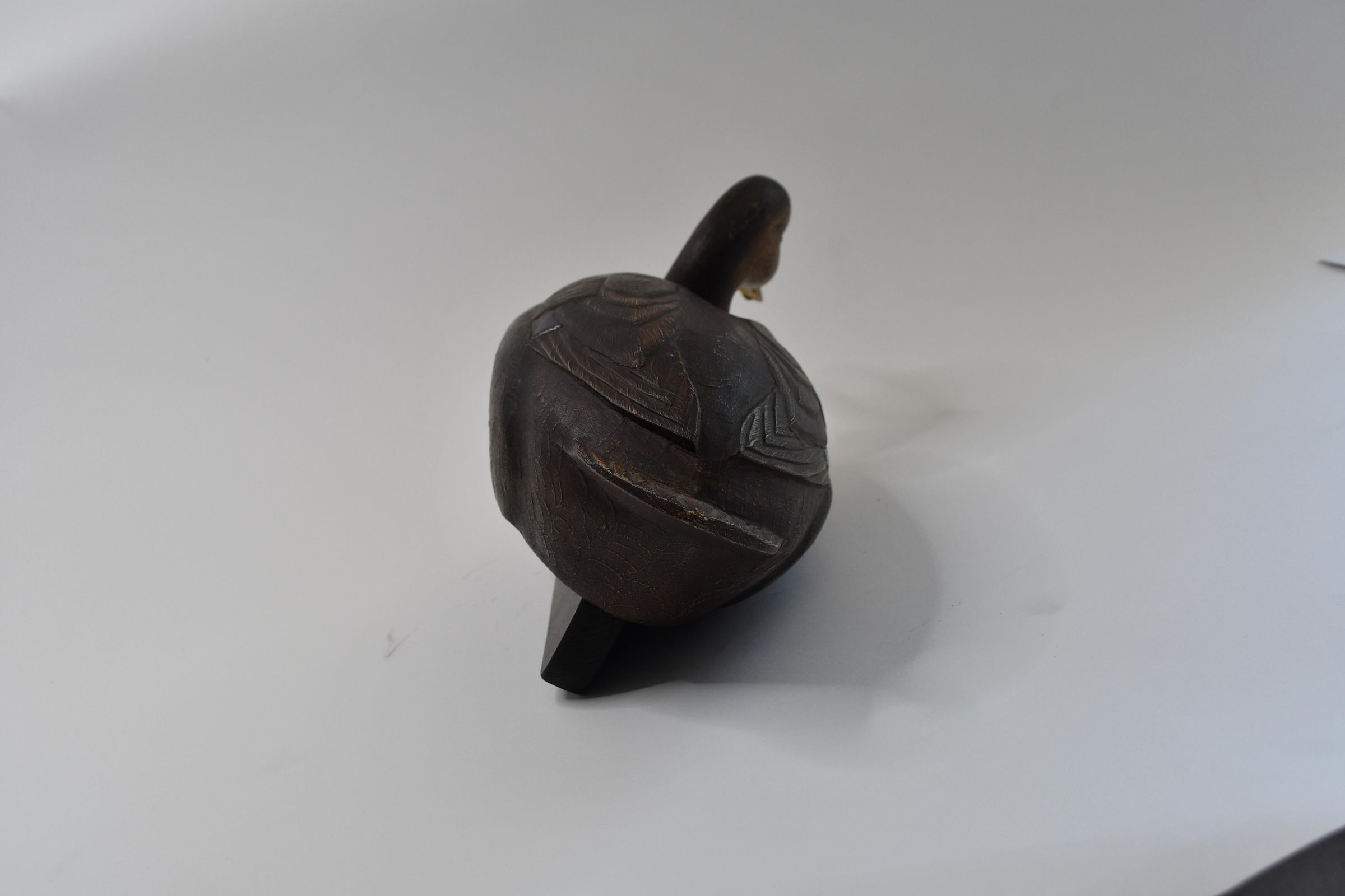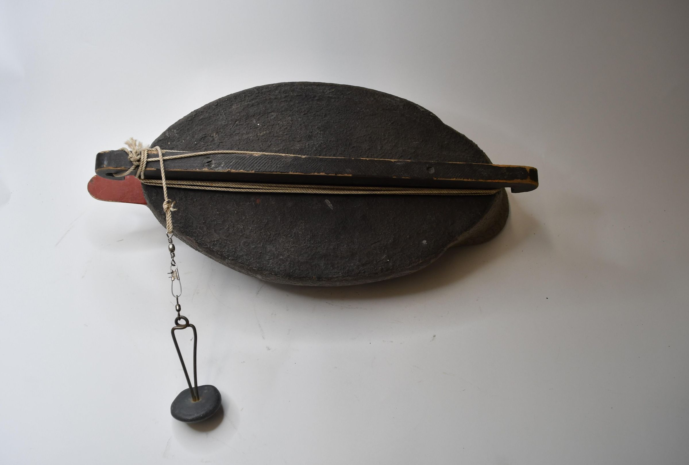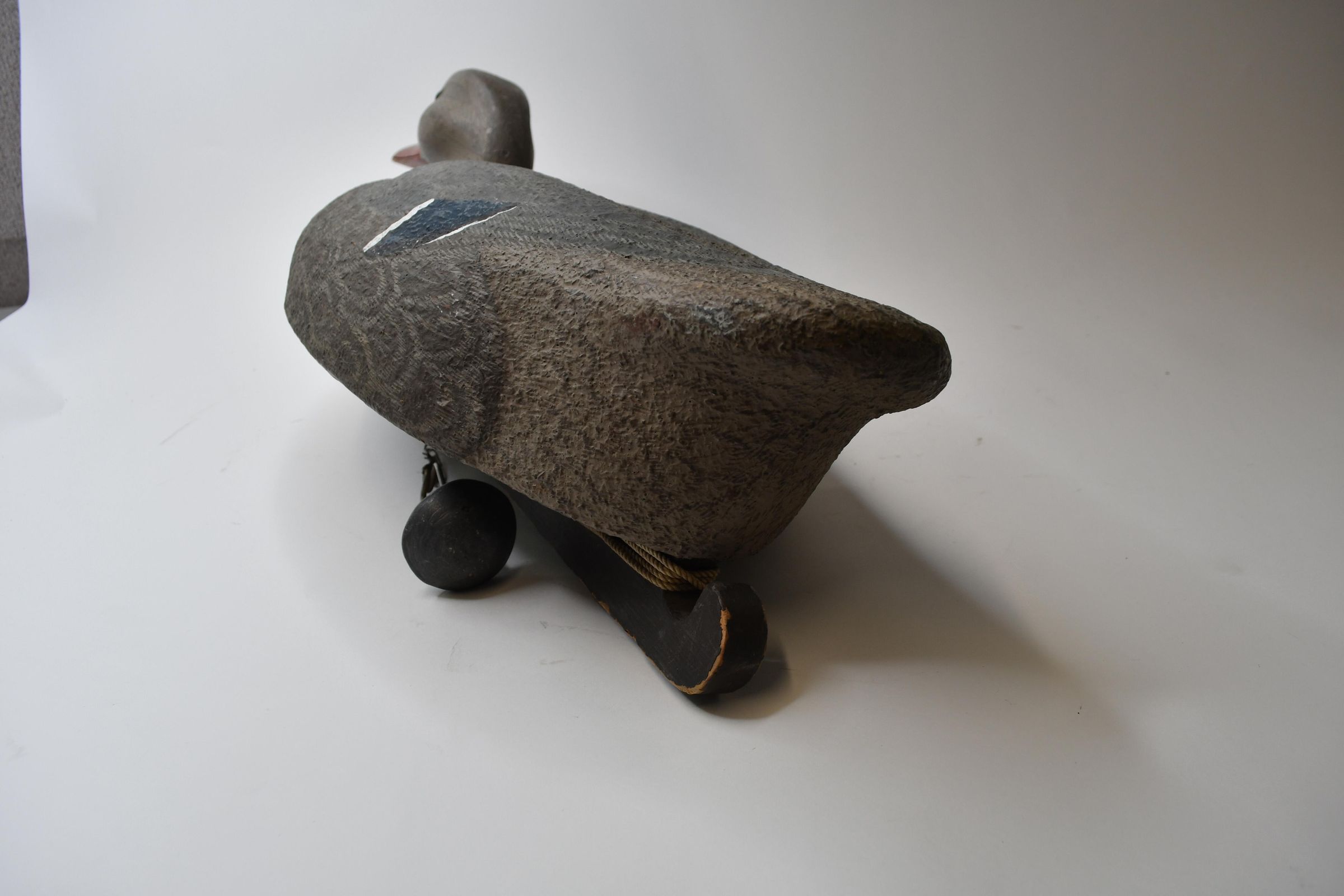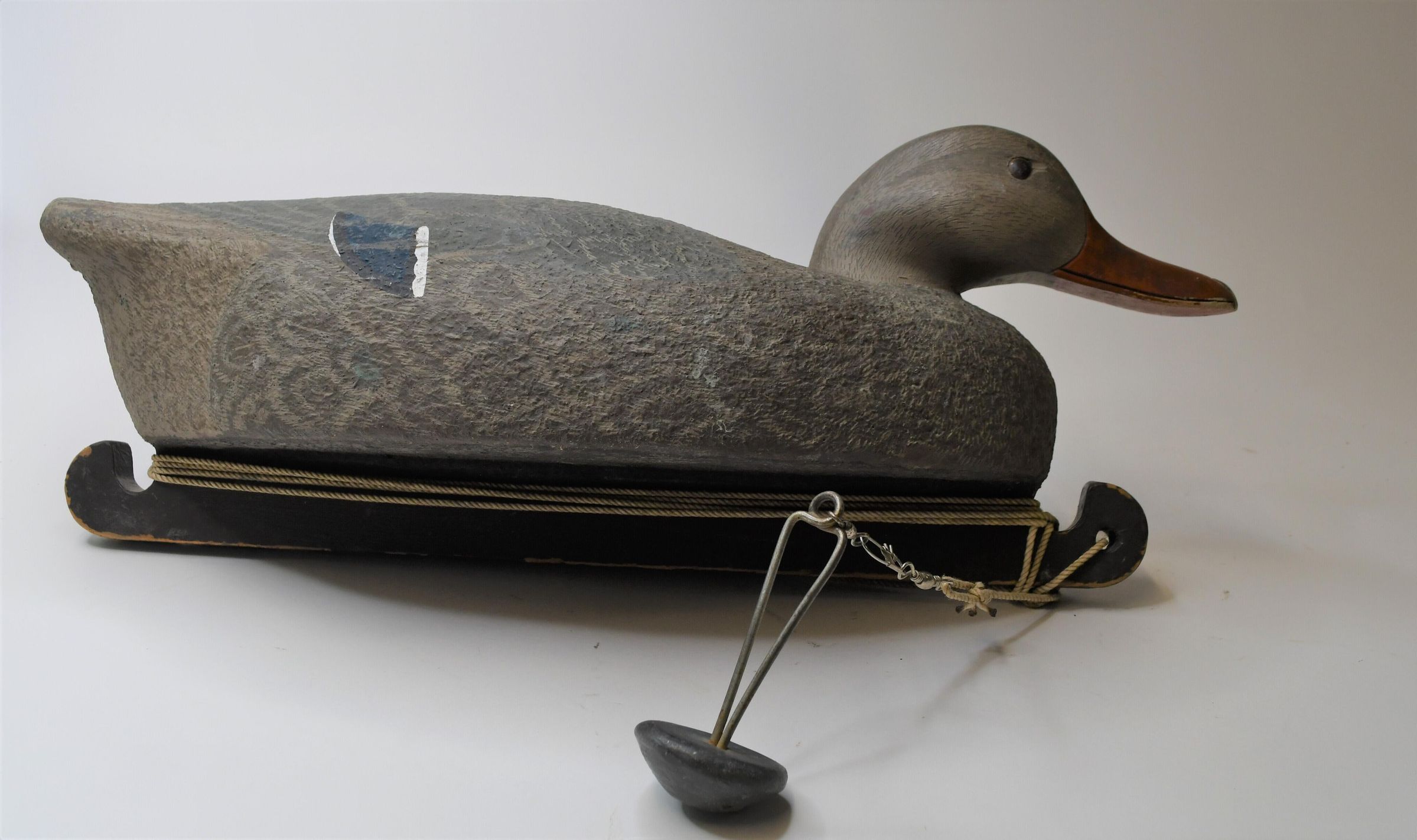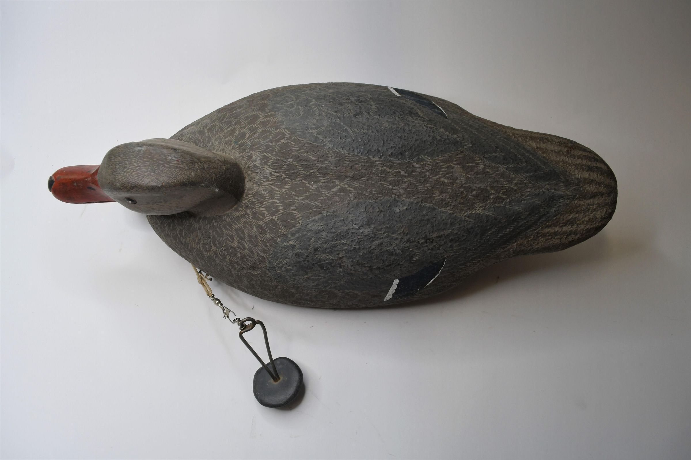 The final step of making a decoy is including the specific details of the bird. The artist will burn or carve in the finer feather details, such as that around the head. The artist will also paint the bird to match its natural coloration. The level of detail that occurs here depends on the artist's preference and the use of the decoy. For a decoy that is being made for hunting use, the details do not need to be as finely drawn. Art pieces or collectible decoys will be much more detailed in an attempt to recreate the bird in nature. While highly realistic and detailed, this example is for hunting use, as indicated by the keel on the bottom.Collection