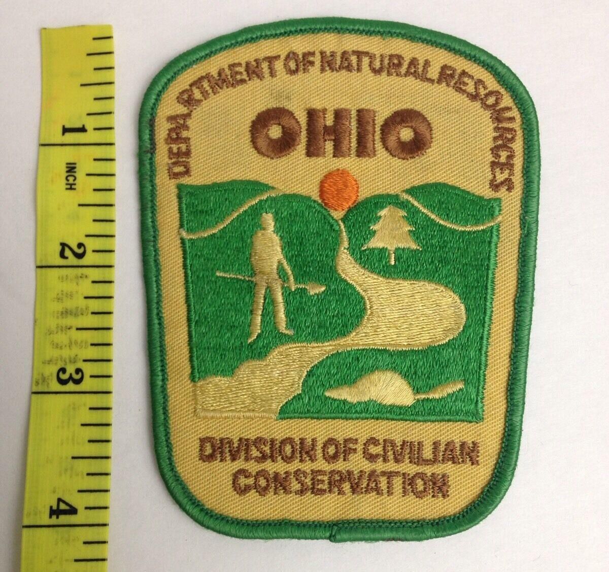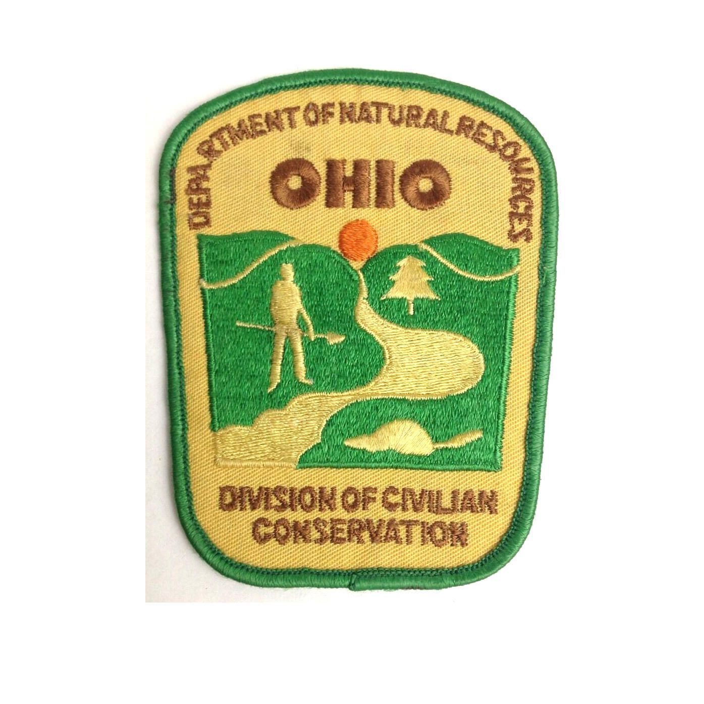 The Division of Civilian Conservation patch is 3-inch x 4-inch featuring a grass-green landscape with a river running down the middle of the scene and a figure holding a shovel standing beside it. The words Department of Natural Resources, Ohio, and Division of Civilian Conservation are all embroidered in brown. The patch is bordered in the same green as the central image.