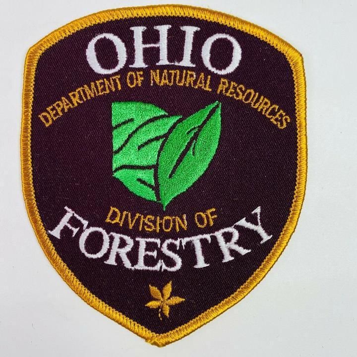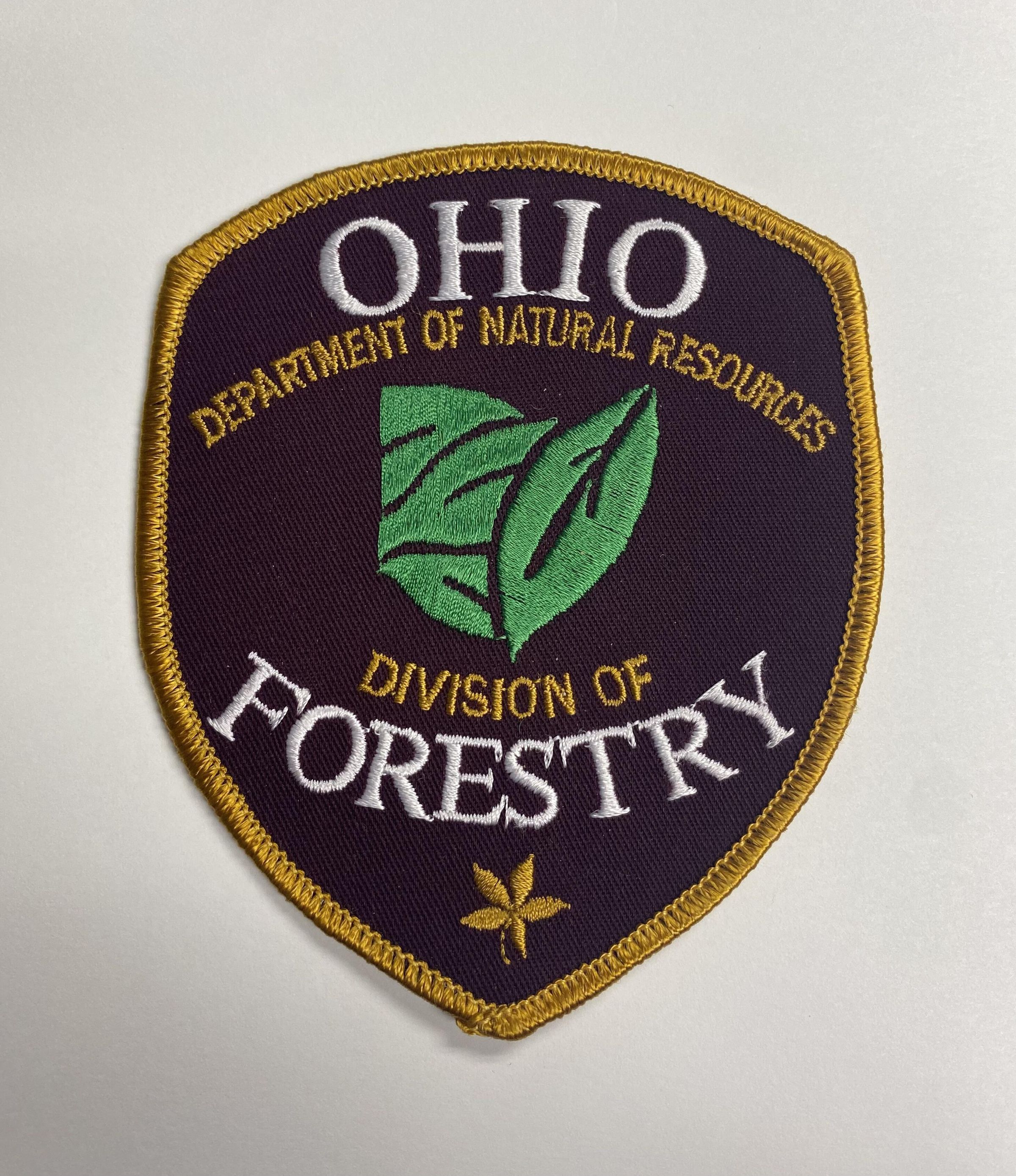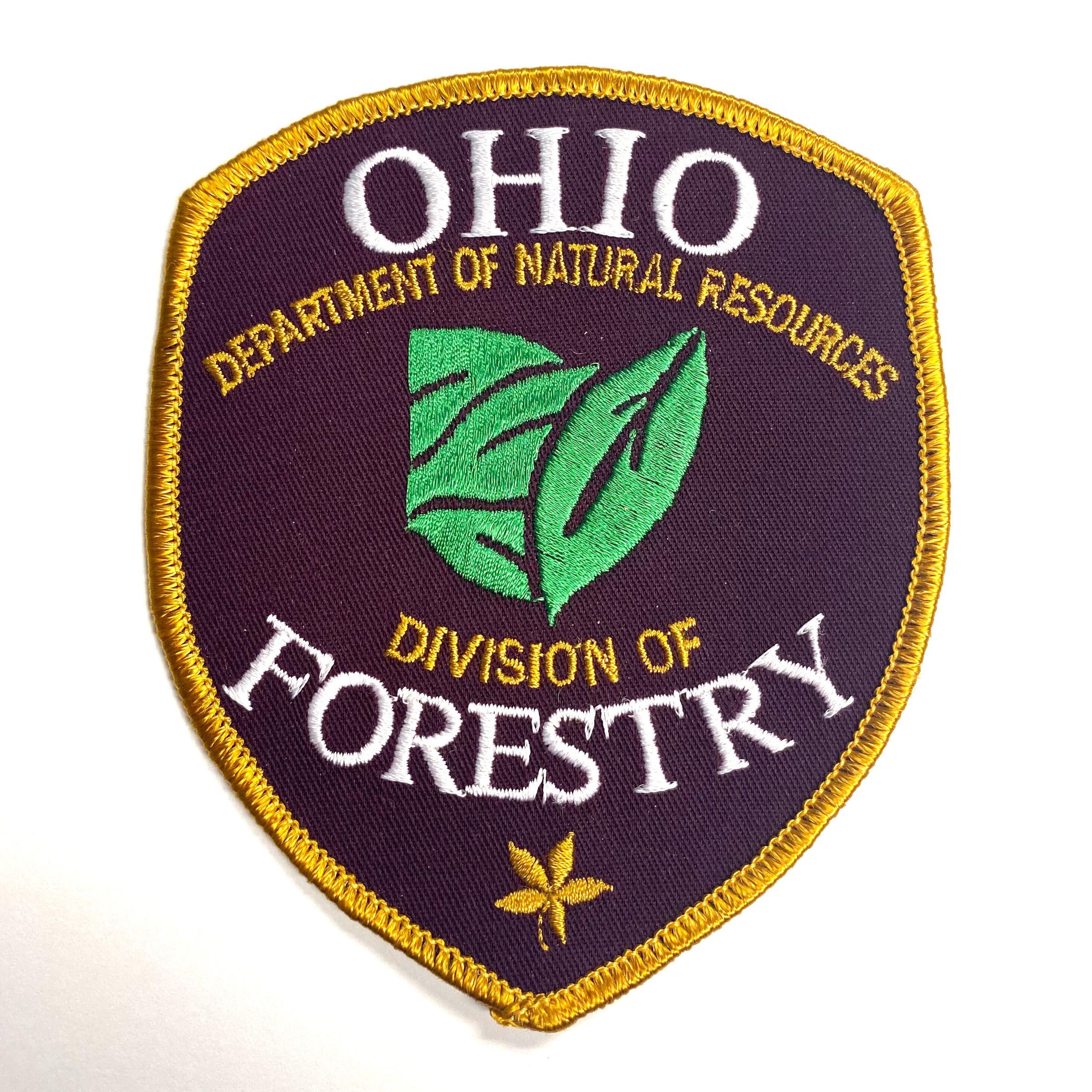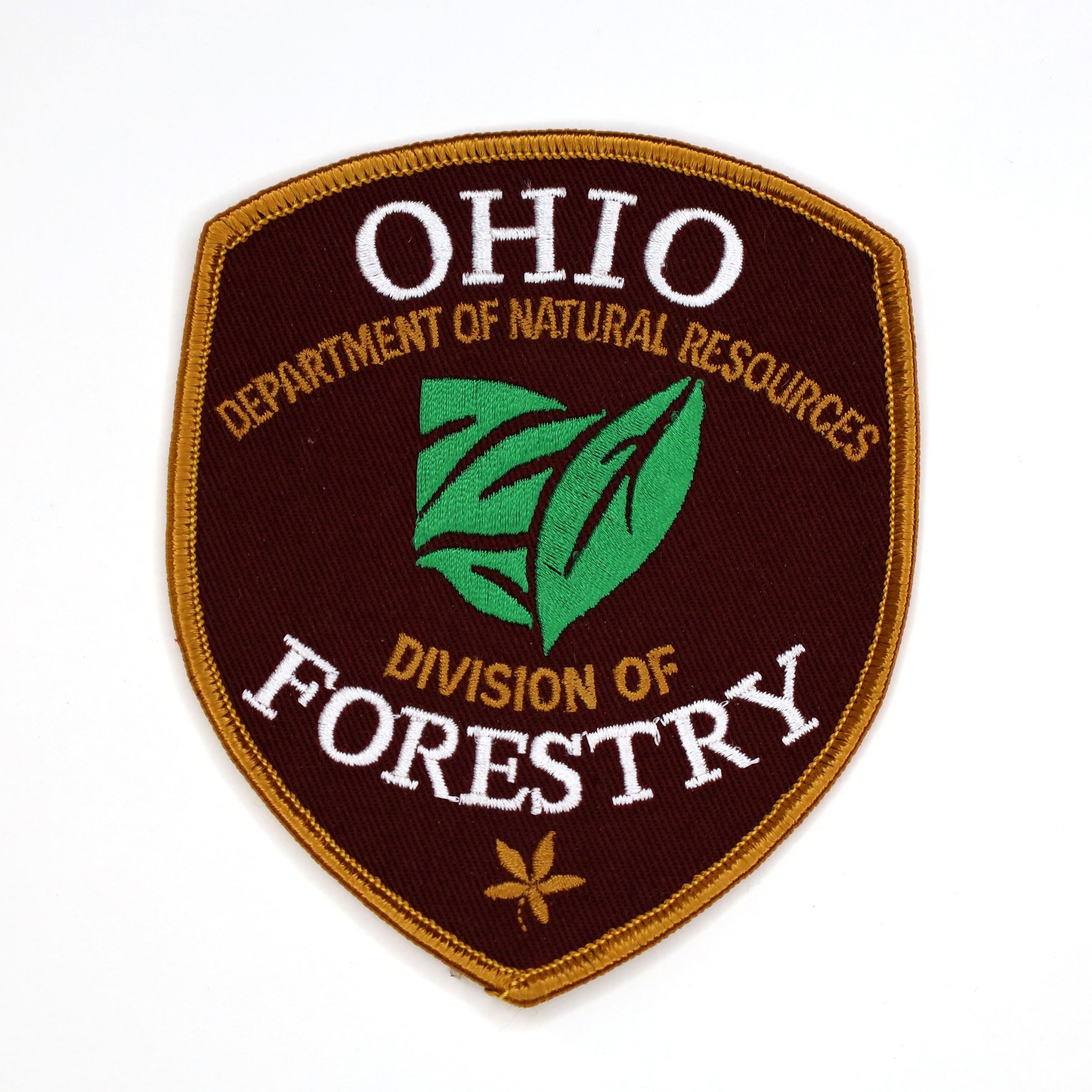 Division of Forestry embroidered patch is 3.5-inch x 4.25-inch (widest point) with two leaf designs, one in green and the other in a light brown color.
