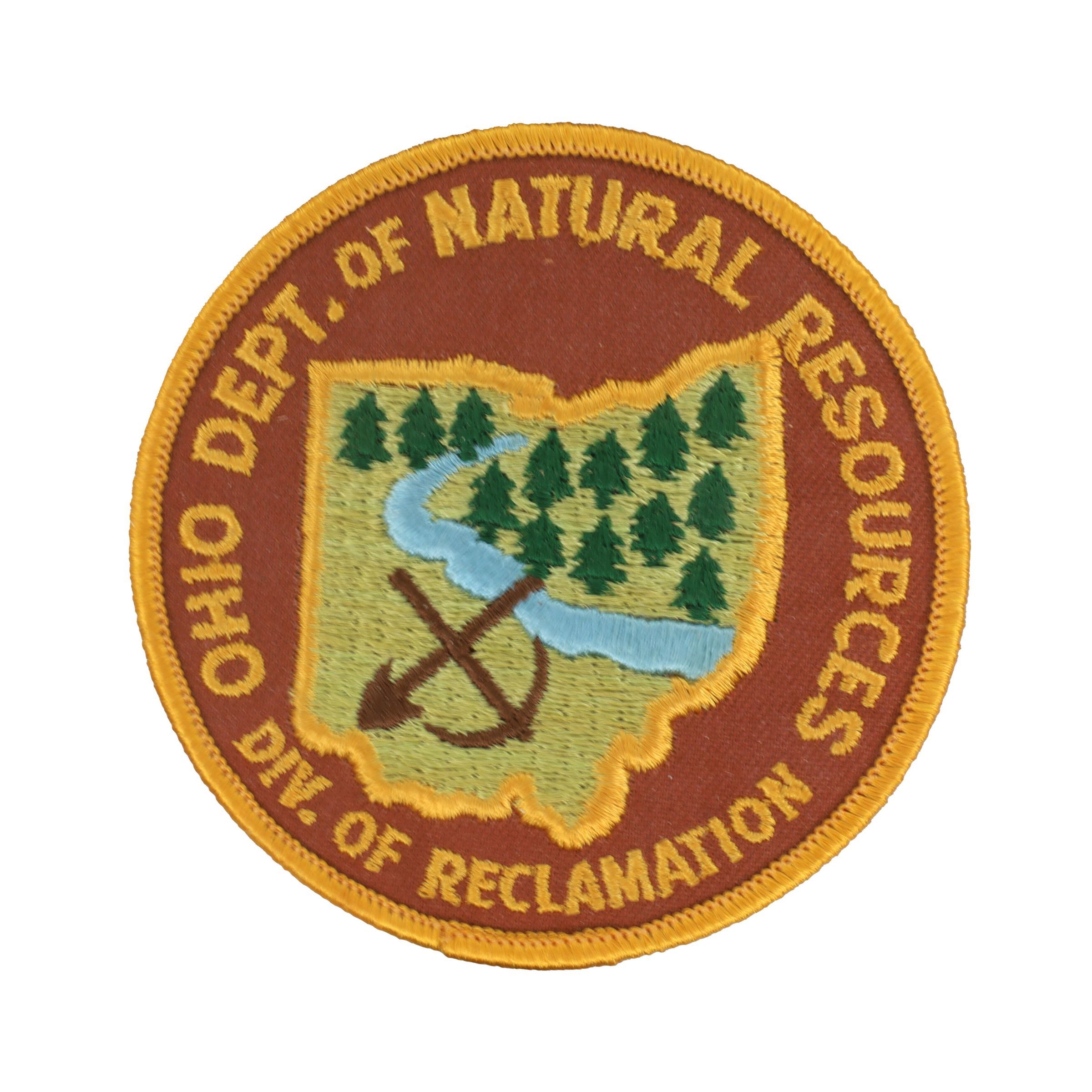 The center of this Division of Reclamation patch features a light green landscape, dark green forest trees, a blue flowing stream, and brown excavating tools within an Ohio State shape border. It is an embroidered 3-inch round patch with a red background and an orange border. Dept. of Natural Resources and Div. of Reclamation are embroidered in the same orange color around the edges.