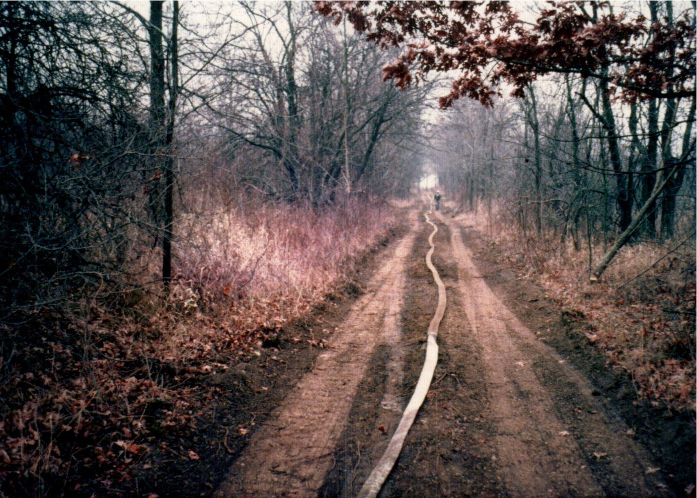 A firefighter pulls a firehouse down a dirt road surrounded by bare trees at Delaware State Park. The hose is perhaps being used to combat a wildfire or to extinguish a controlled burn.Cataloged By