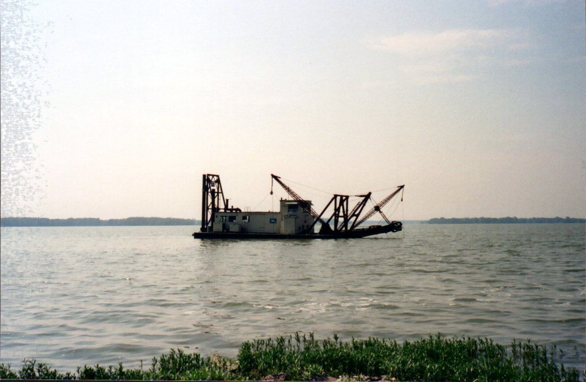 A dredge boat works on the open water of Indian Lake. Indian Lake is a manmade body of water and requires constant dredging to remove accumulating silt from the lakebed to remain in its current condition.Cataloged By