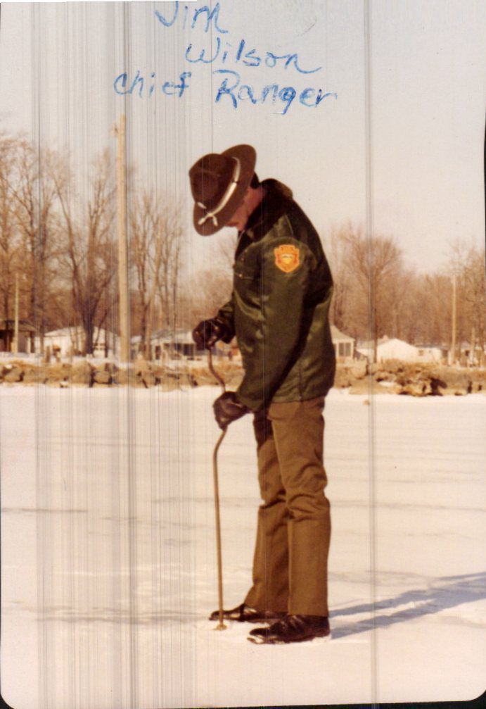 Jim Wilson, the chief park ranger at Indian Lake State Park, uses a hand auger to check the depth and strength of ice cover on the lake.