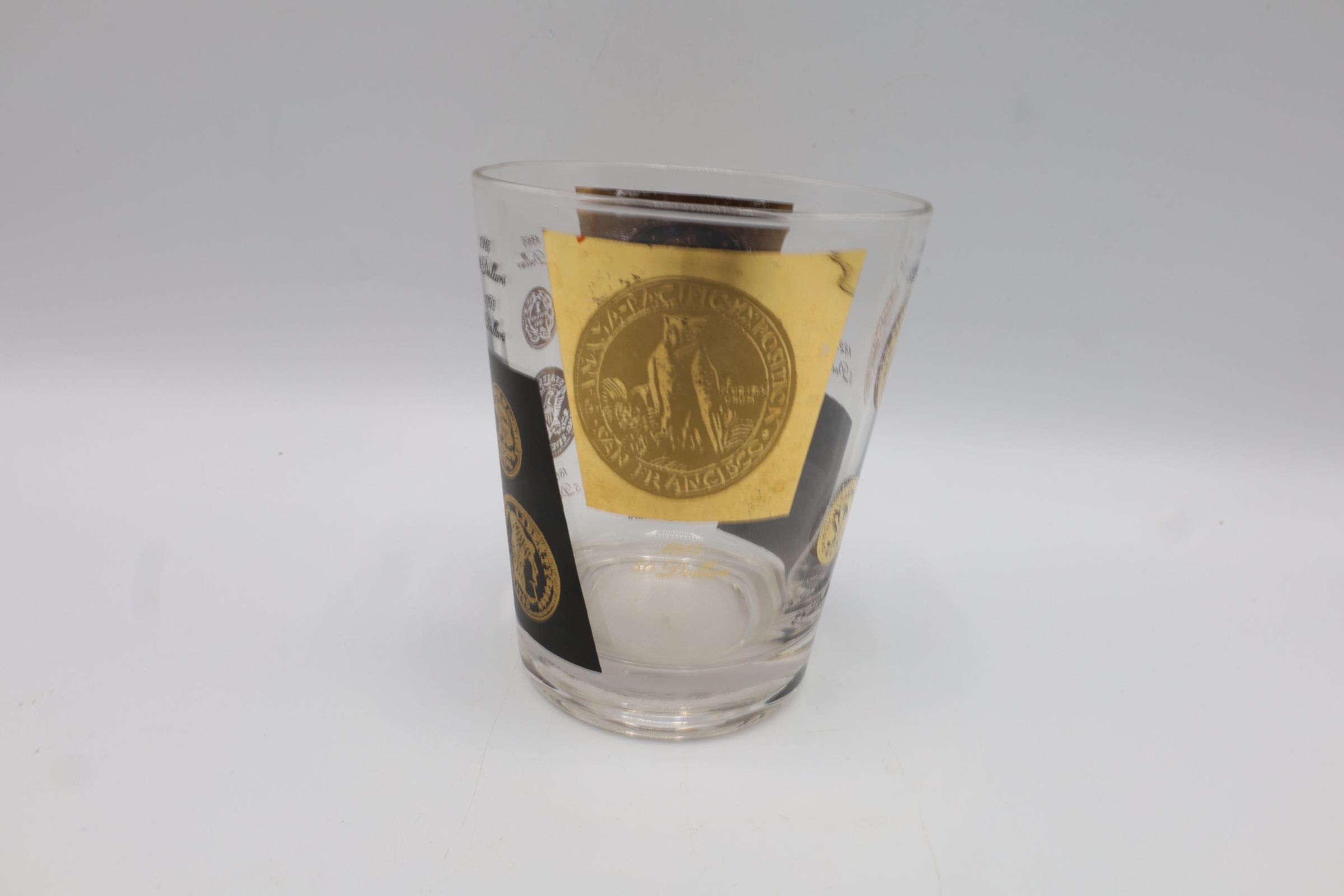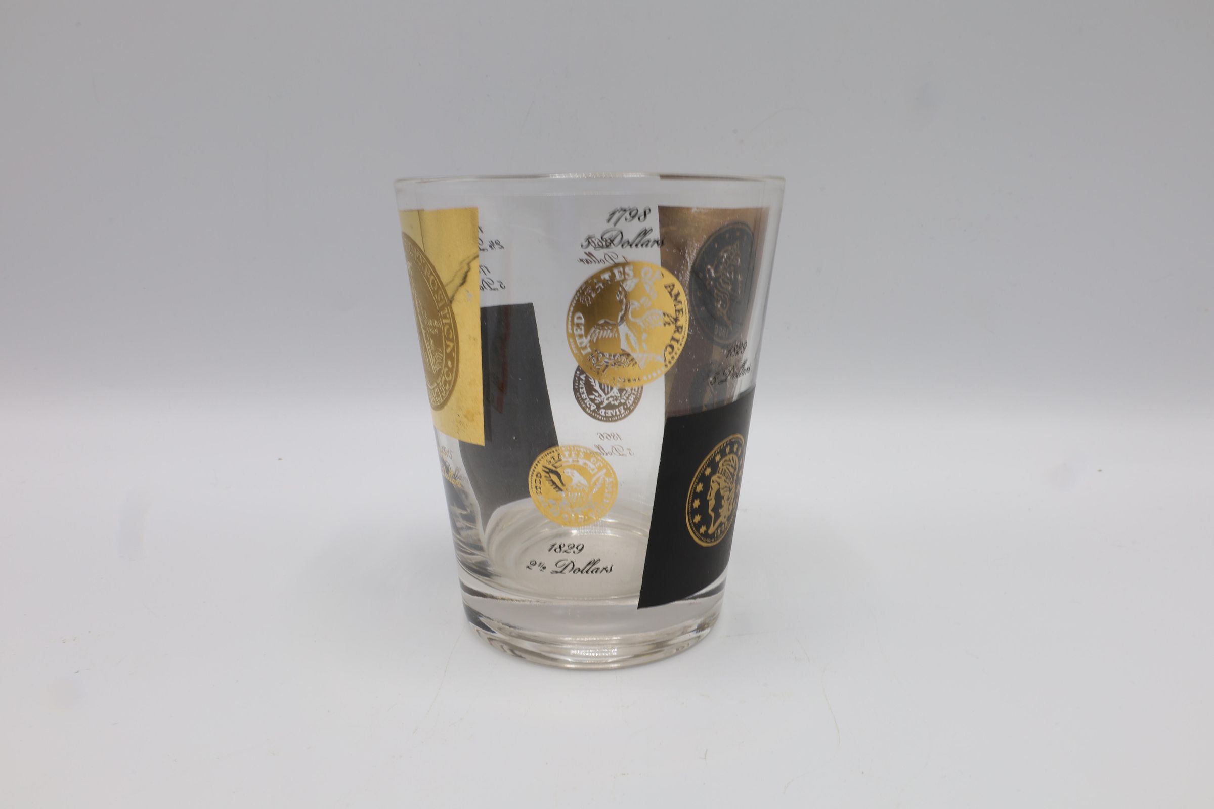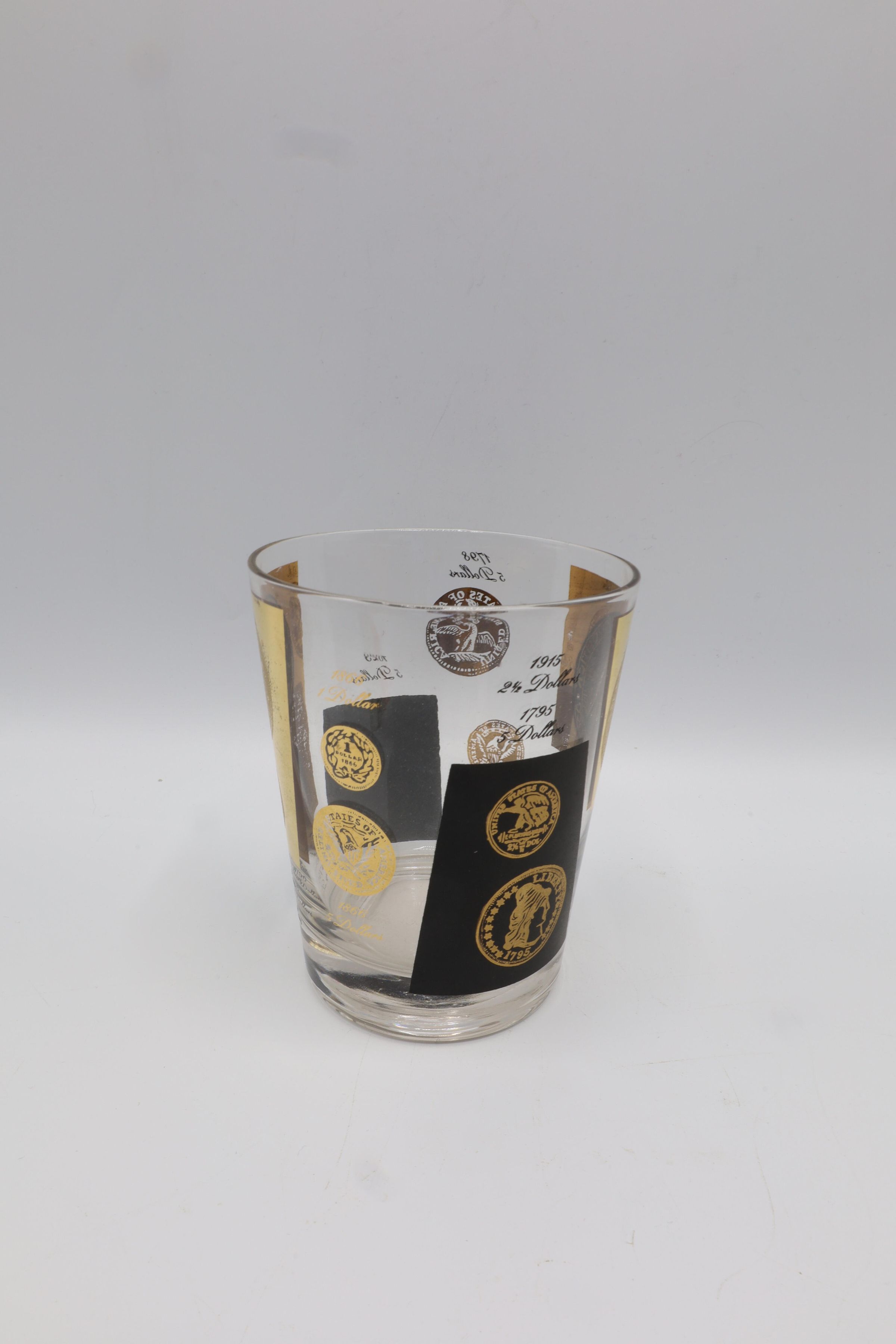 This set of eleven black and gold decal glasses, double old fashioned size, is decorated with vintage coin images ranging from 1795 to 1915. Drinks sets like these, sometimes accompanied by a similarly decorated serving pitcher or a wire carrying tray, were very popular for entertaining at home. Whether this set included a matching pitcher or tray is unknown.