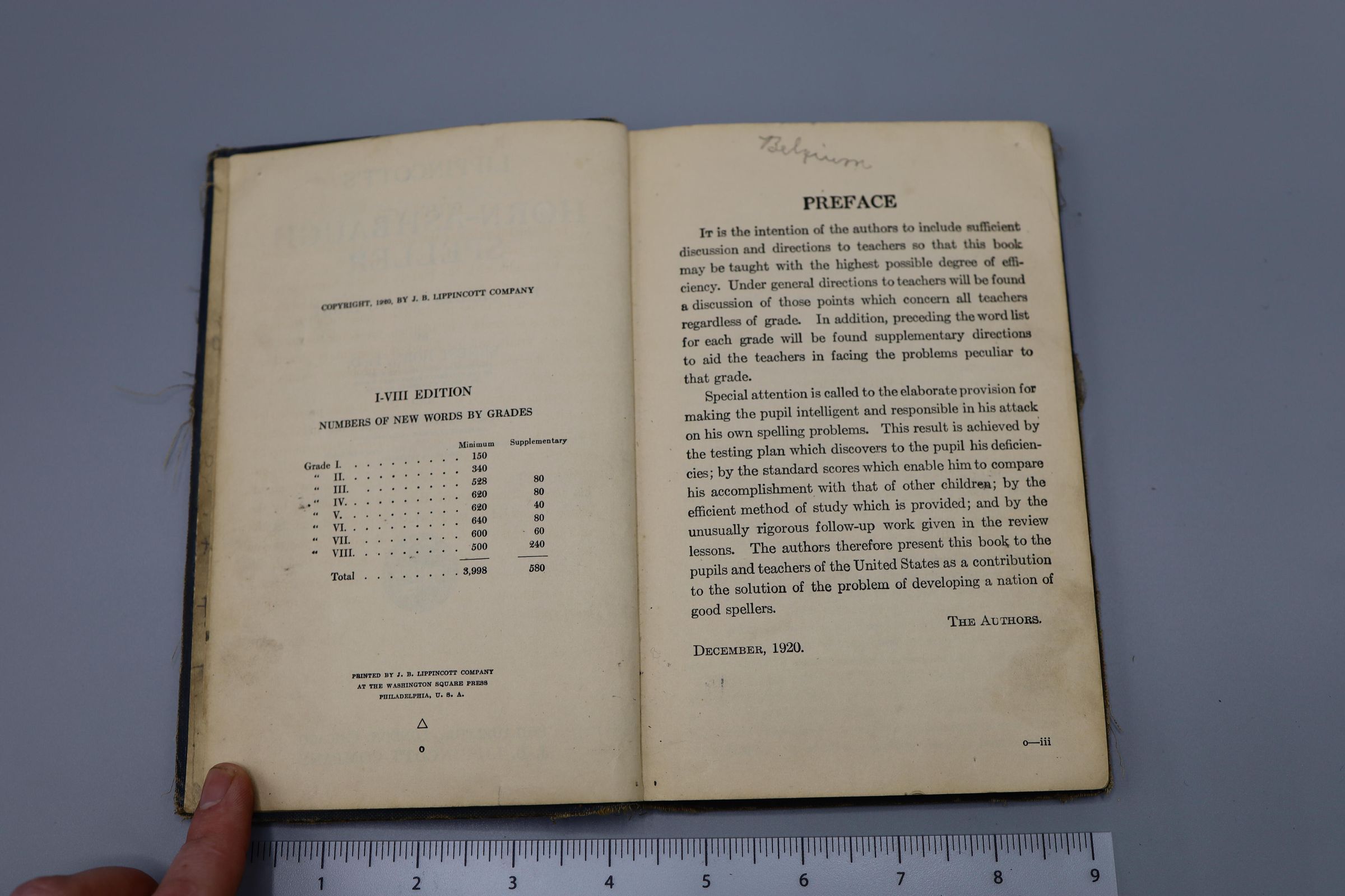 Lippincott's Horn-Ashbaugh Spelling Book, Grade 1-8, JB Lippincott Co, Copyright 1920. Numerous doodles and graffiti in the front end pages.Location