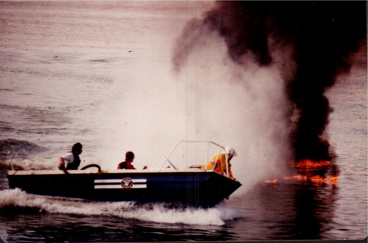 A boating crew mitigates a controlled oil fire on the waters of Delaware Lake as part of a training exercise during the Marine Patrol Symposium.