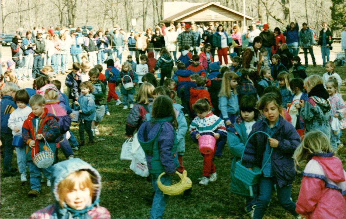 Children with baskets carefully inspect the ground for Easter eggs during Mt. Gilead State Park's Easter egg hunt in 1996. The egg-finding area is roped off from the rest of the park, and watchful parents stand behind the rope as they watch events unfolding inside.