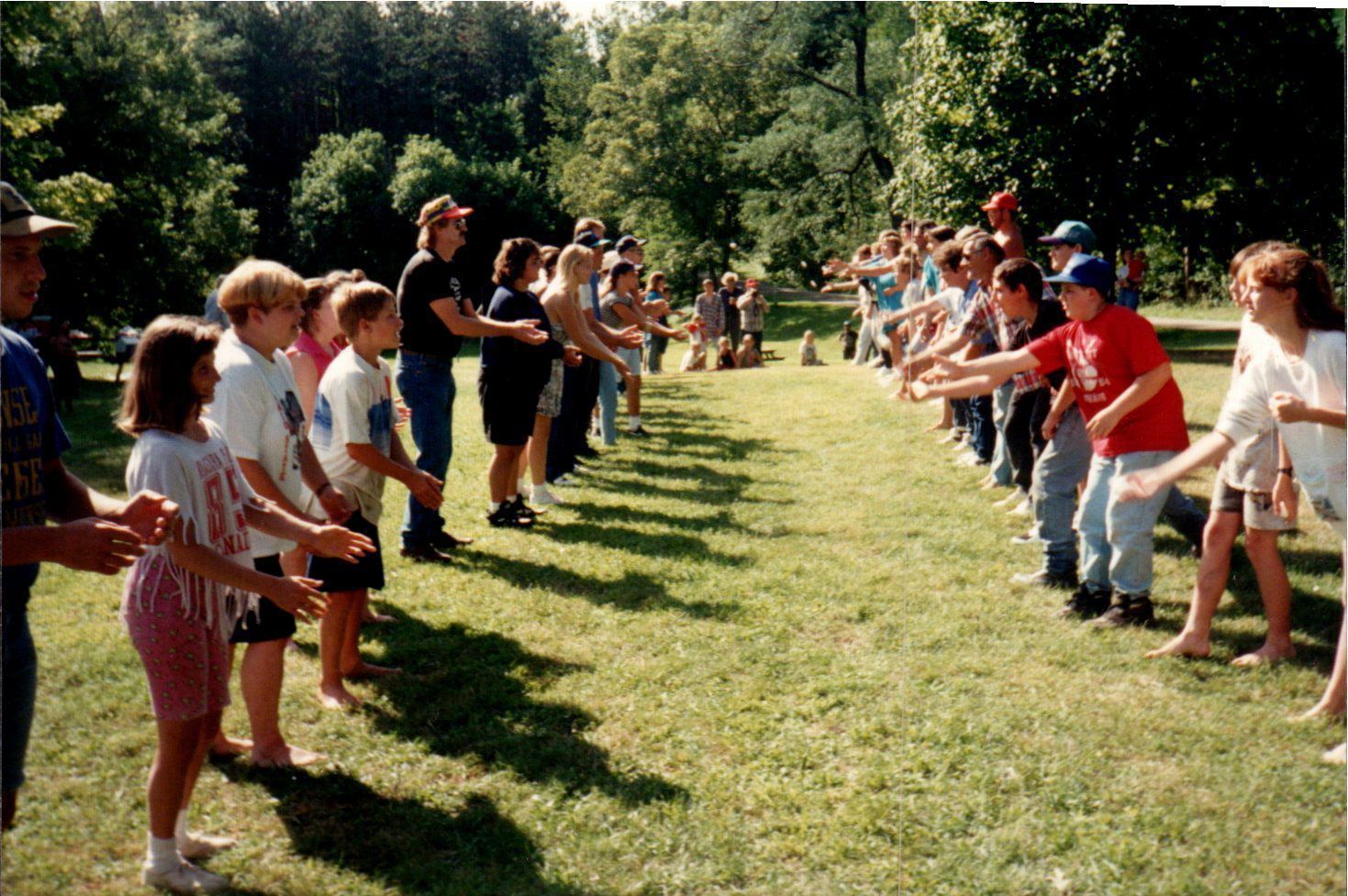 Participants partaking in Blue Rock State Park's egg toss contest line up with a partner as they toss an egg back and forth. The winner of this competition is the pair who holds out the longest without breaking their egg.Cataloged By