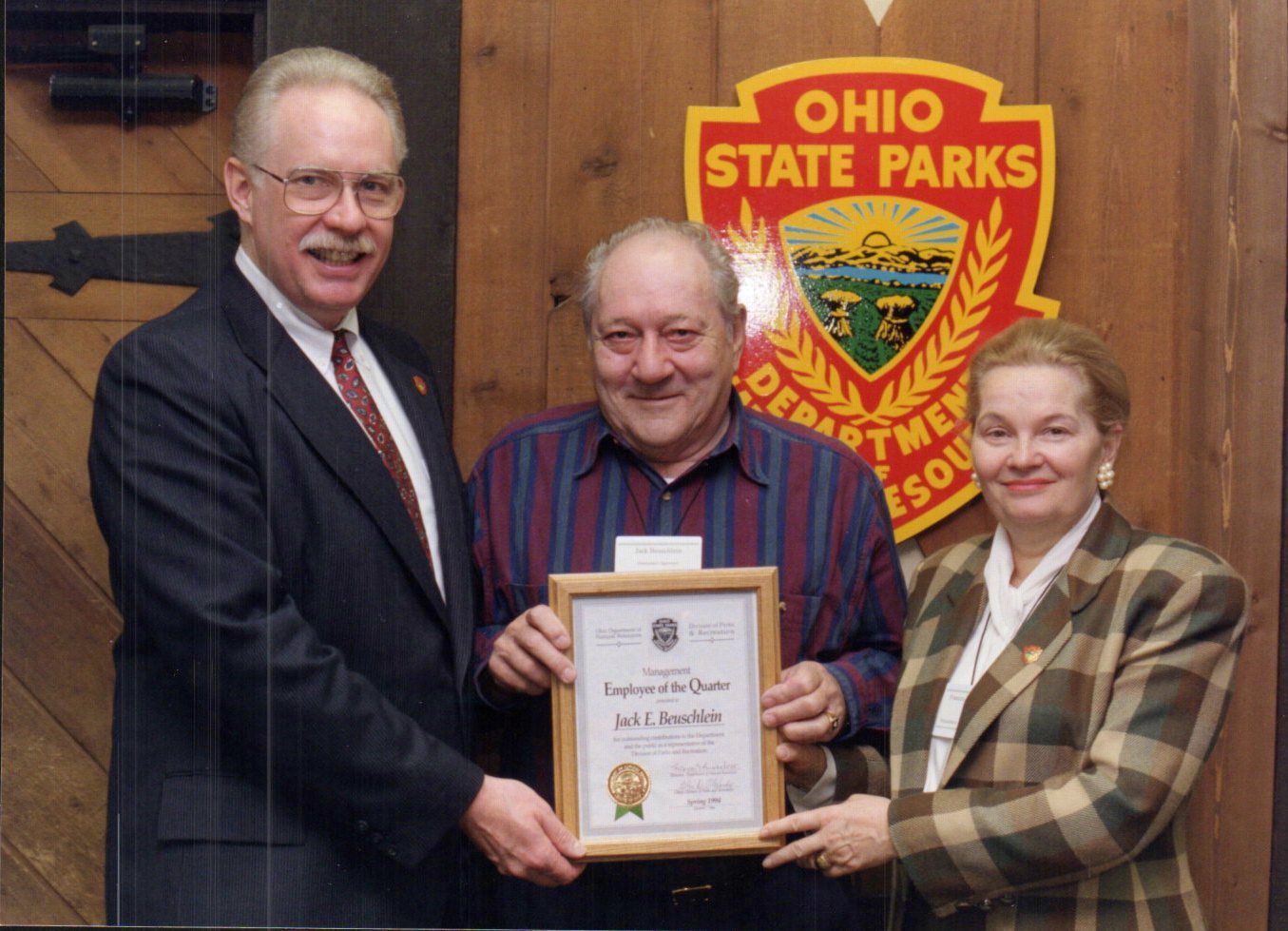 ODNR employee Jack E. Beuschlein receives an award for Employee of the Quarter. On his right is ODNR's eight director and first female director, Frances Seiberling Buchholzer. She led ODNR between 1991-1995. Her conservation efforts led to her induction into ODNR's Hall of Fame in 2003. On his left is Glen D. Alexander, the chief of the ODNR Division of Parks and Recreation (today the Division of Parks and Watercraft) between 1991-1997. Alexander received the Cardinal Award in 2024 in honor of his career in natural resource management.