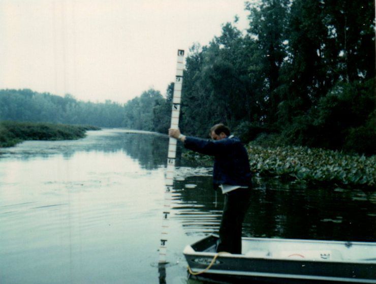 A person standing in a boat holds a gauge measuring the water depth at the entrance to Florida Shores. The water measures roughly two and a half feet. Florida Shores is one of the many quaint neighborhoods located along the shoreline of Indian Lake.
