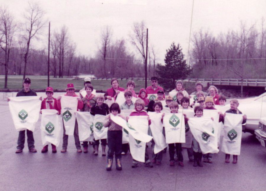 Children pose with bags (or possibly towels) for an environmental education program at Indian Lake State Park in November of 1983.