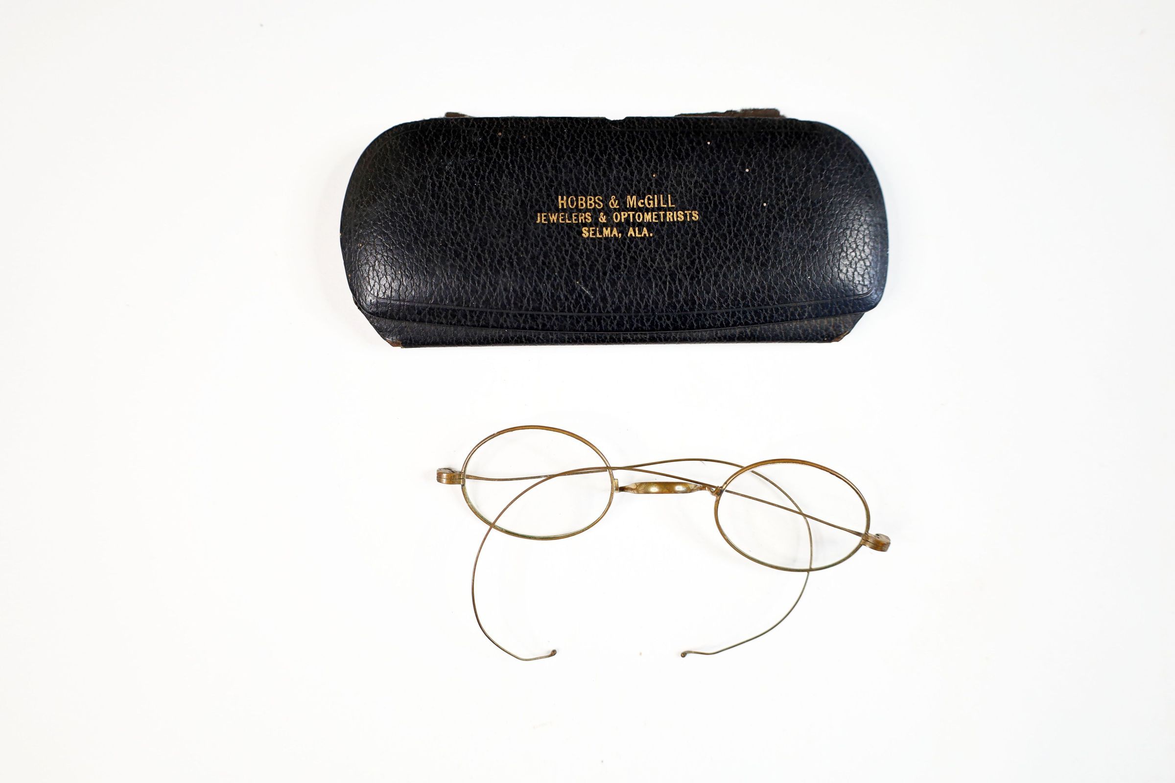 Antique glasses with case made by "Hobbs & McGill Jewelers & Optometrists" of Selma, Alabama. Hobb & McGill was in operation between 1915-1932. The business opened as "G.L. and J.R. Poor Jewelers" in 1845, and after numerous transitions of ownership, remains in business today as "Butler Jewelers".
