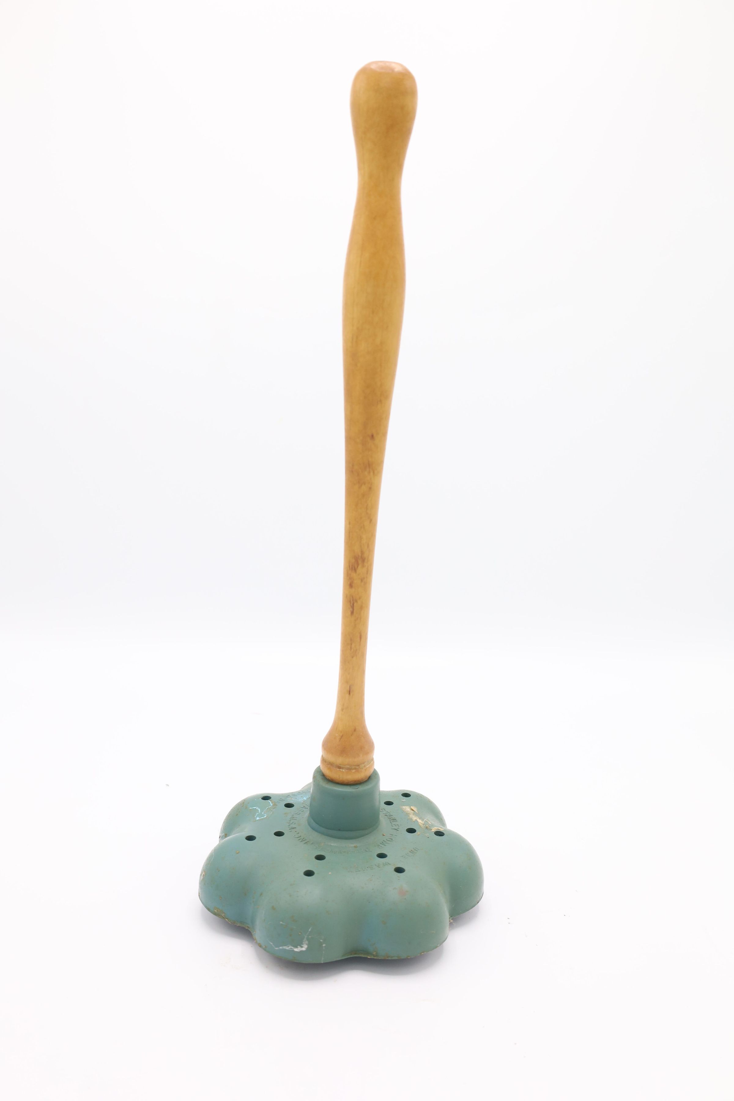 The 'Unde-Washer' was used to agitate the water when laundering clothing by hand at home. Holes in the rubber base aerated the soapy water, while the wooden handle allowed for agitation of garments as part of the cleaning process.Use