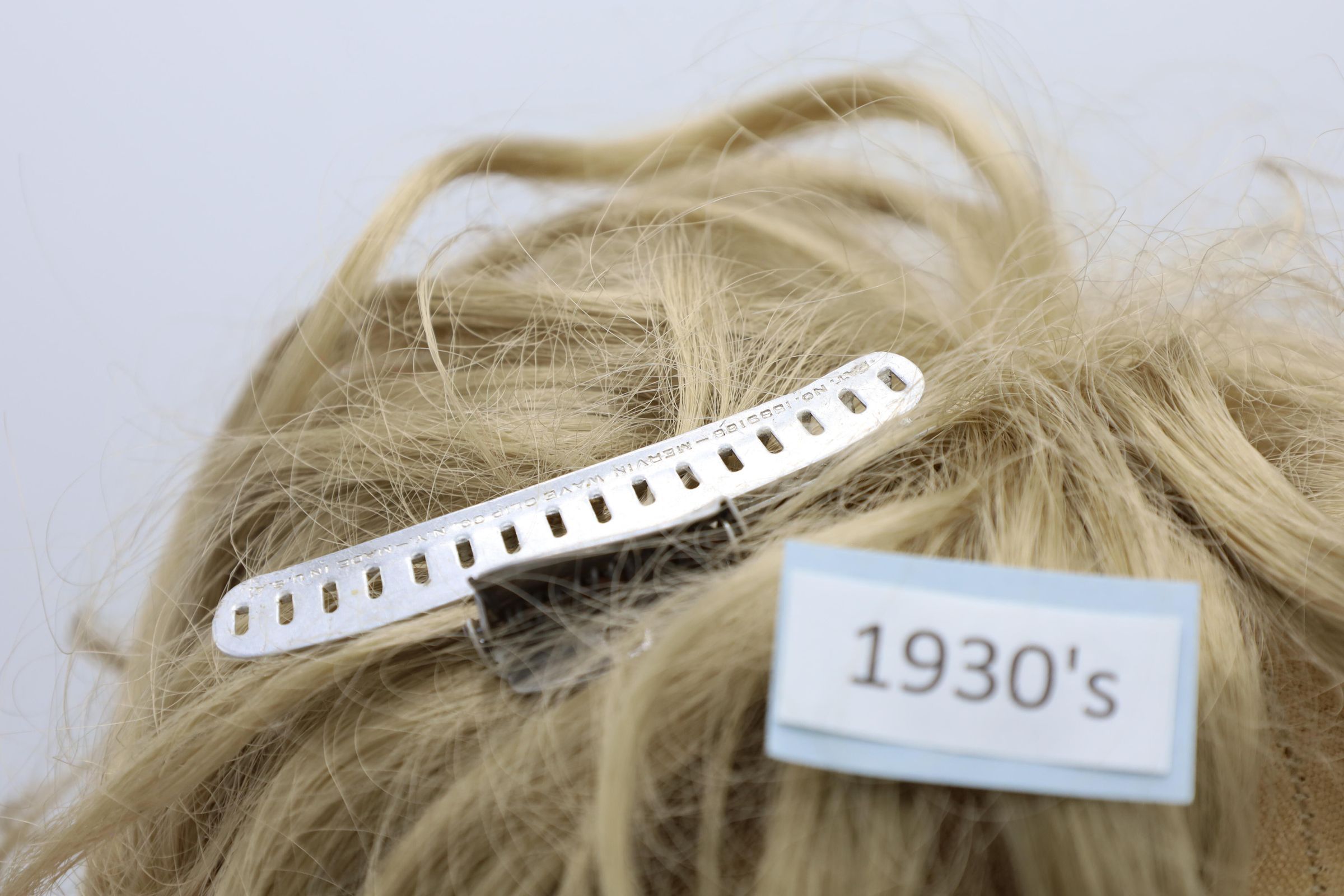 This display depicts how women used curlers in three different time periods, the 1930s, the 1940s, and the 1960s. This wig is sitting on a cork canvas block head wig display.