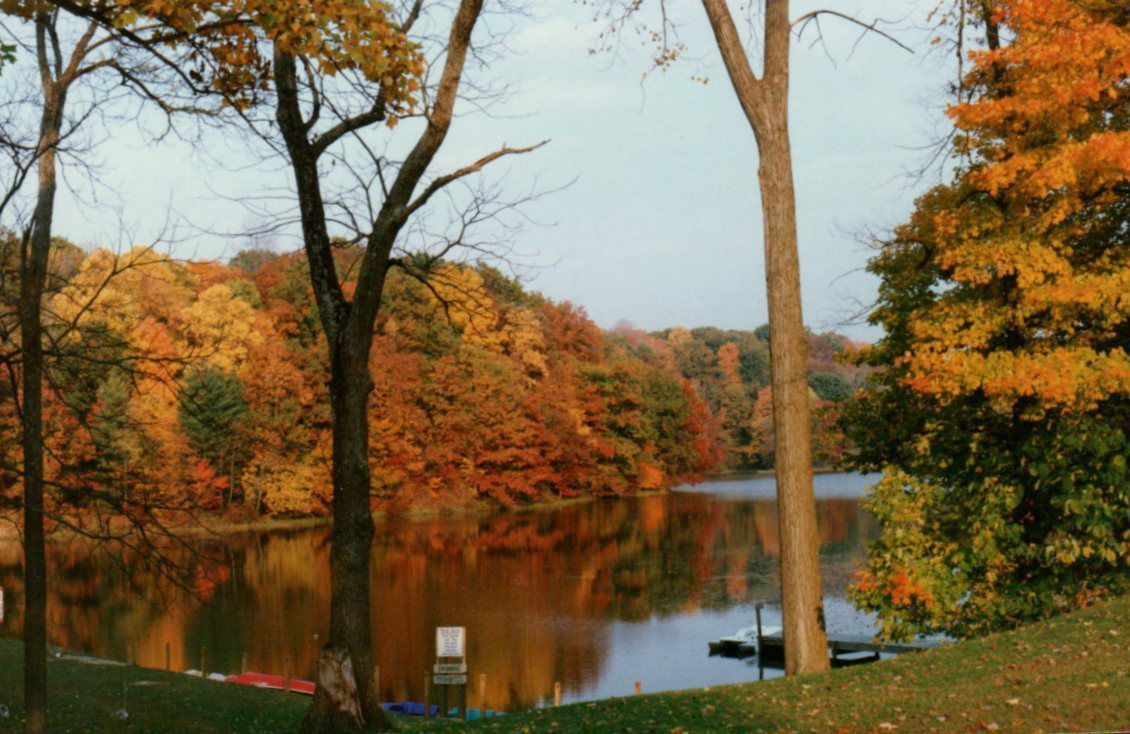 Mount Gilead Lake is surrounded with dazzling fall color featuring shades of yellow, orange, and red.