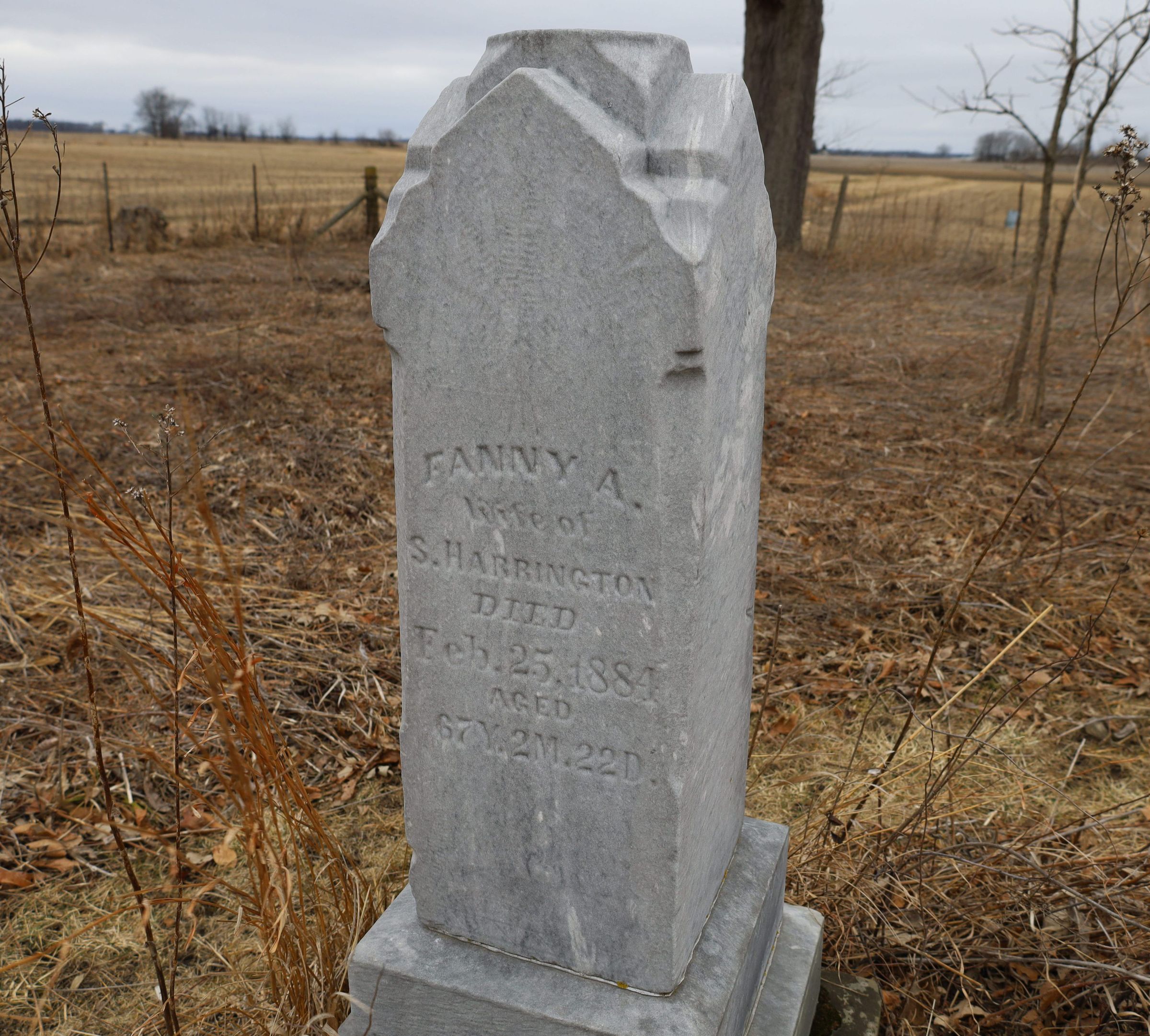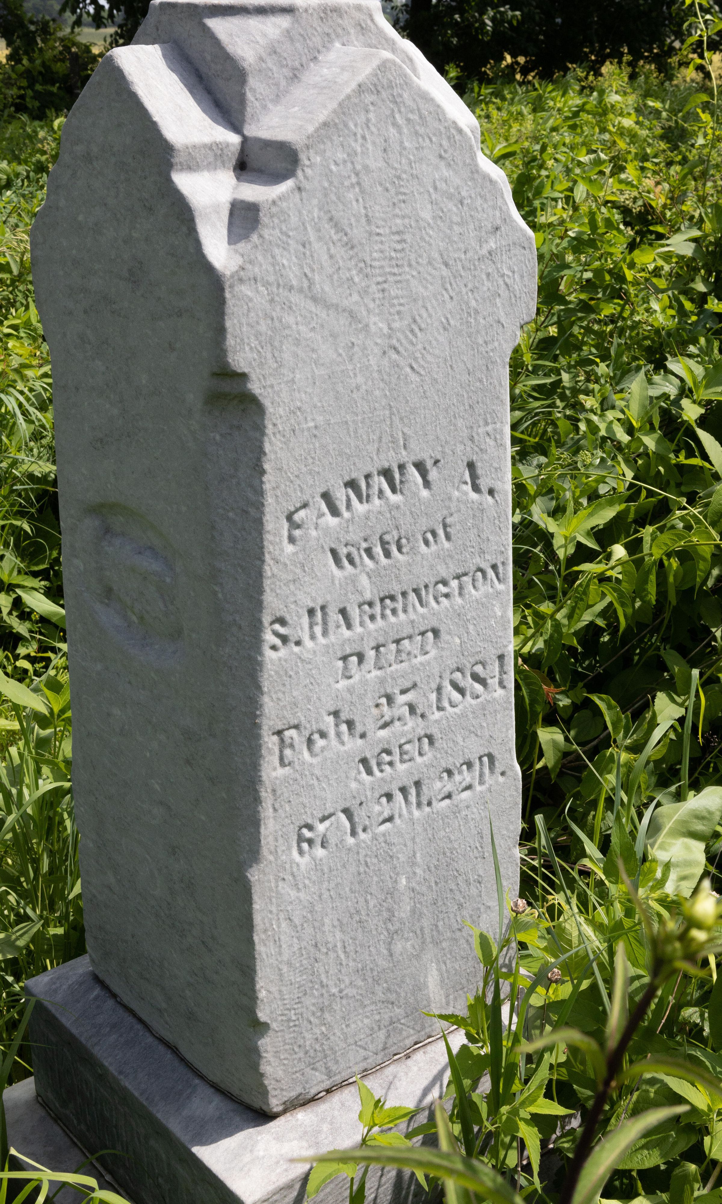 FANNY A. Wife of S. HARRINGTON Died Feb. 25. 1884 Aged 67Y. 2M. 22D.