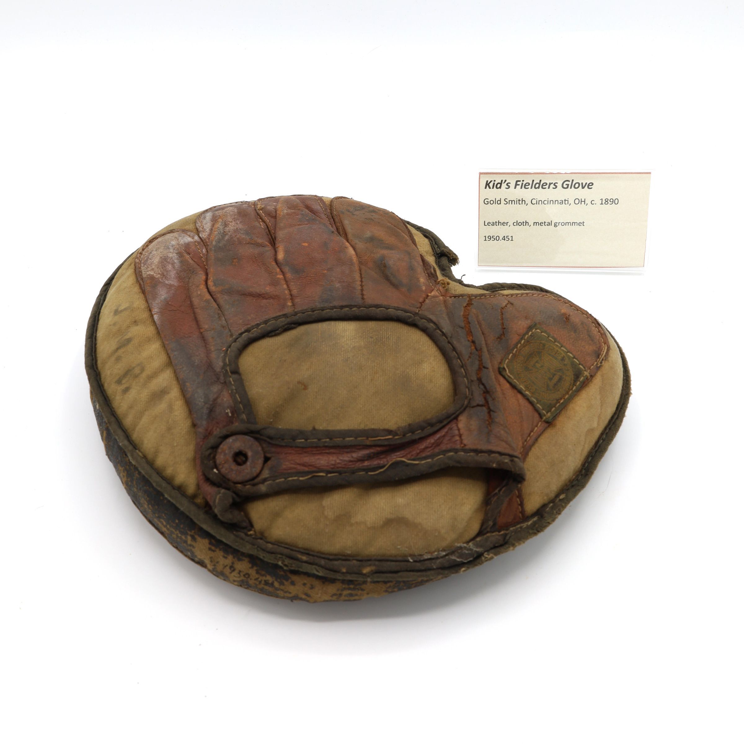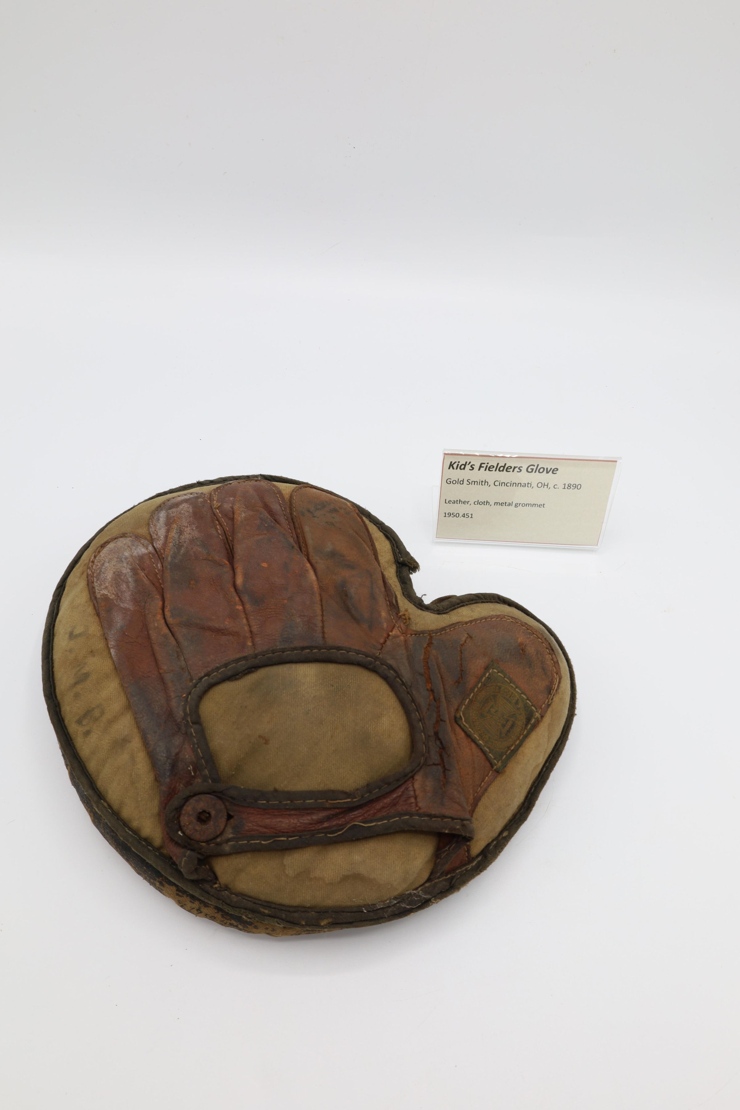 Cincinnati is considered to be the site of the first professional baseball game in May 1869. Cincinnati was also home to a manufacturer of baseball gloves, balls, and other sporting goods. GoldSmith, or P. Goldsmith, was created by Philip Goldsmith, an Austrian immigrant, in 1875. This child-sized fielder's glove, made of fabric and leather with a metal grommet, dates to around 1890.Use