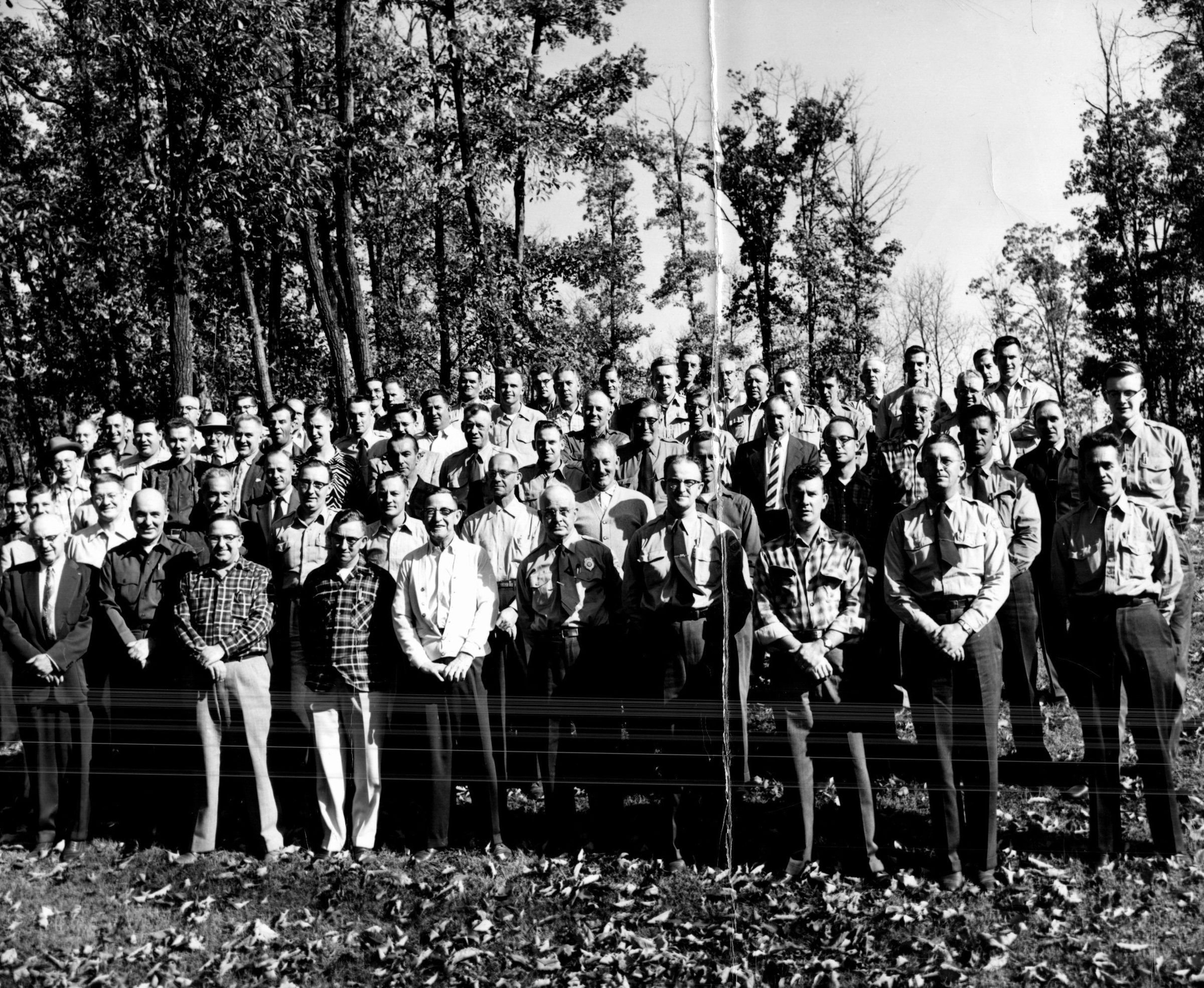 Park managers from throughout the state of Ohio gather at the Fifth Annual Park Managers Training School. This program began in 1951 at Lake Hope State Park and was intended to promote efficiency and consistency in park management practices. This photograph comes from the conference held at Lake Hope State Park between October 30 and November 2 of 1955.
