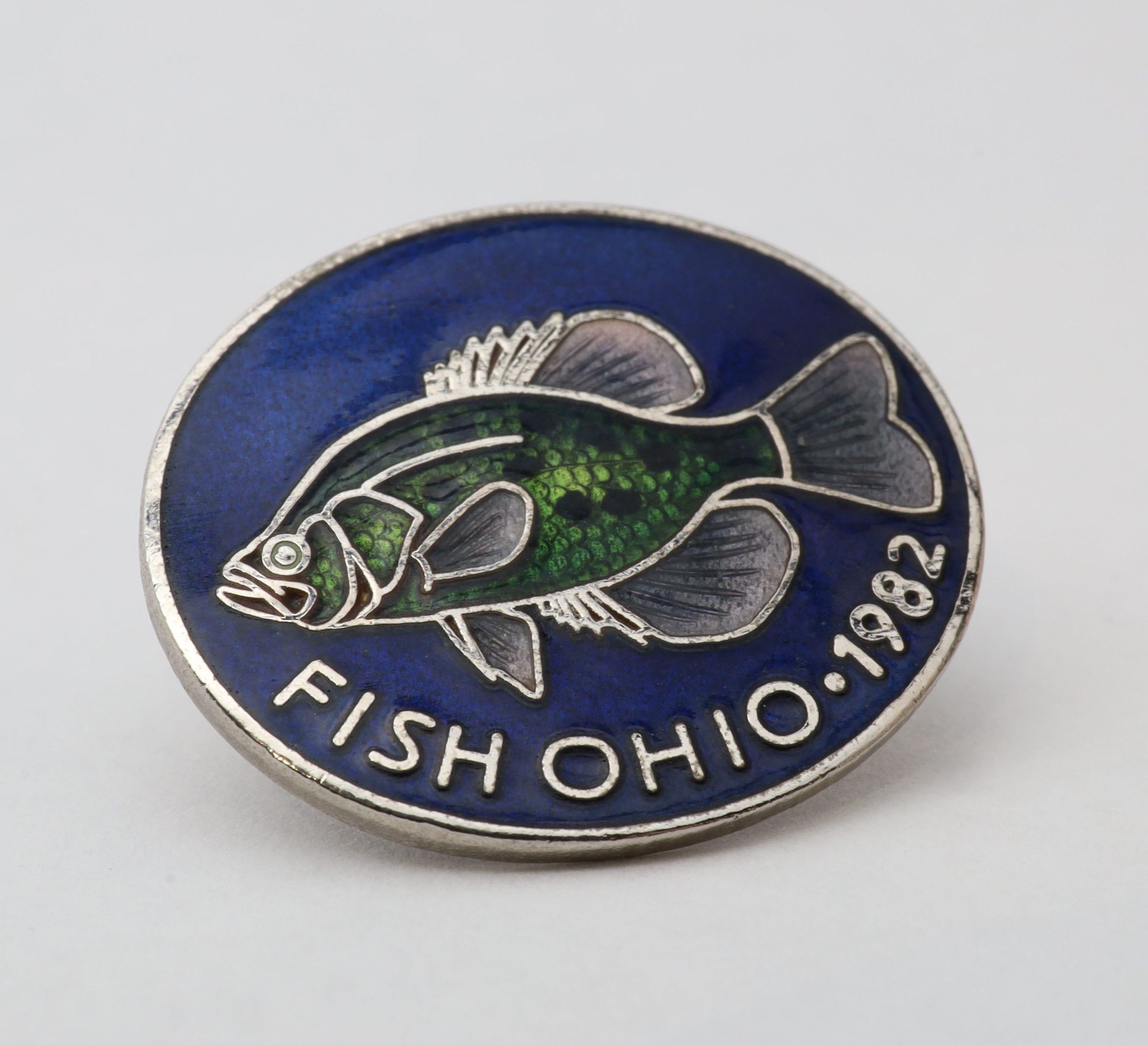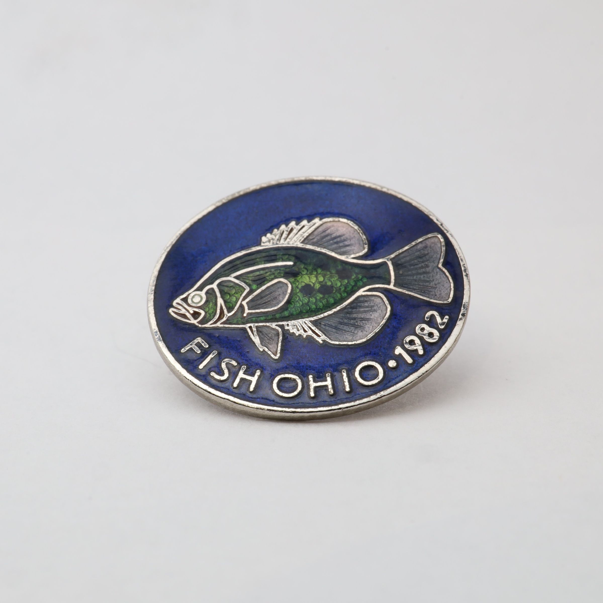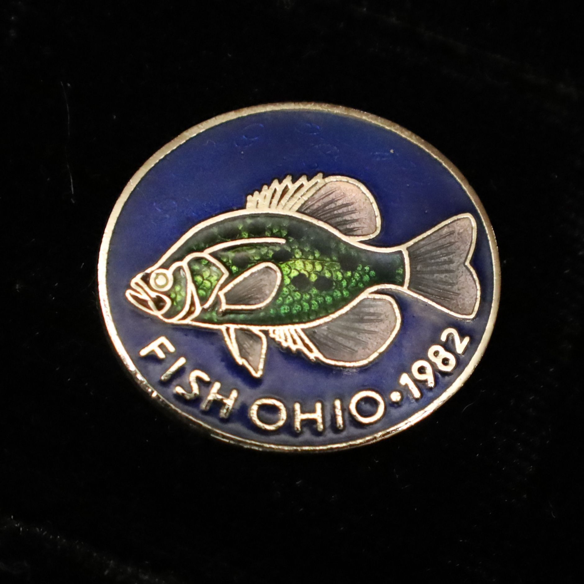 The 1982 Fish Ohio pin features a crappie. The enameled pin has a dark blue background, and the crappie's body has scales in green with grey fins.