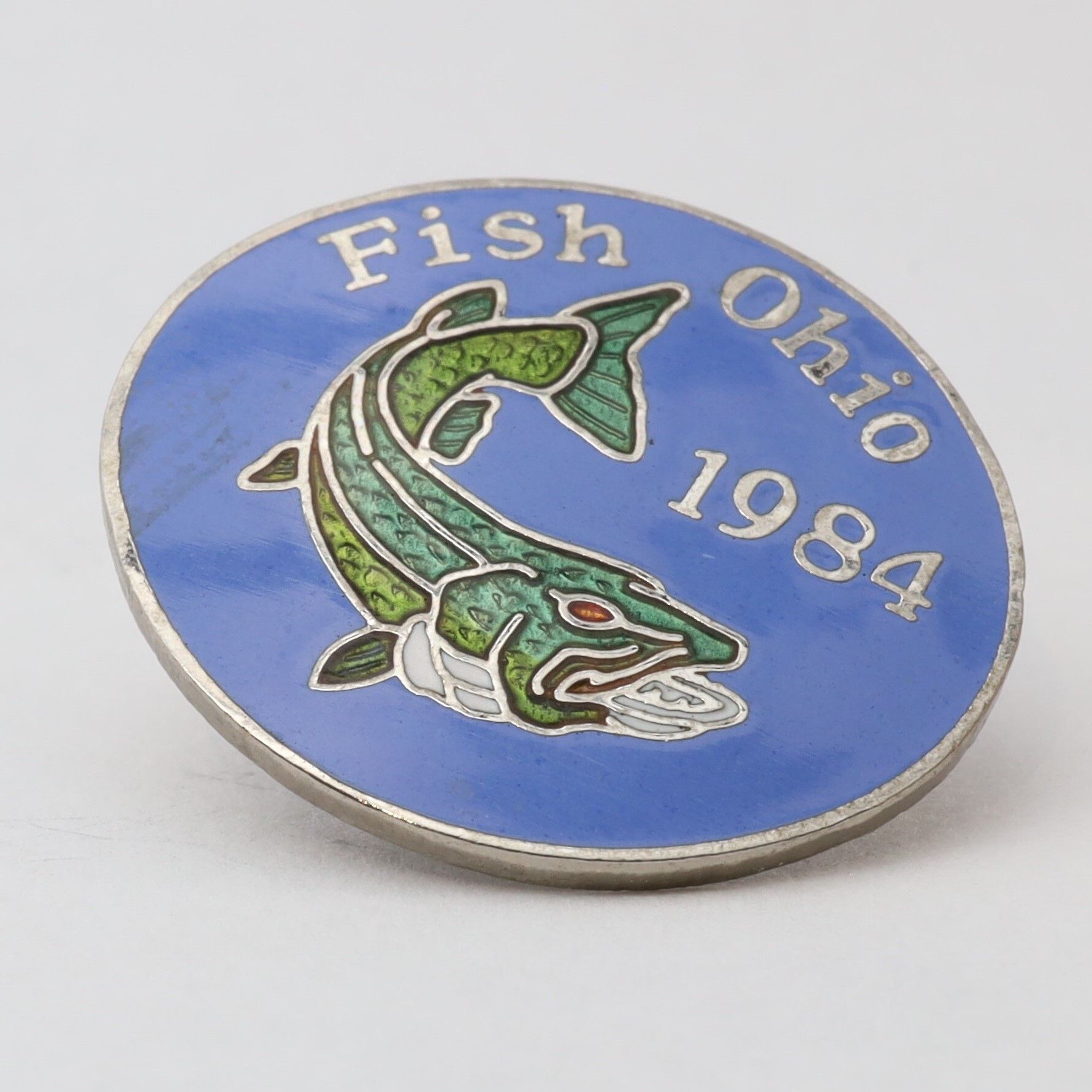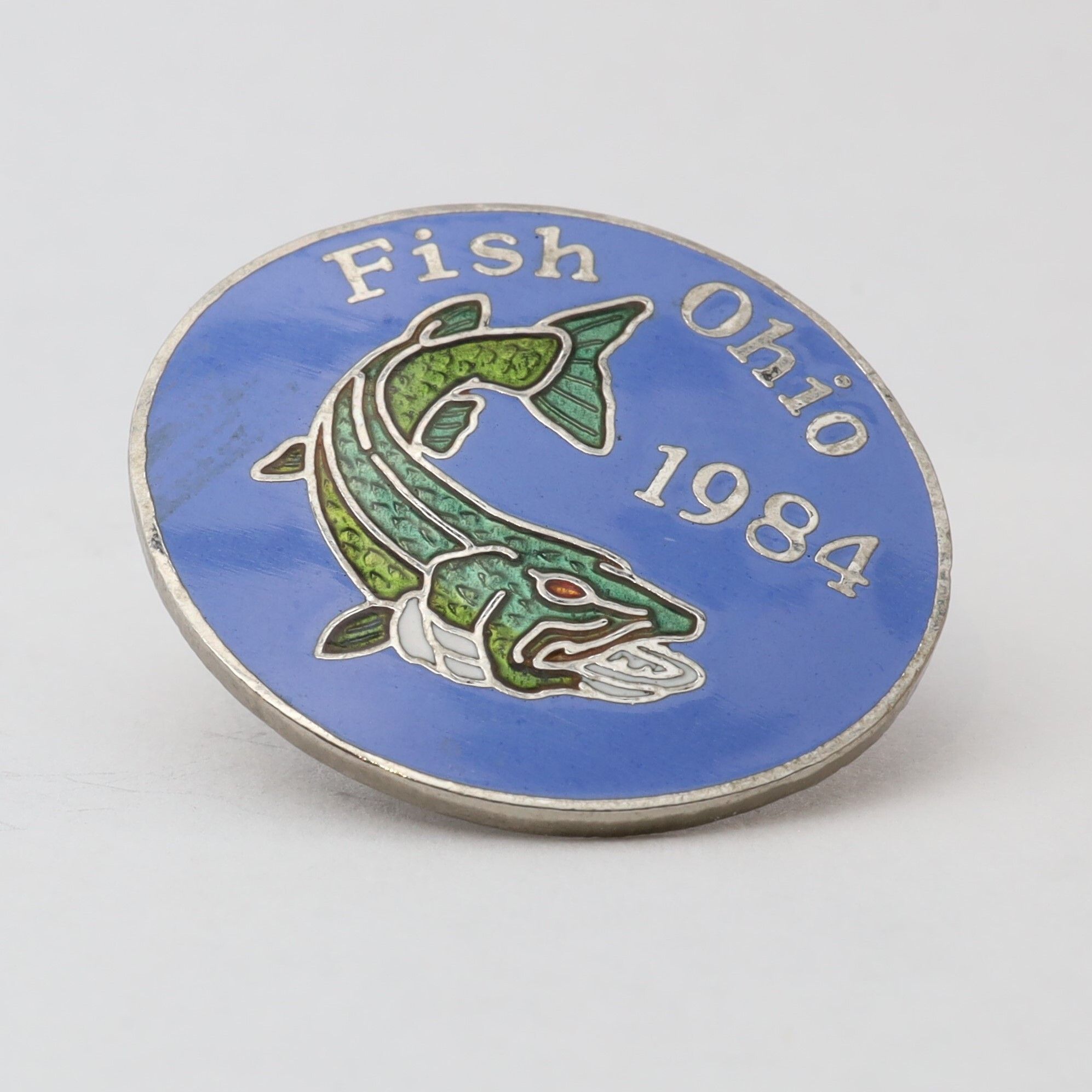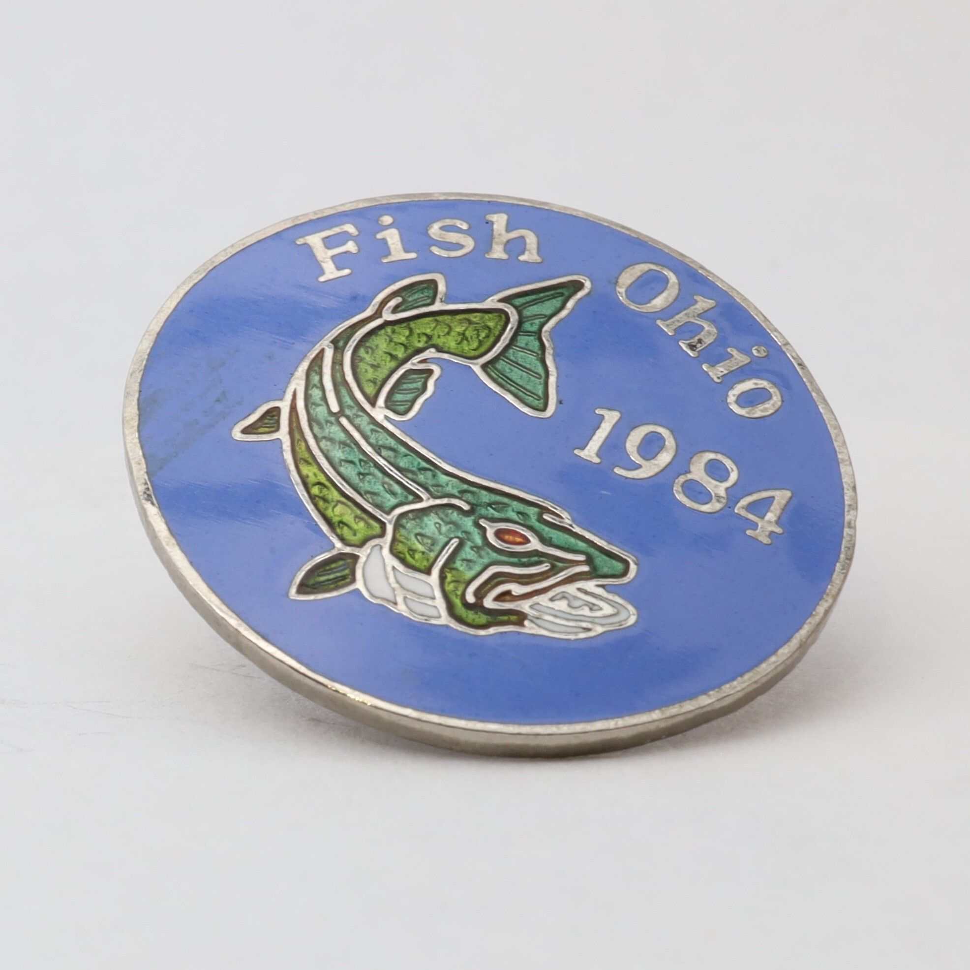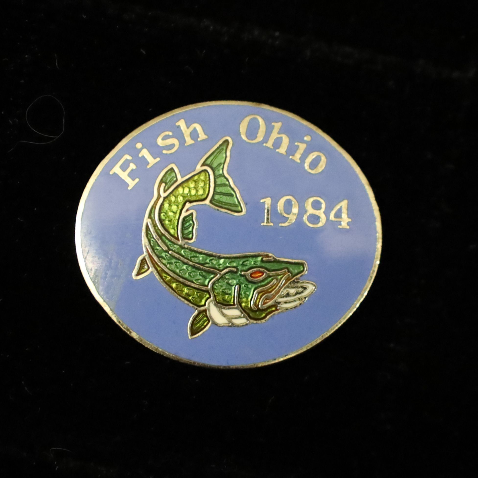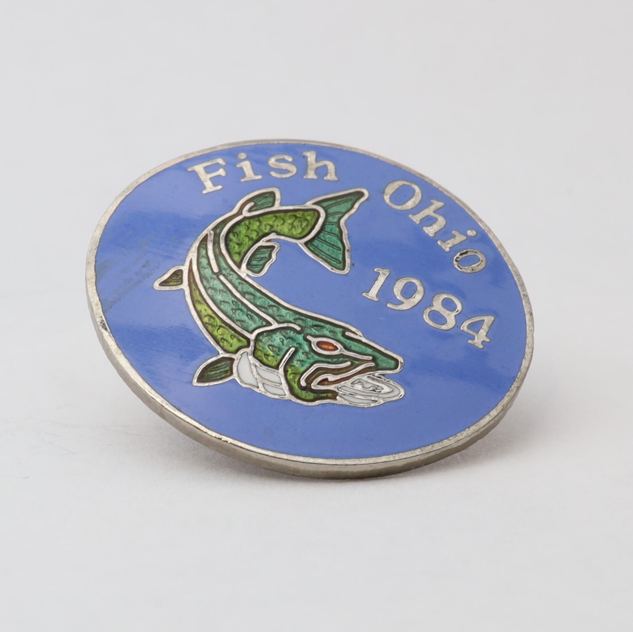 The 1984 Fish Ohio pin features a muskie. The fish's body is in multiple shades of green, and the pin has a blue background.Context