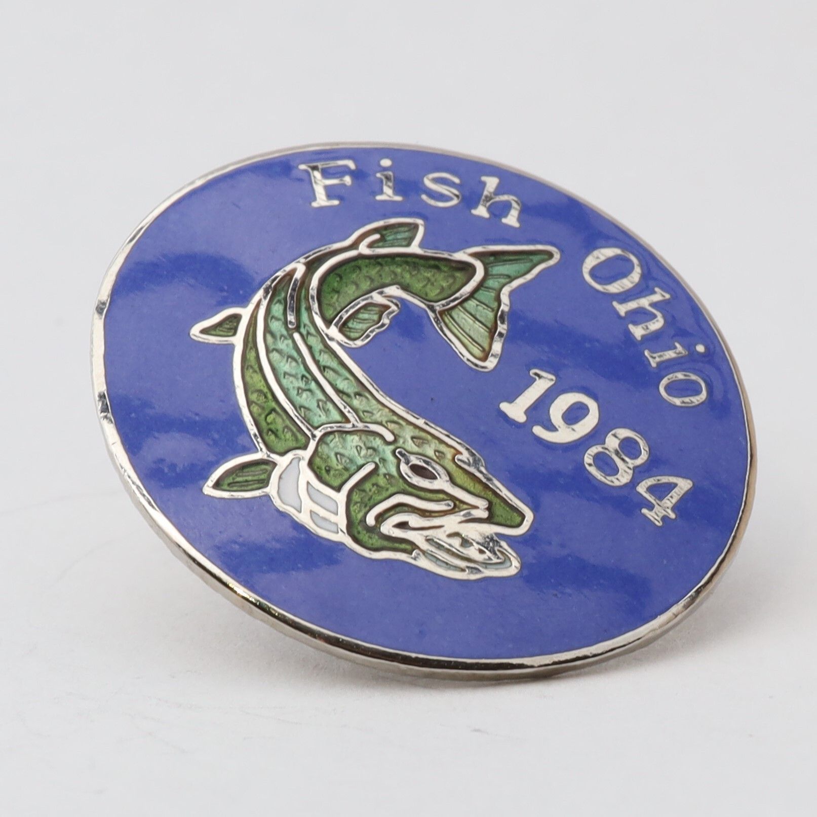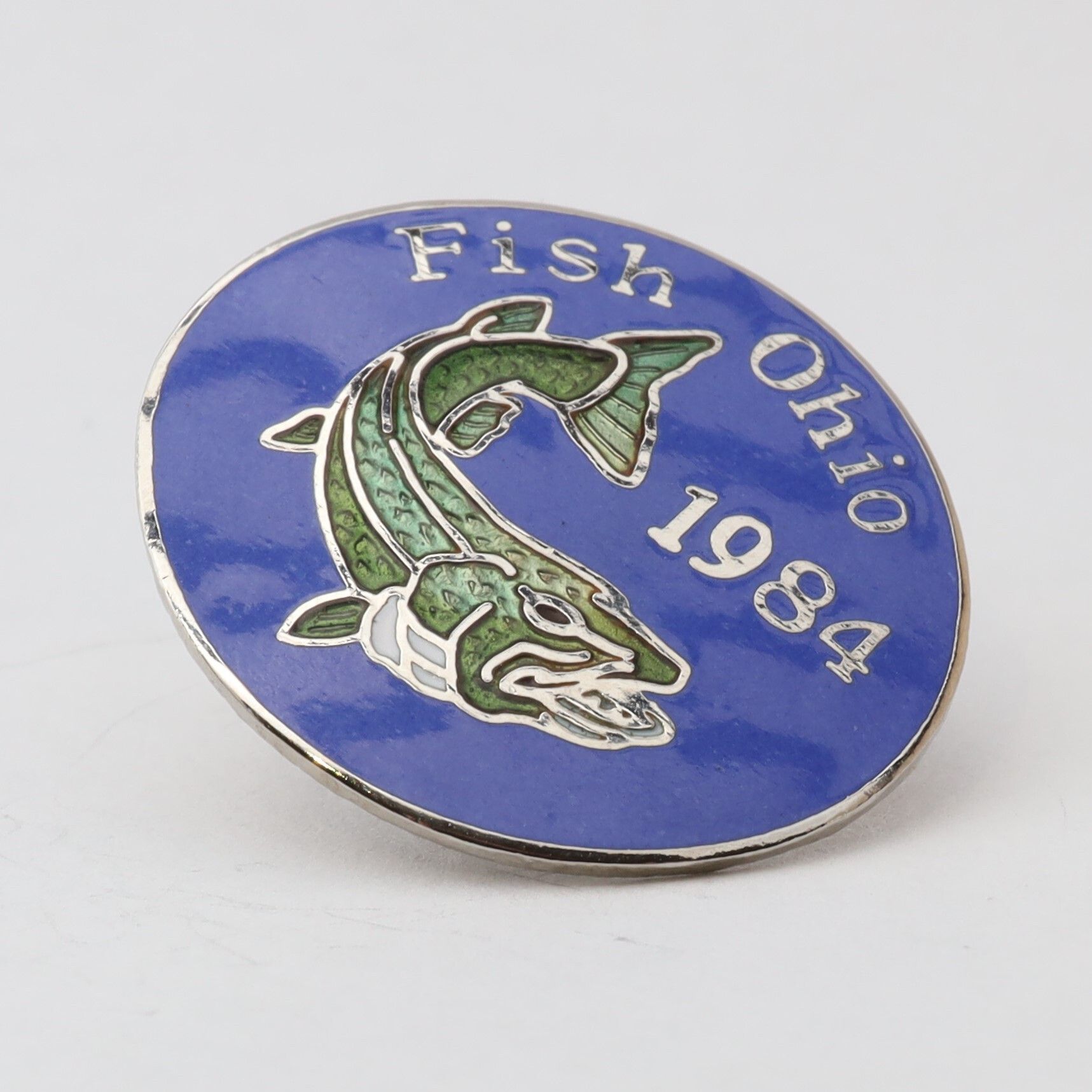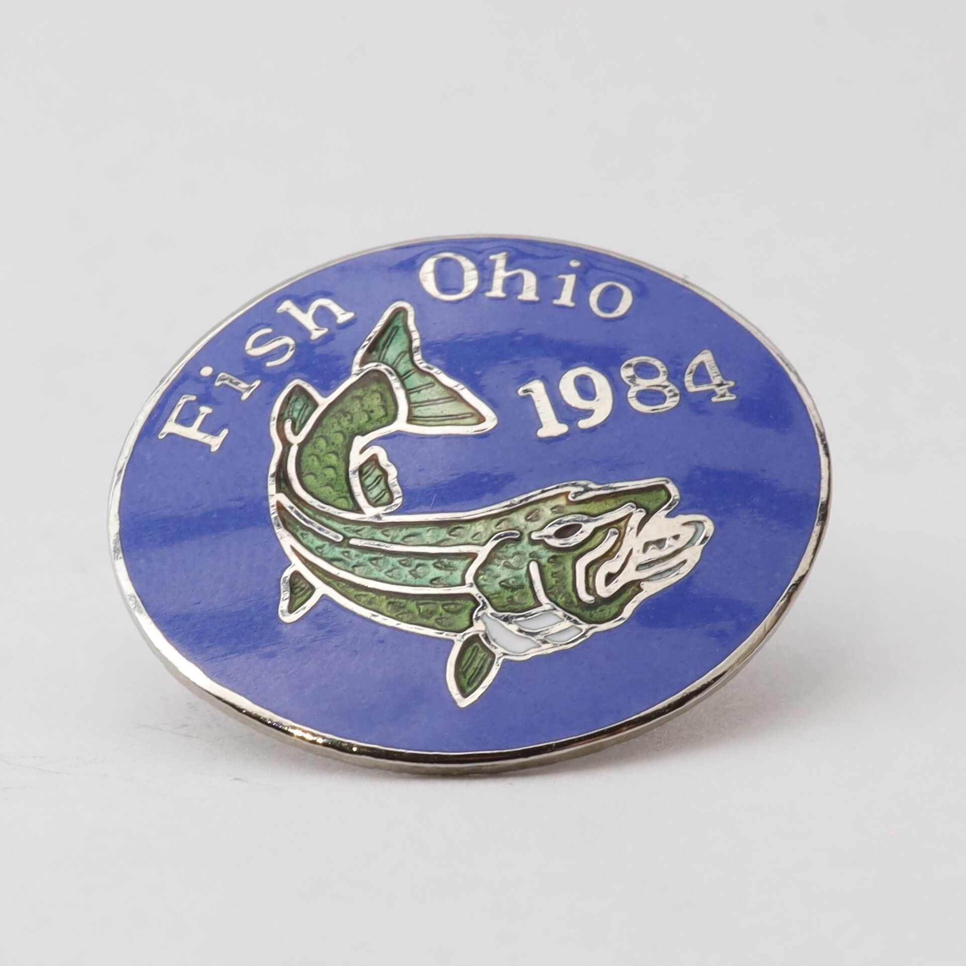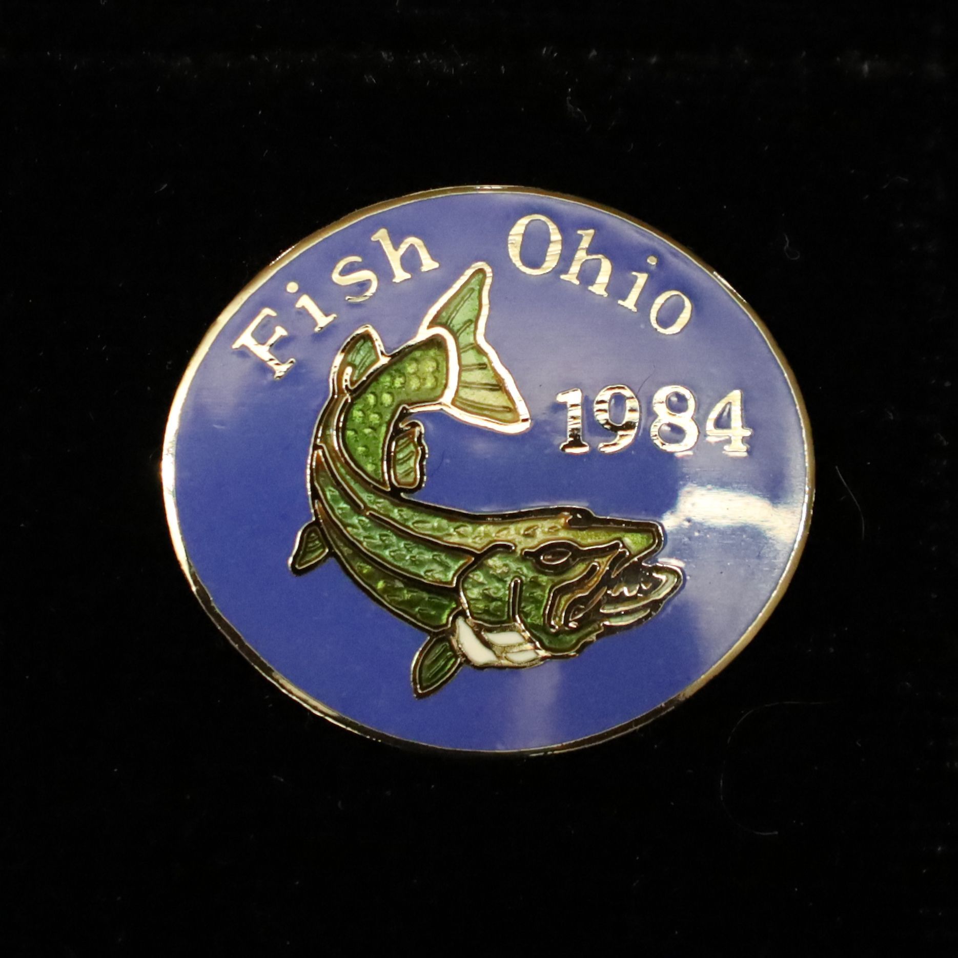 Prototype of the 1984 Fish Ohio pin featuring muskie.Context