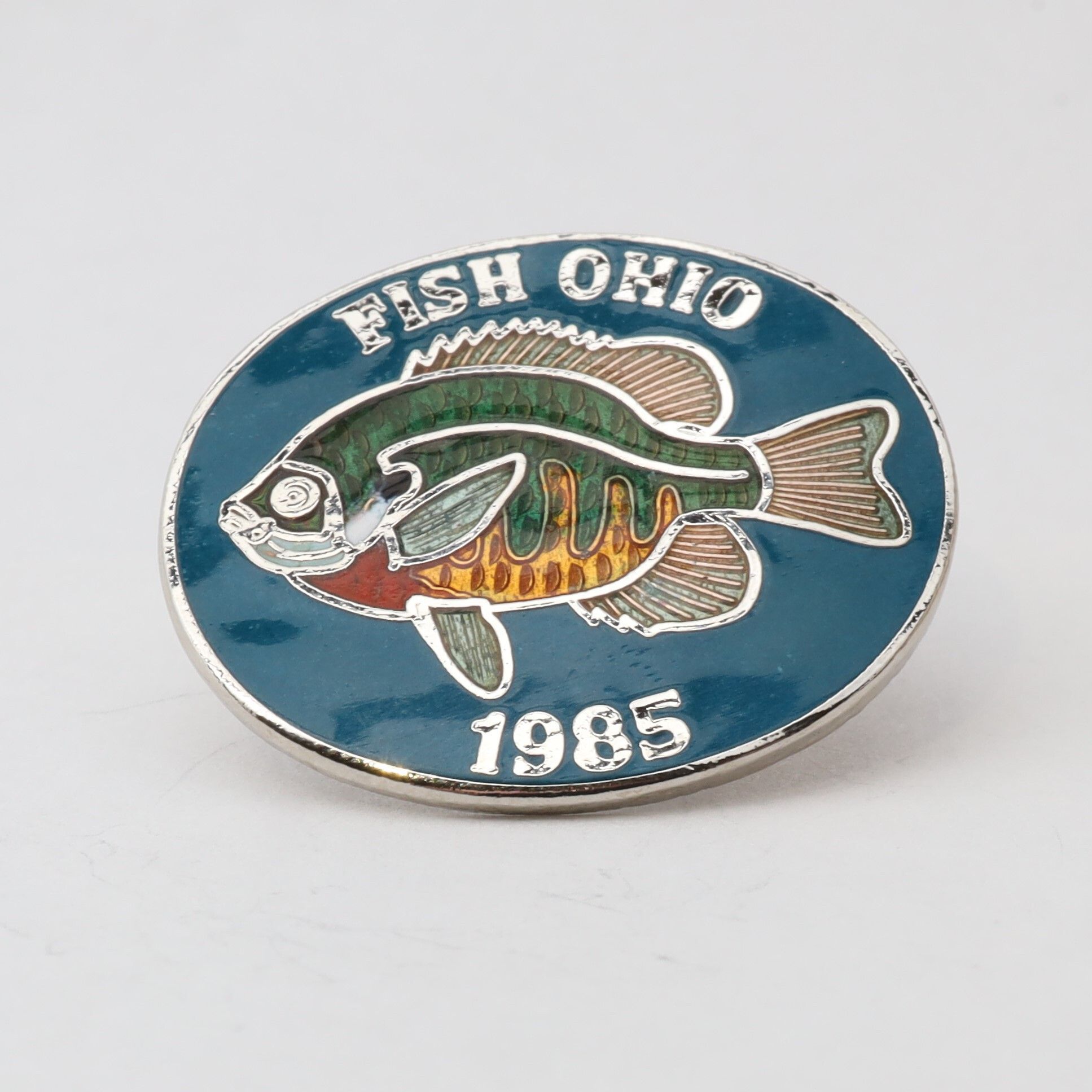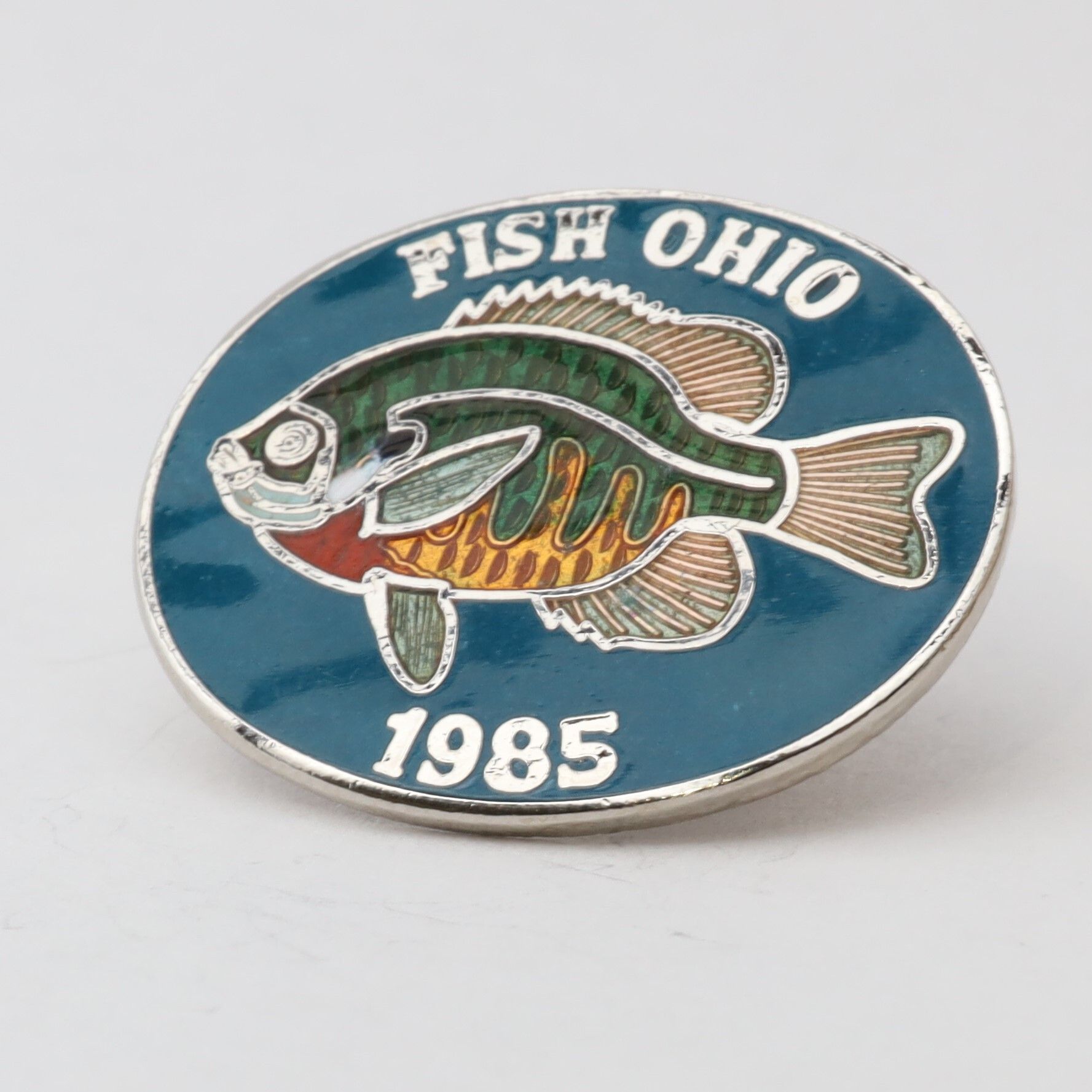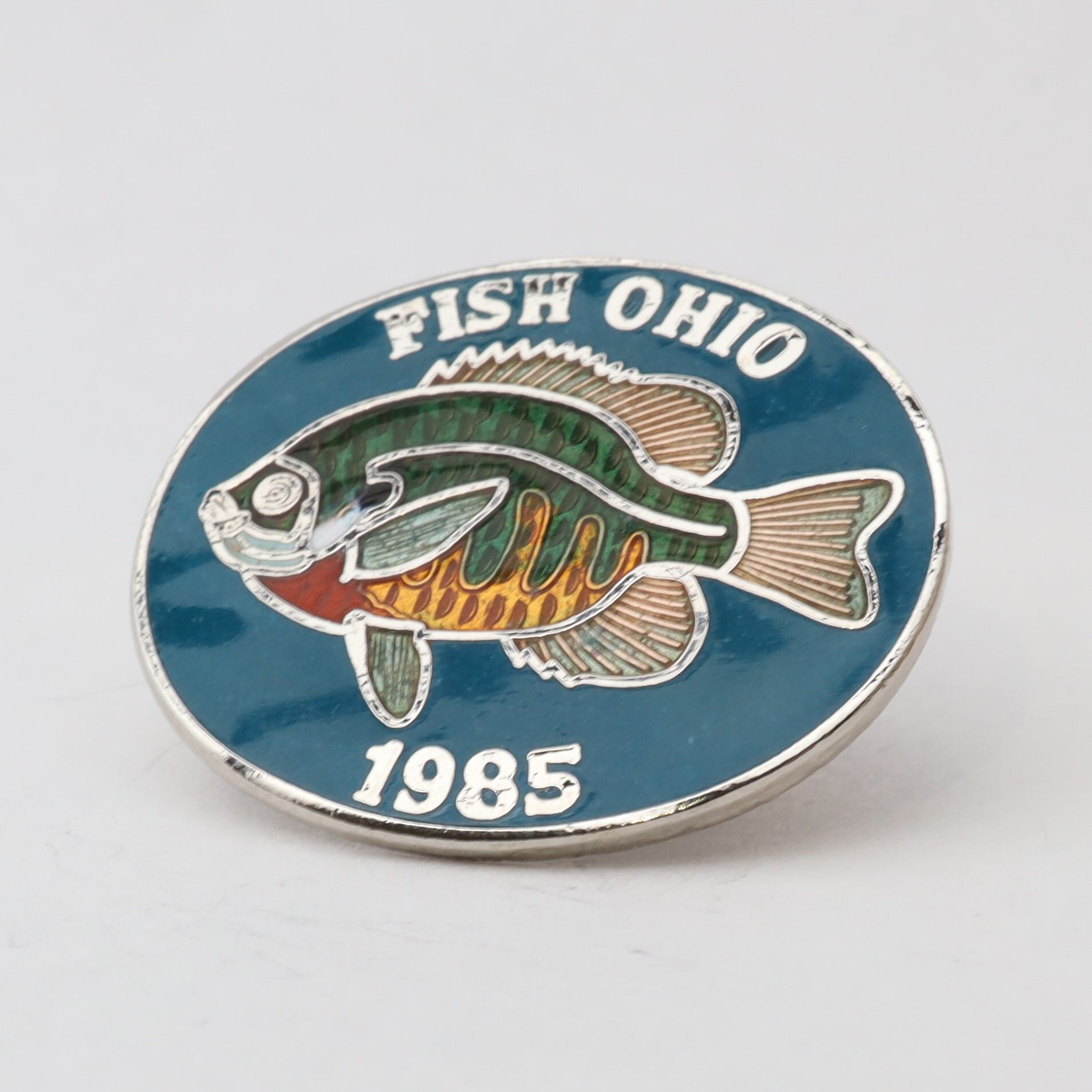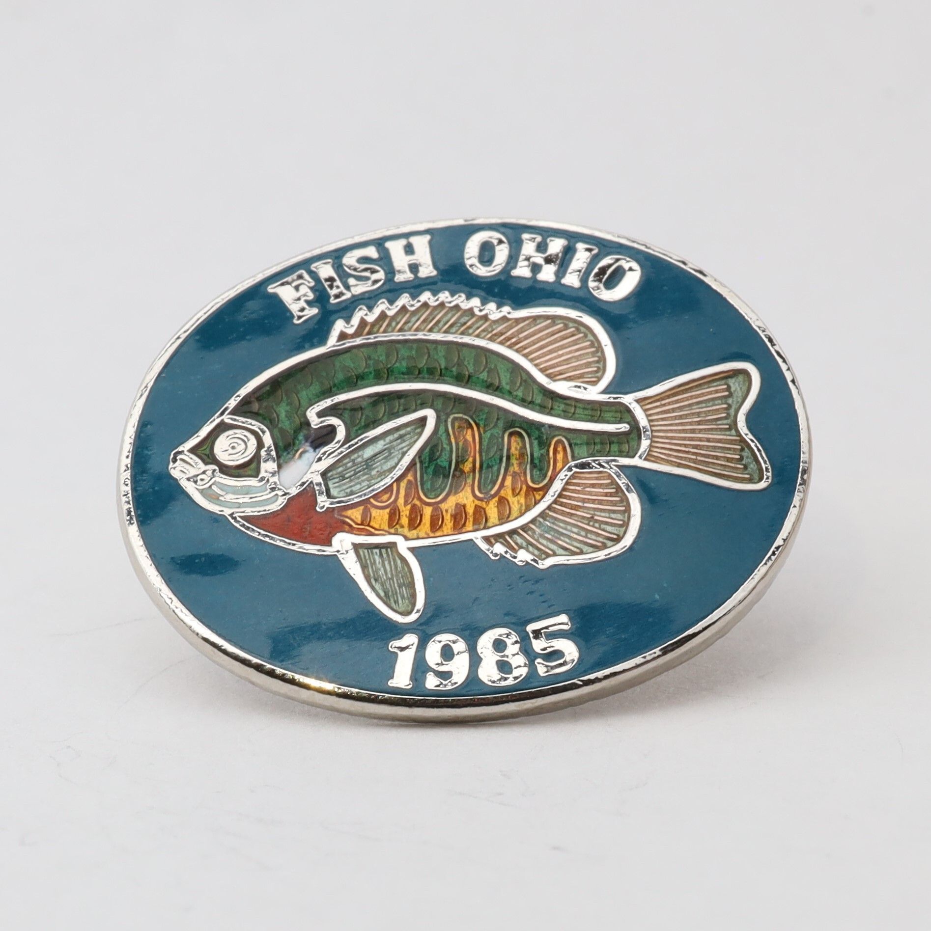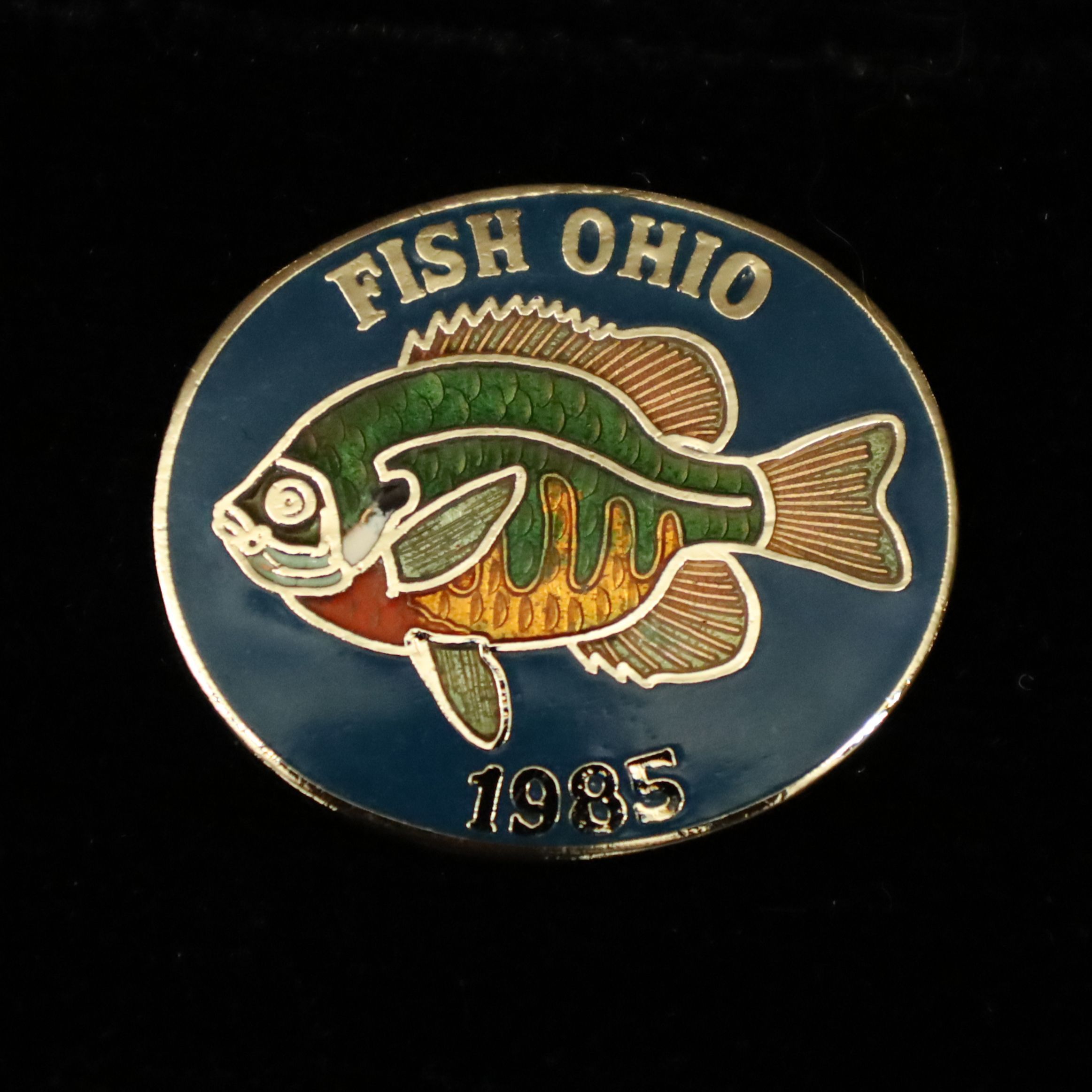 The 1985 Fish Ohio pin features a bluegill sunfish. The sunfish is enameled with green, yellow, and red scales on a blue background. Fish Ohio and the date are in silver along the border.Context