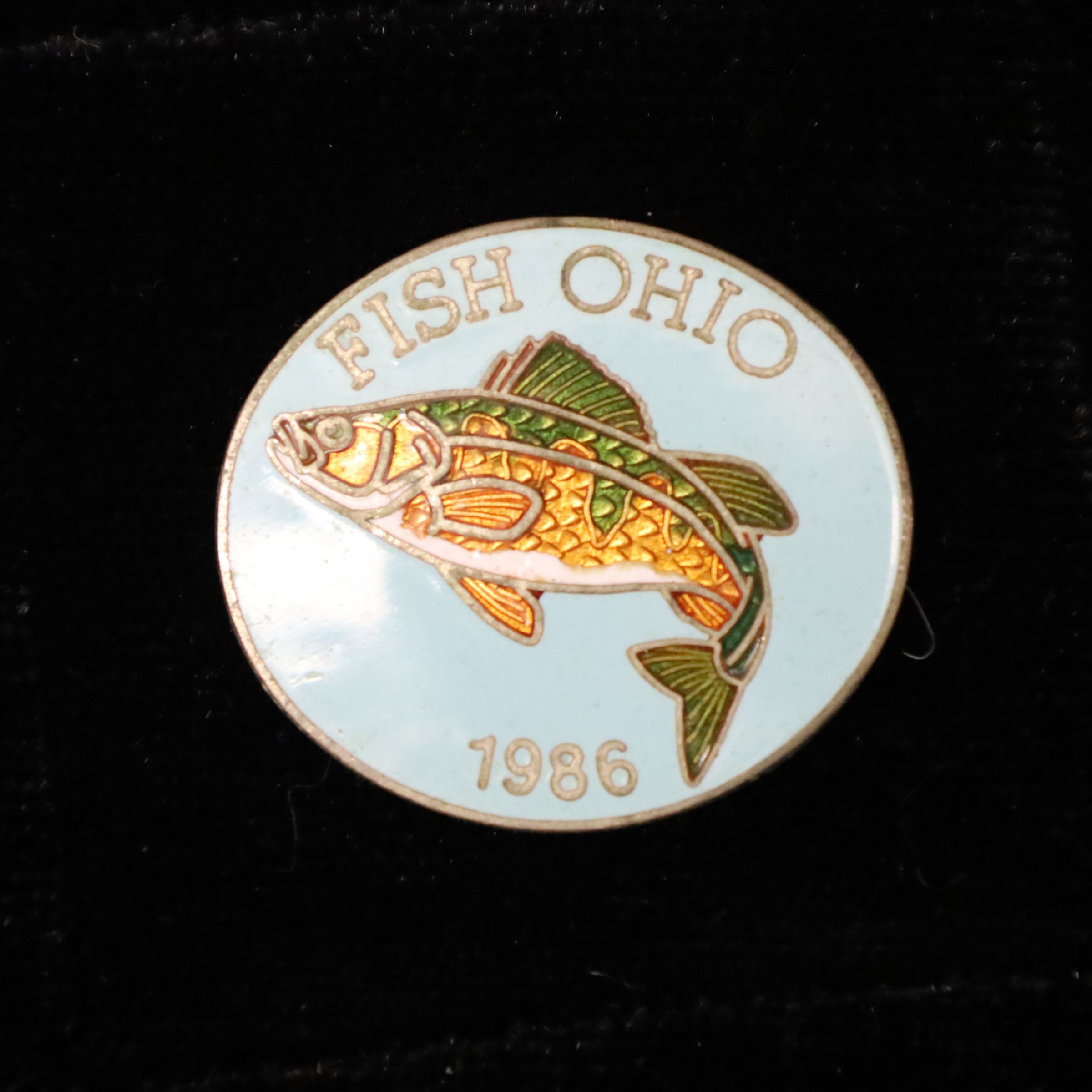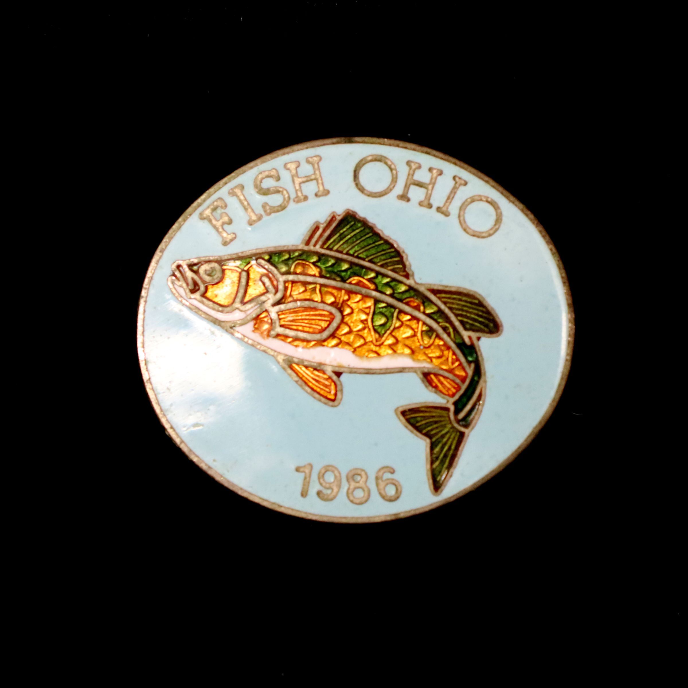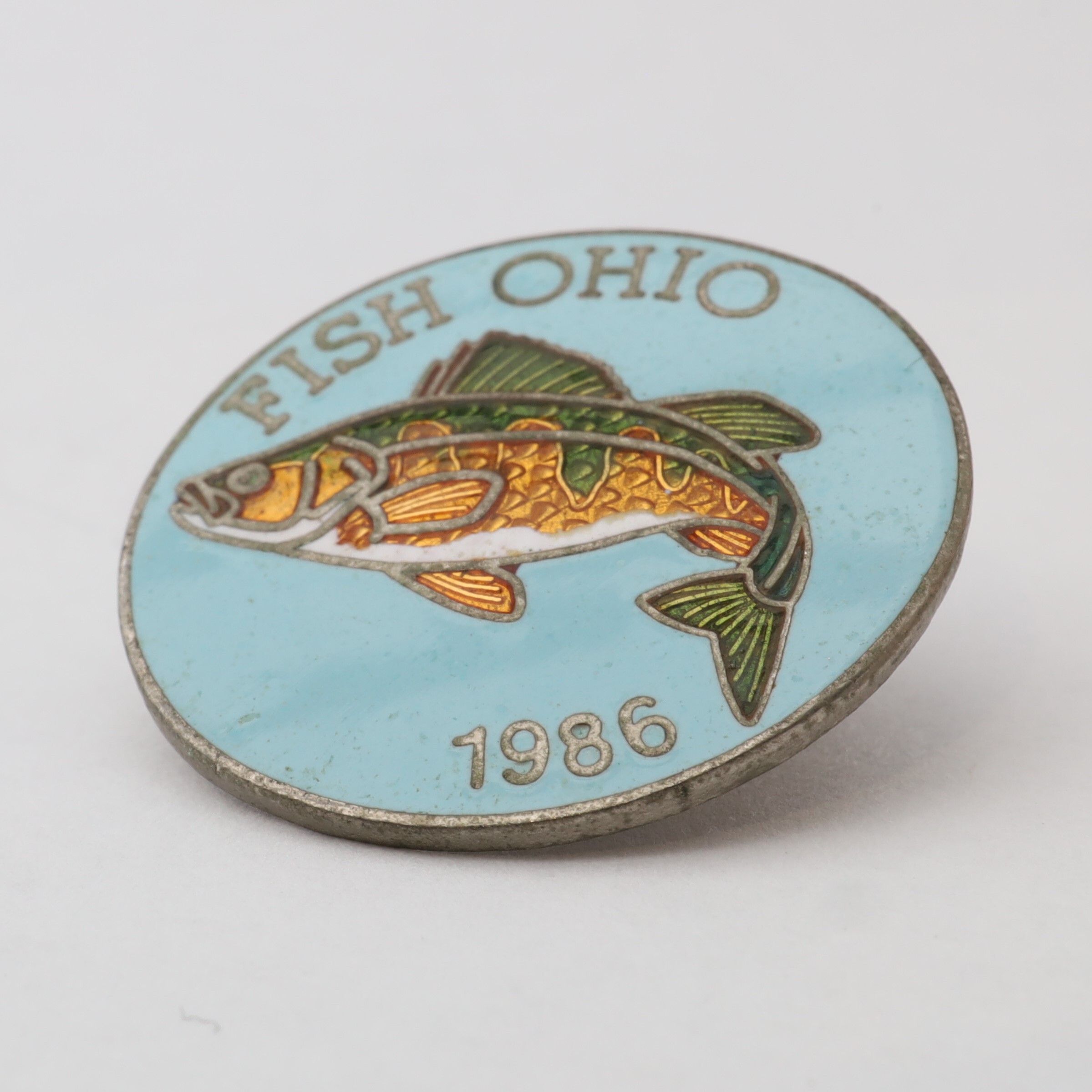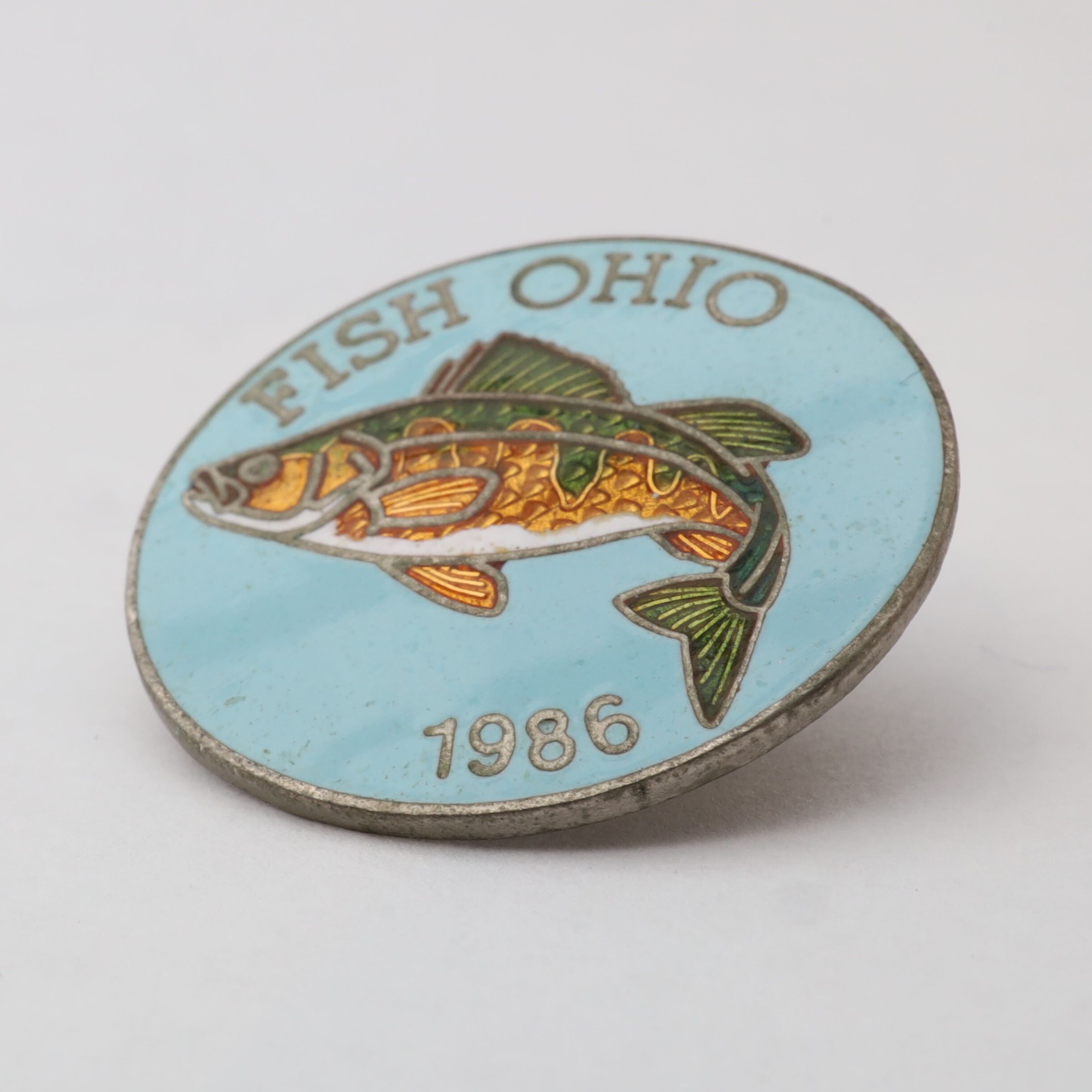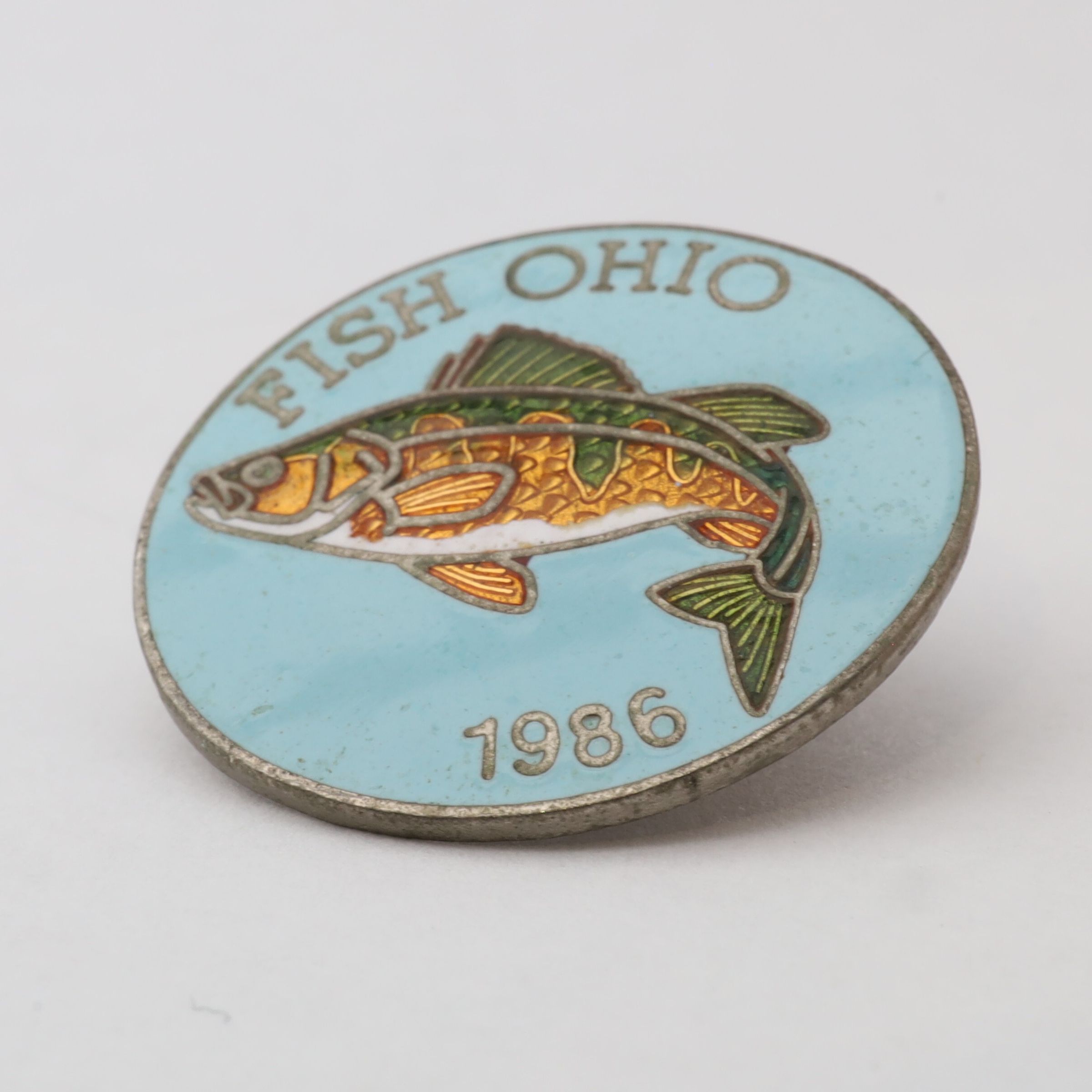 The 1986 Fish Ohio pin features a yellow perch. The perch has green and yellow fins and a white belly on a light blue background. Fish Ohio and the date are in silver around the border.Use