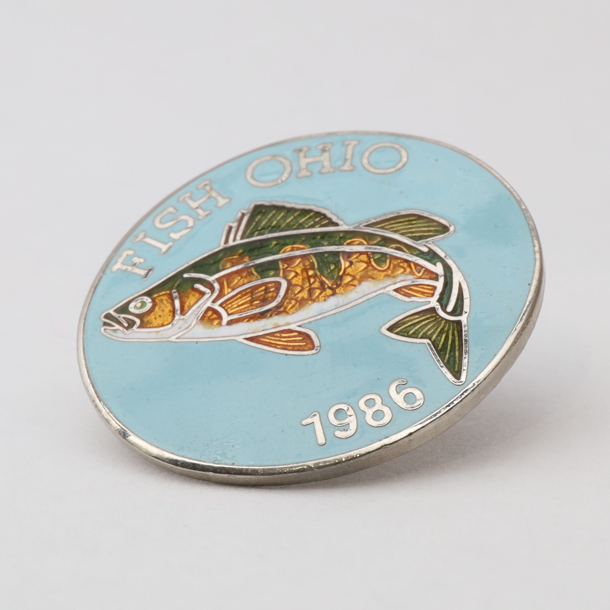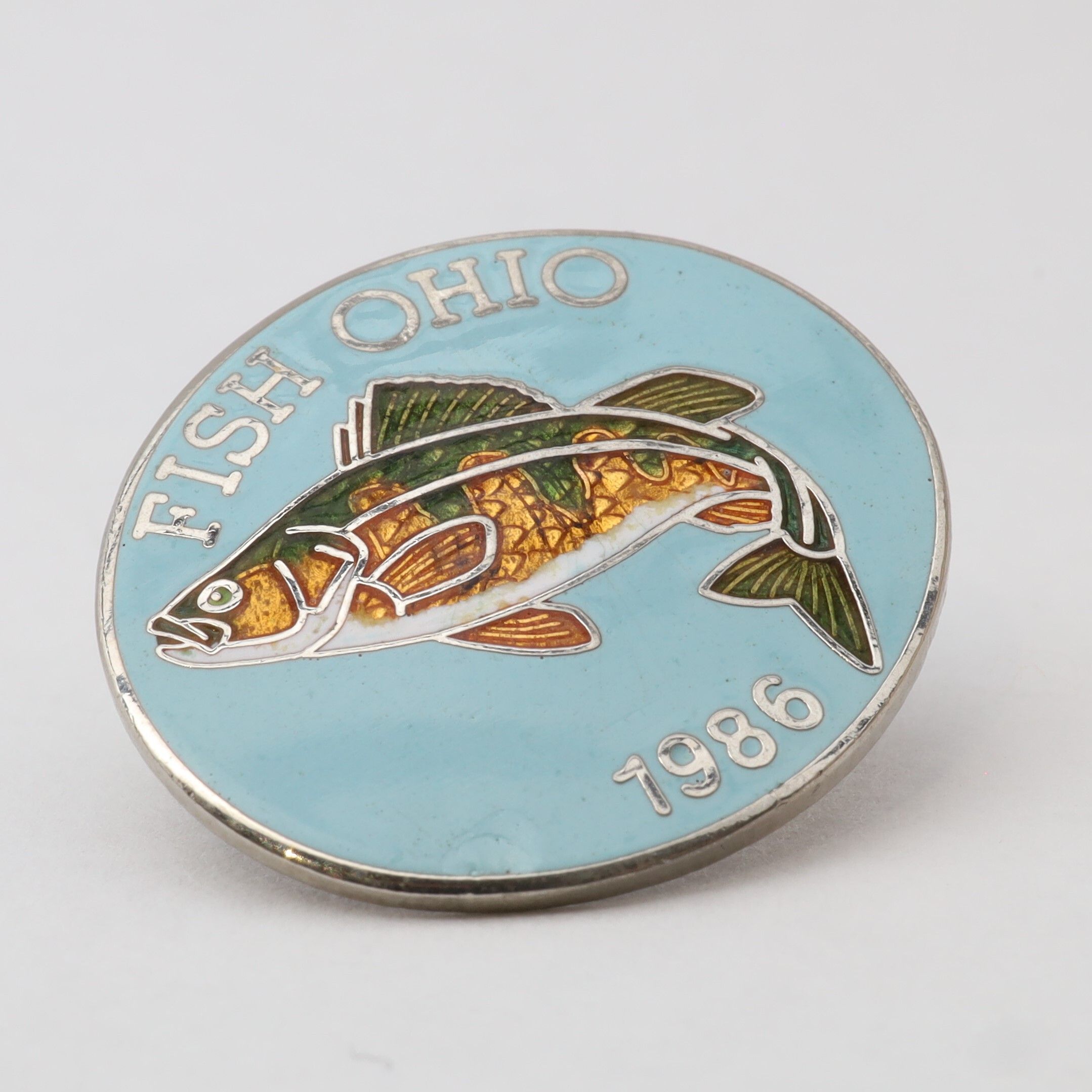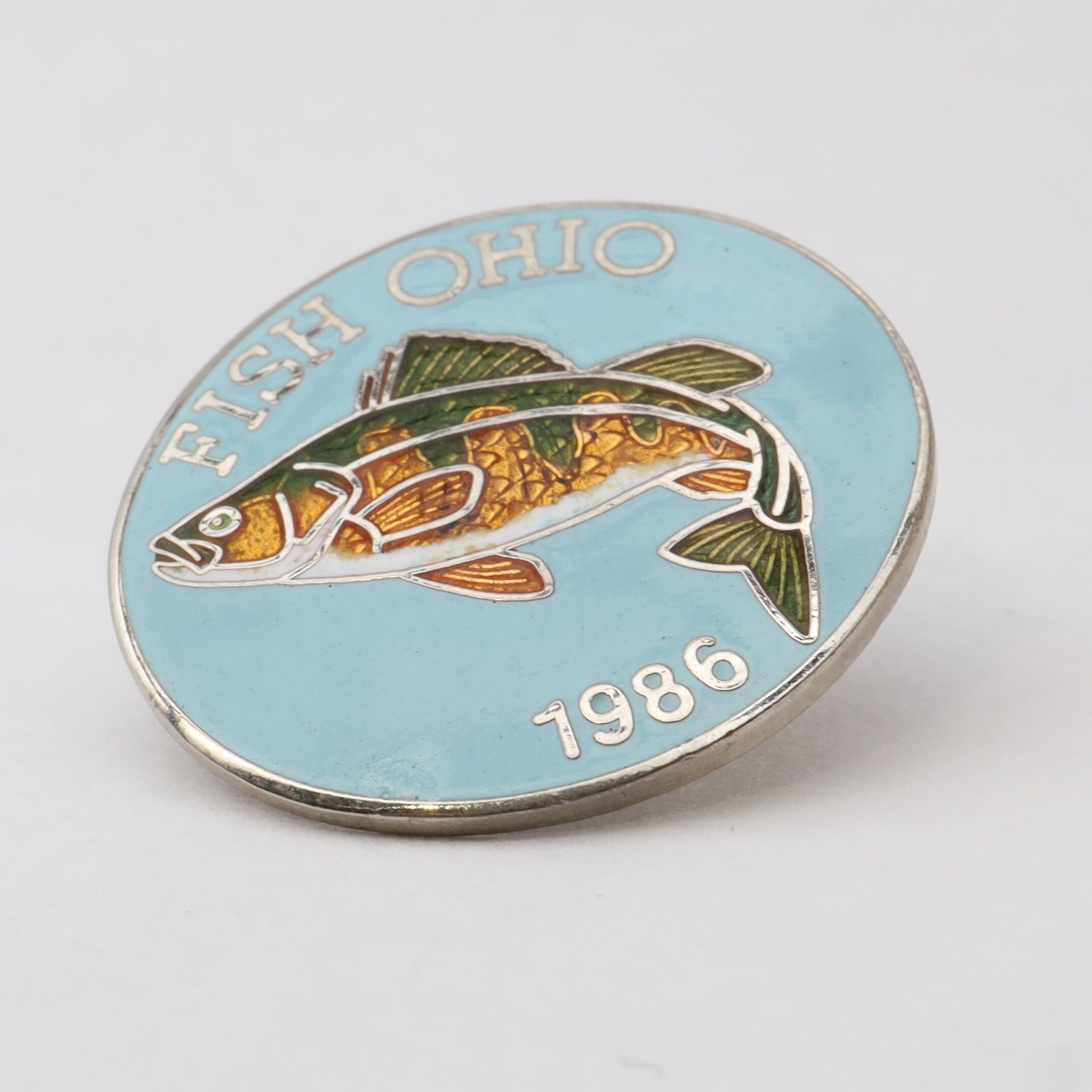 Prototype of the 1986 Fish Ohio pin featuring yellow perch.Context