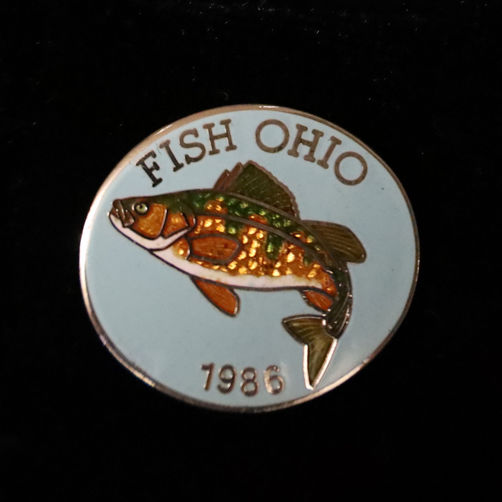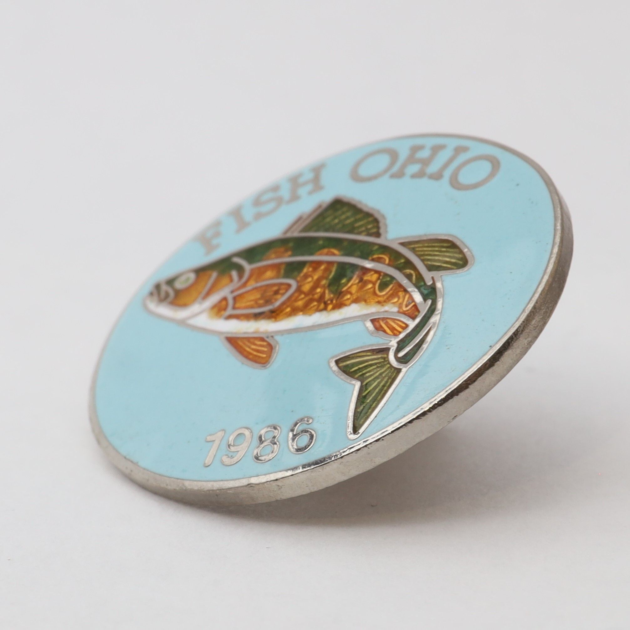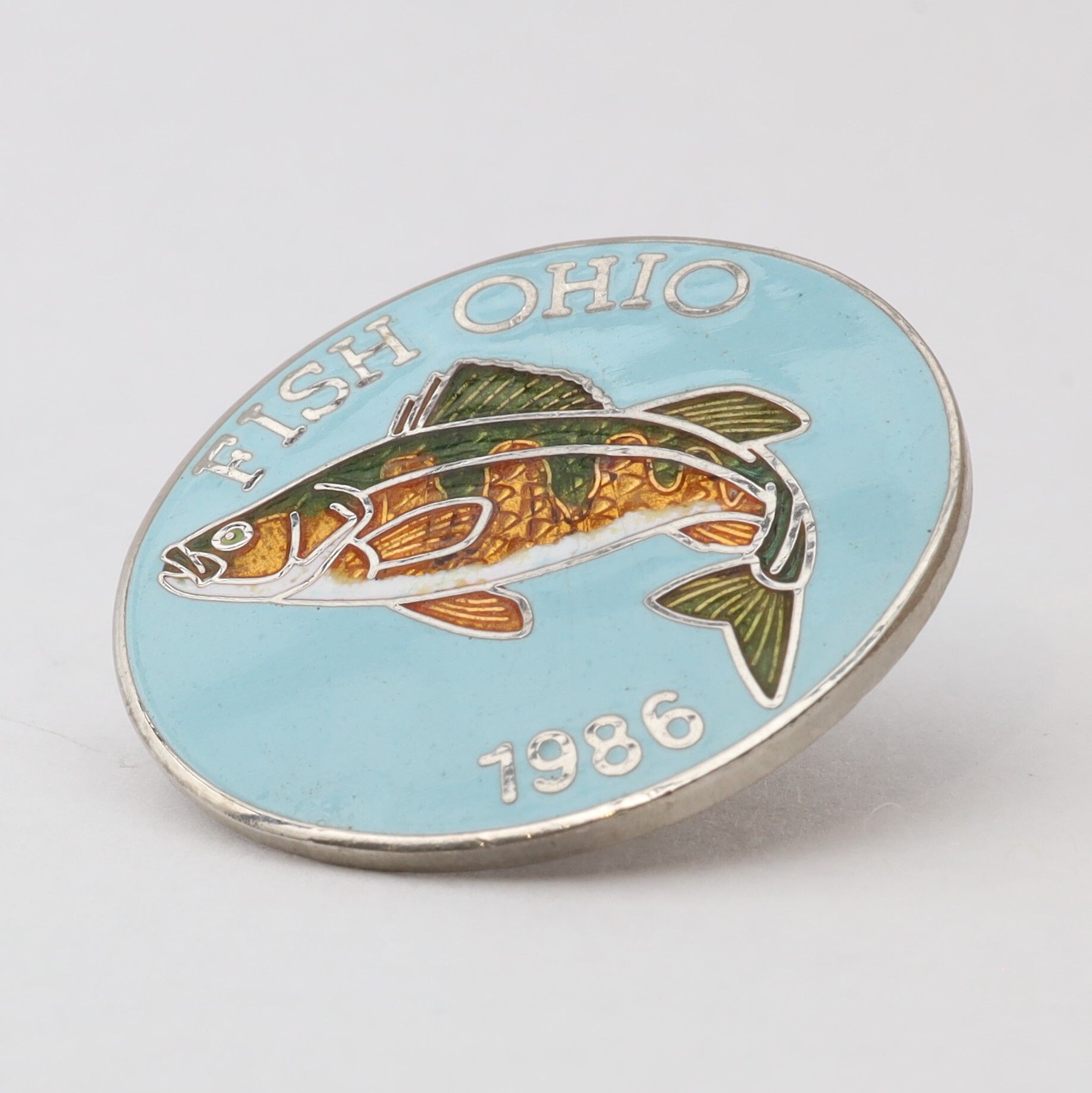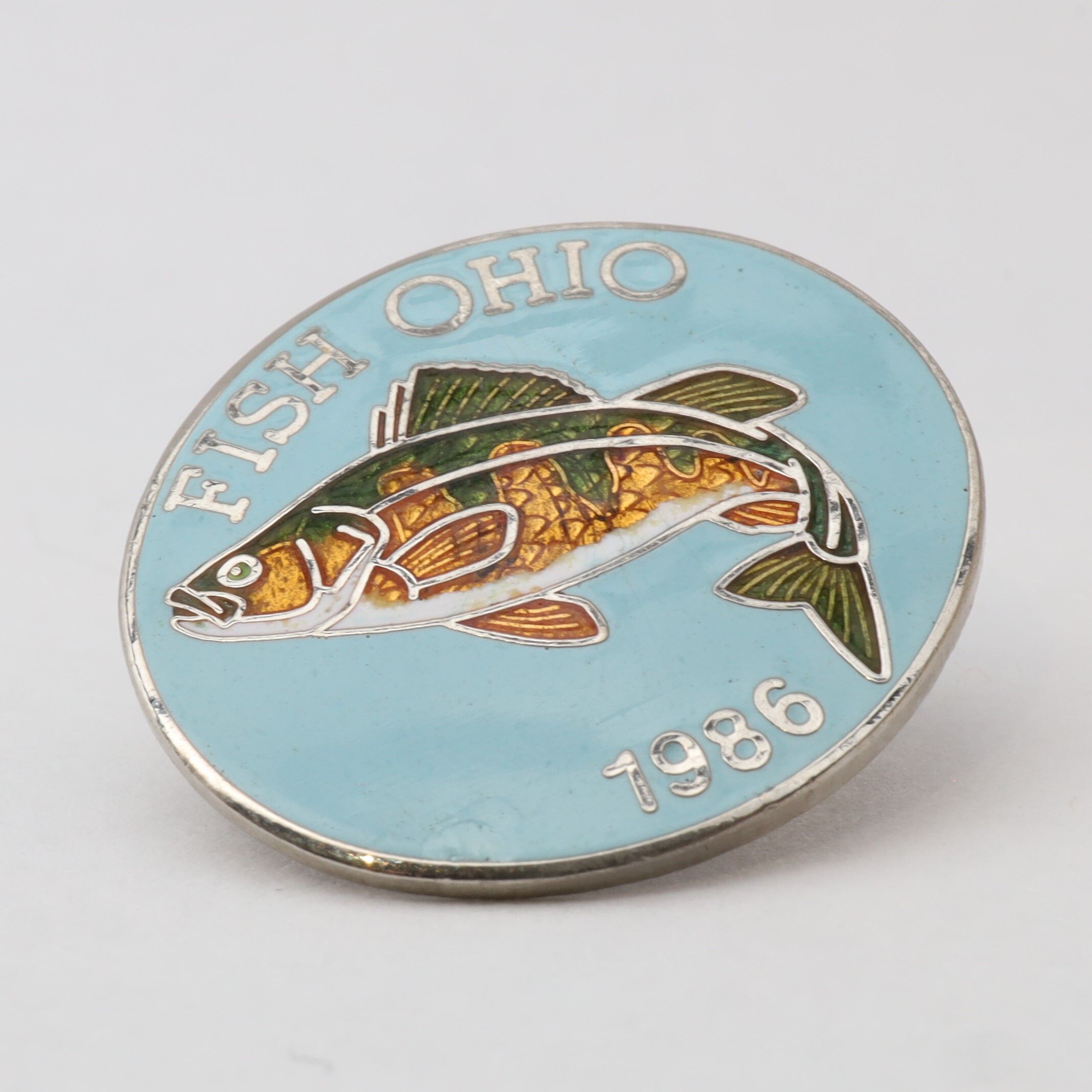 Prototype of the 1986 Fish Ohio pin featuring yellow perch.Context