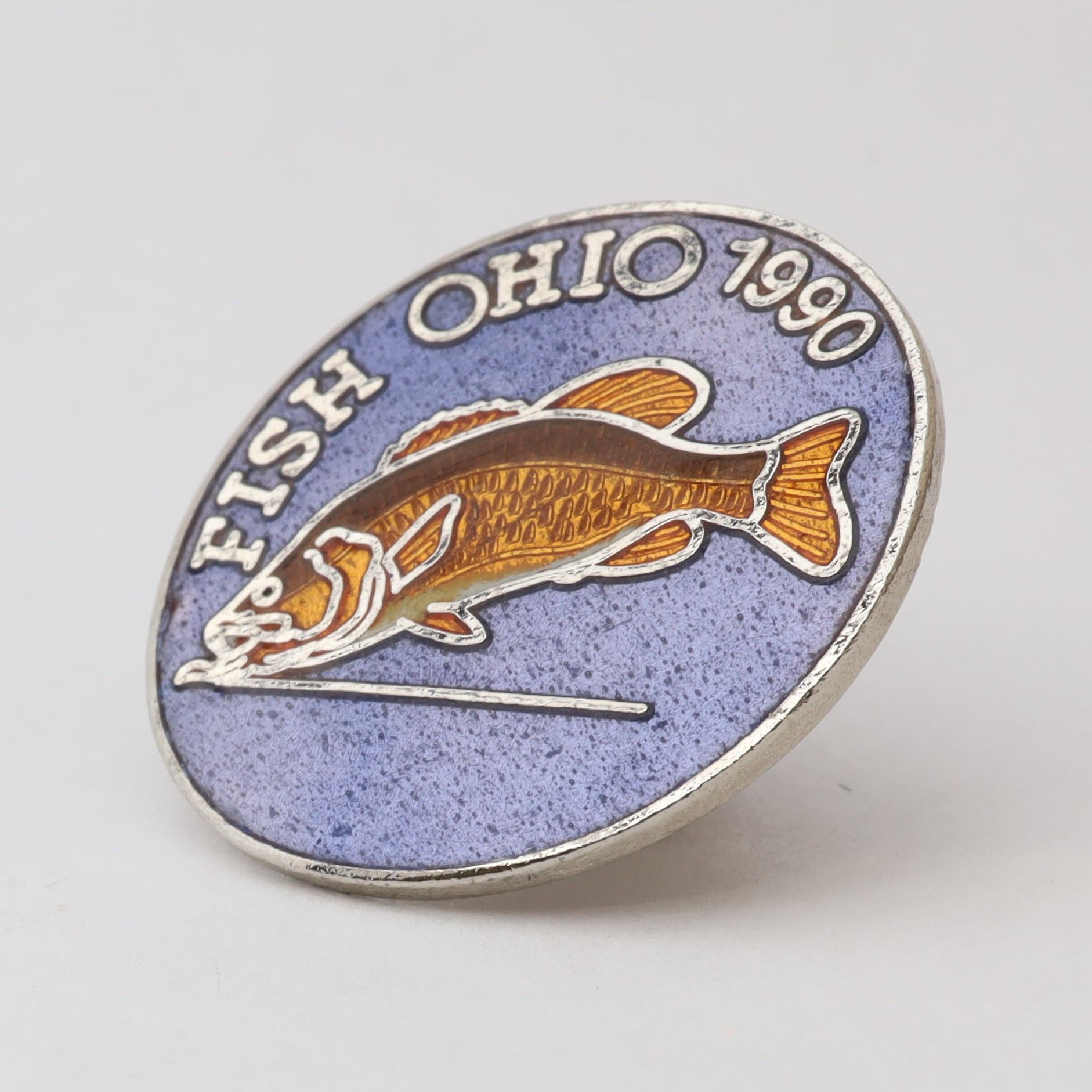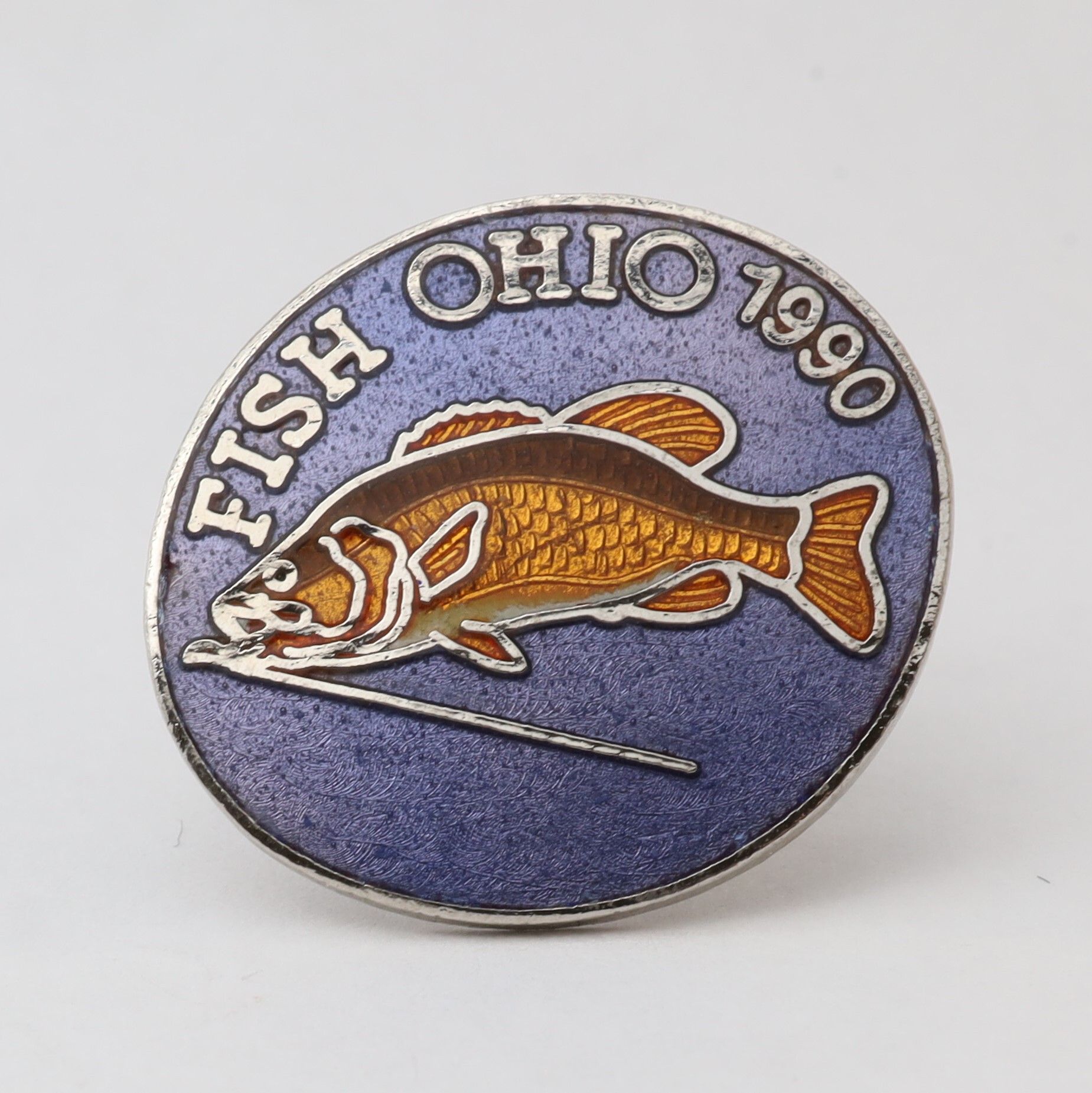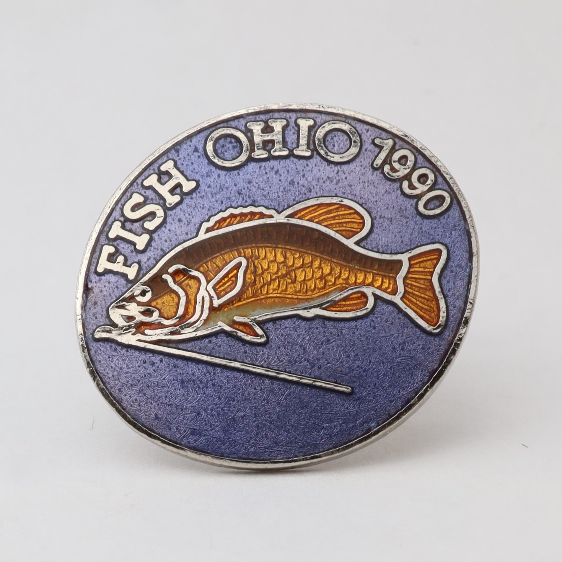 The 1990 Fish Ohio pin features a smallmouth bass. The fins and scales of the bass are orange with a little white on the belly. Fish Ohio and the date are in silver above the bass on a dark blue background.Context