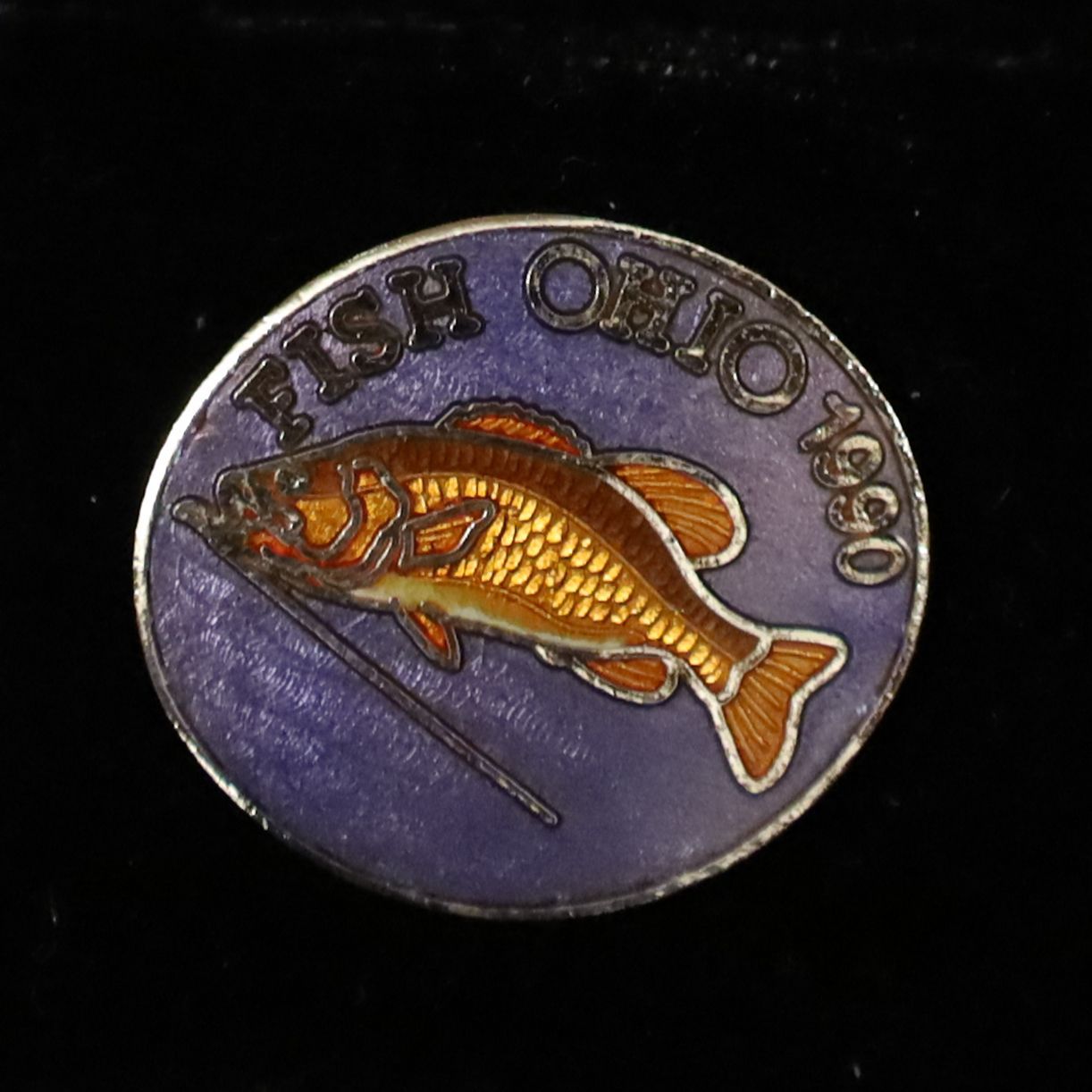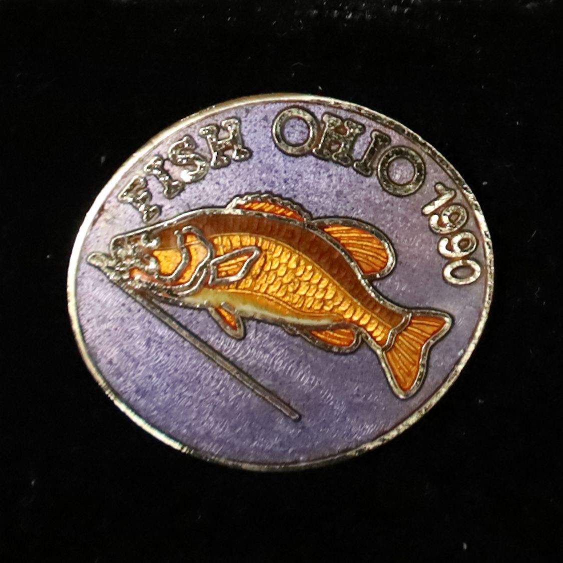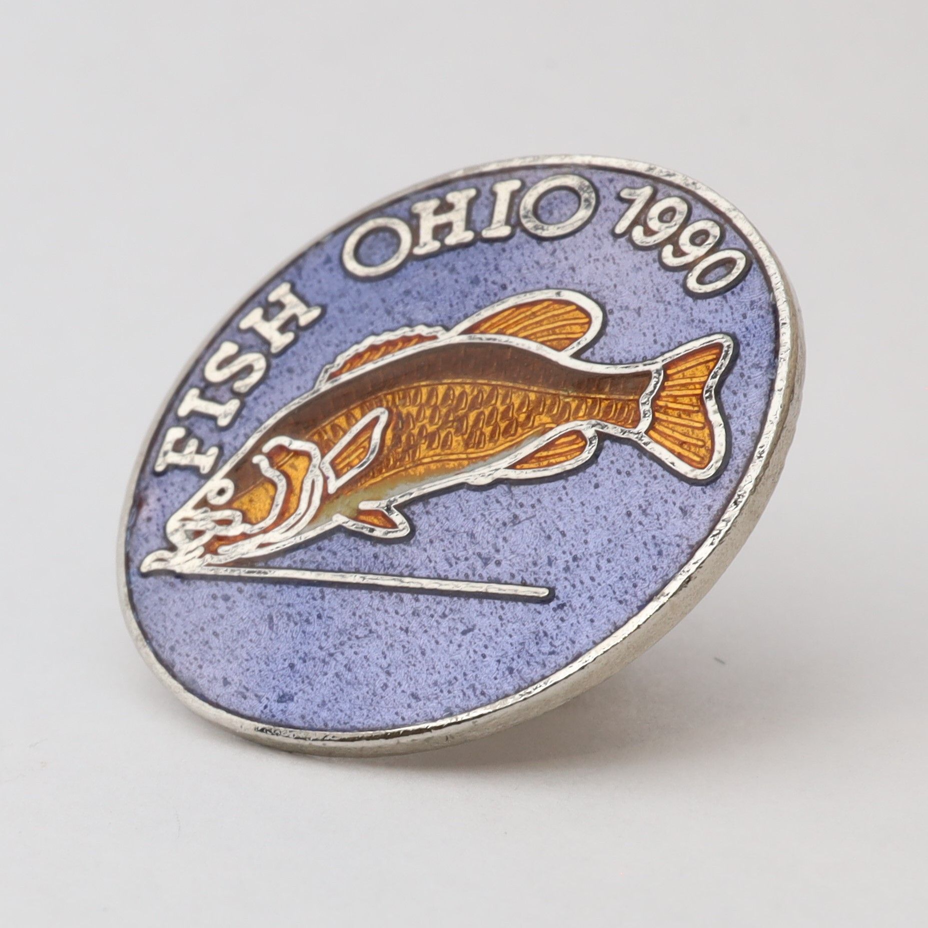 The 1990 Fish Ohio pin features a smallmouth bass. The fins and scales of the bass are orange with a little white on the belly. Fish Ohio and the date are in silver above the bass on a dark blue background.Context