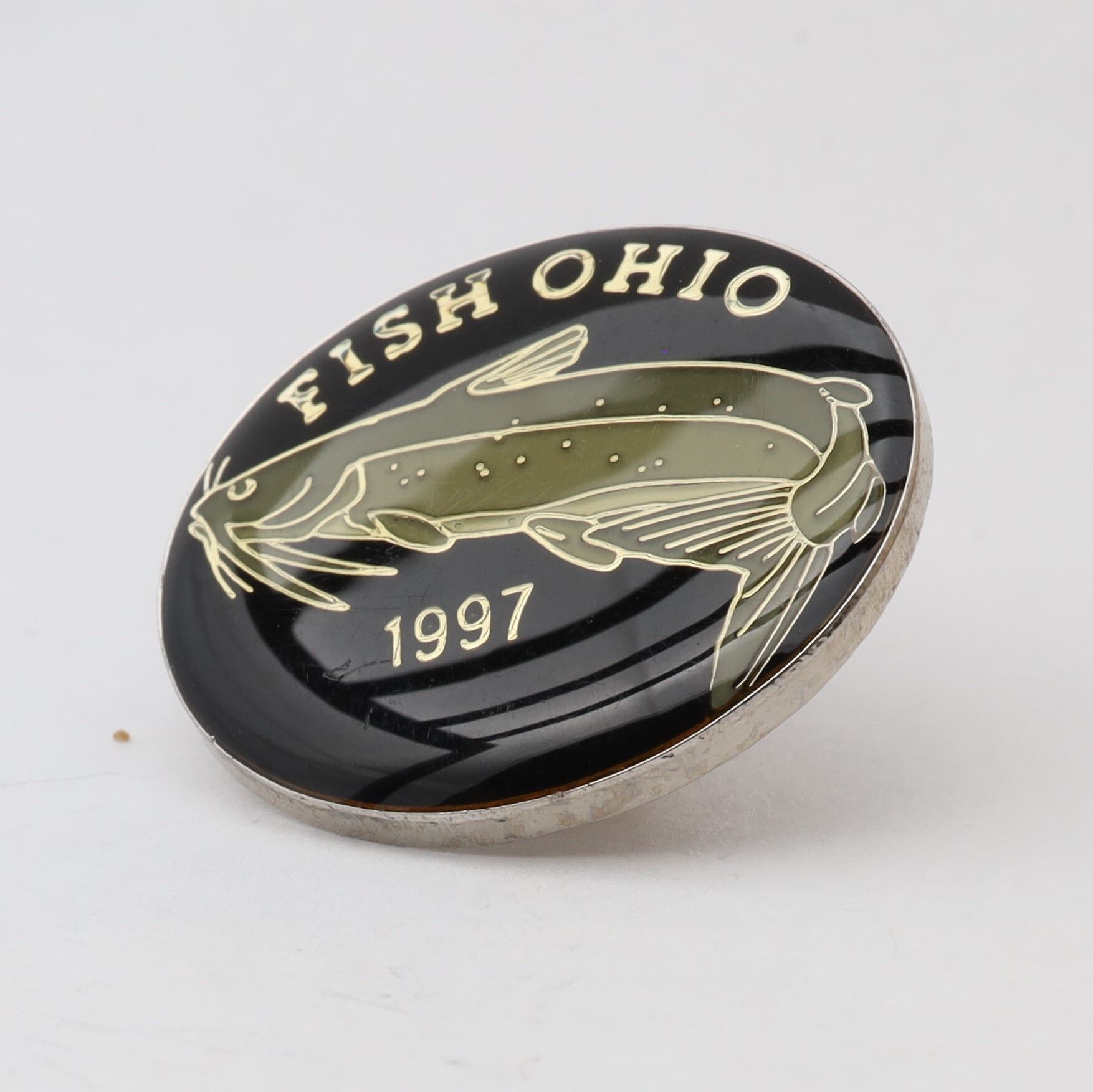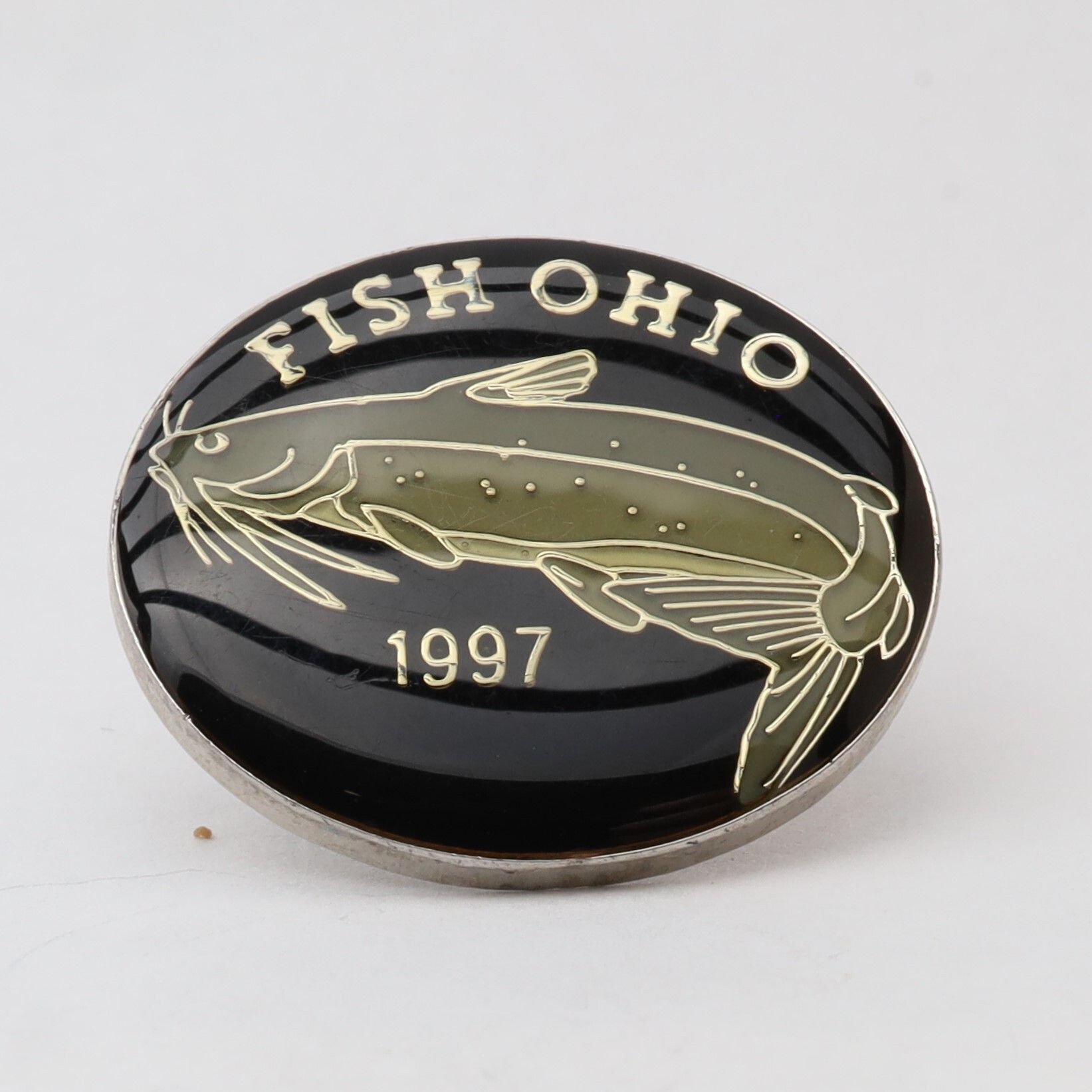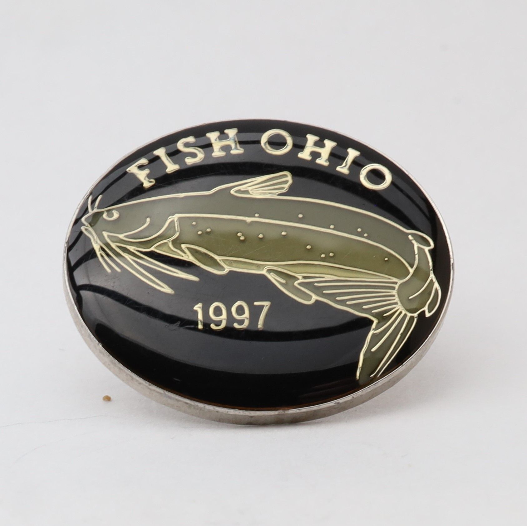 The 1997 Fish Ohio pin features a channel catfish. The catfish is enameled in grey-green on a black background. Fish Ohio and the year are in silver above and below the fish.Context