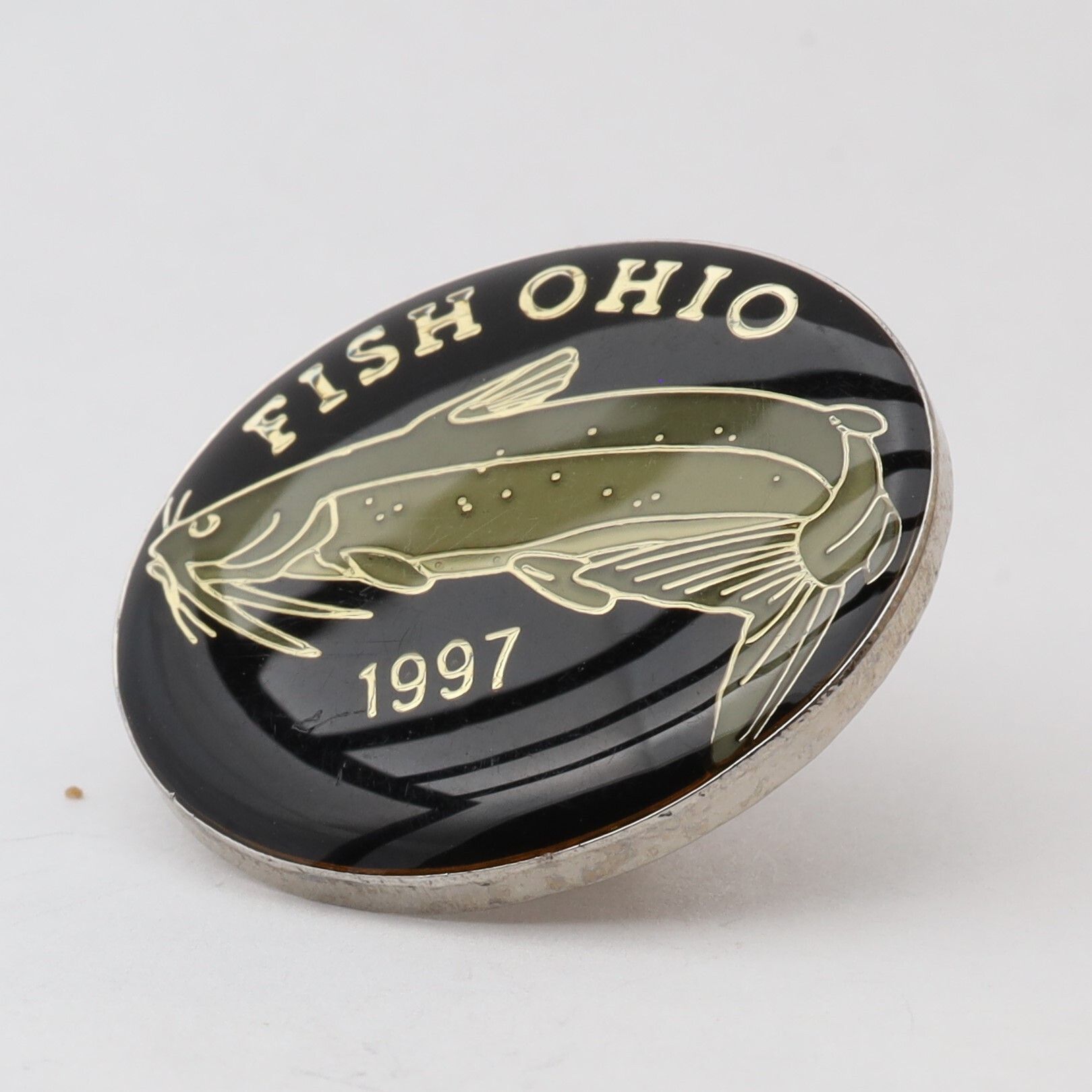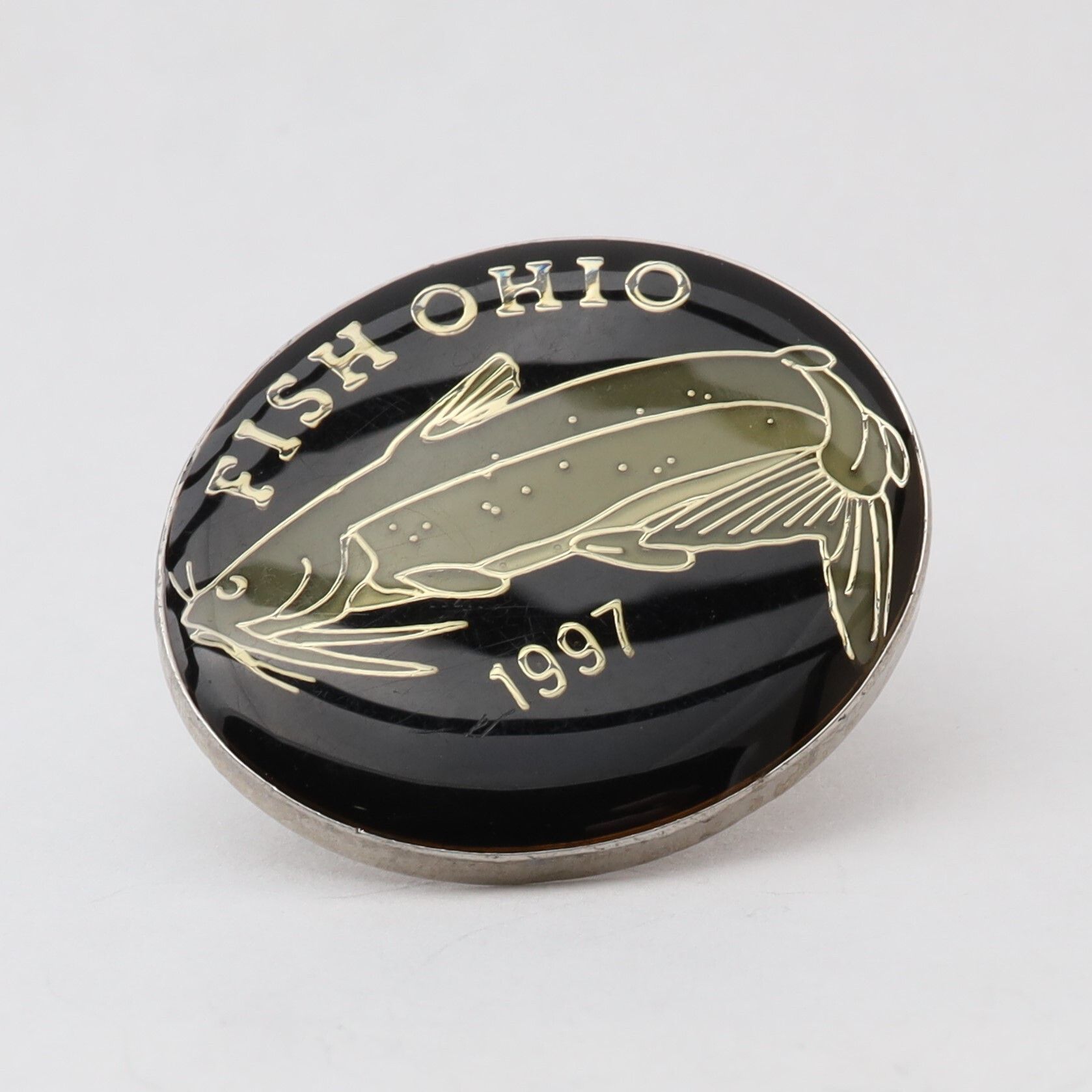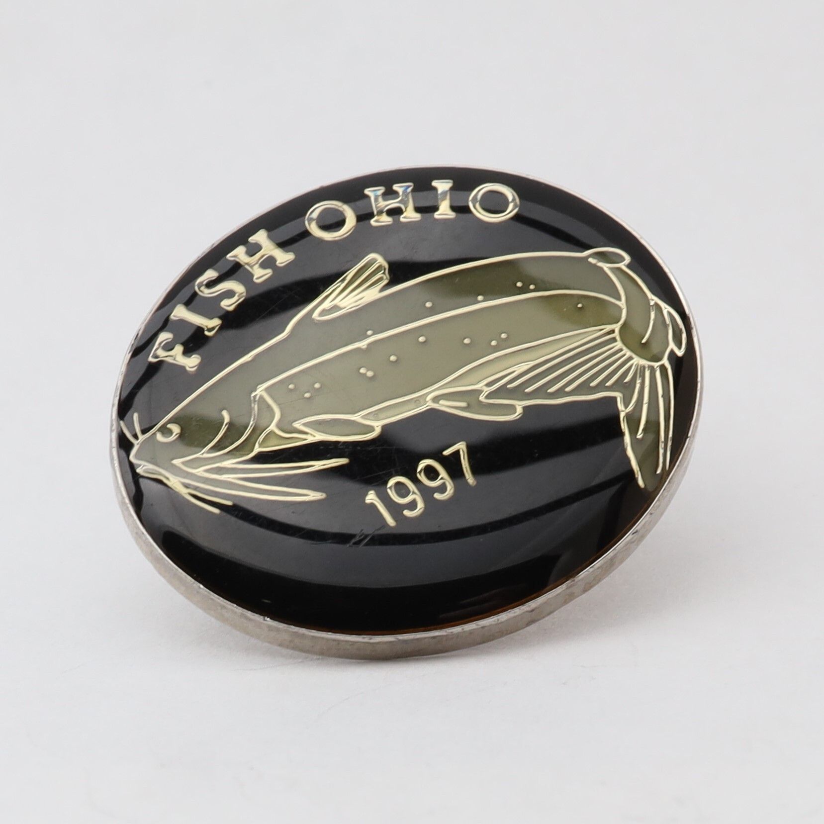 The 1997 Fish Ohio pin features a channel catfish. The catfish is enameled in grey-green on a black background. Fish Ohio and the year are in silver above and below the fish.Context