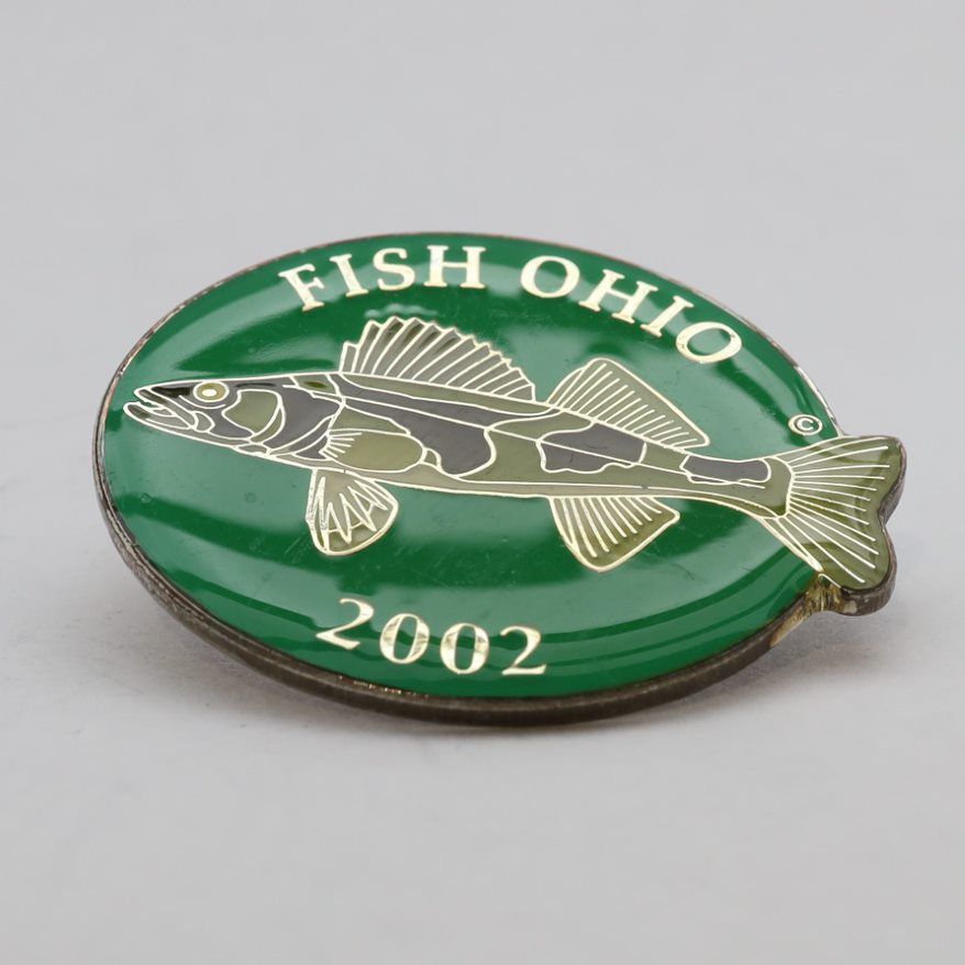 The 2002 Fish Ohio pin features a saugeye. On a dark green enameled background, the fish is mainly a dull green with some areas of darker brown green. Fish Ohio is in silver above the saugeye and the date is below the fish.