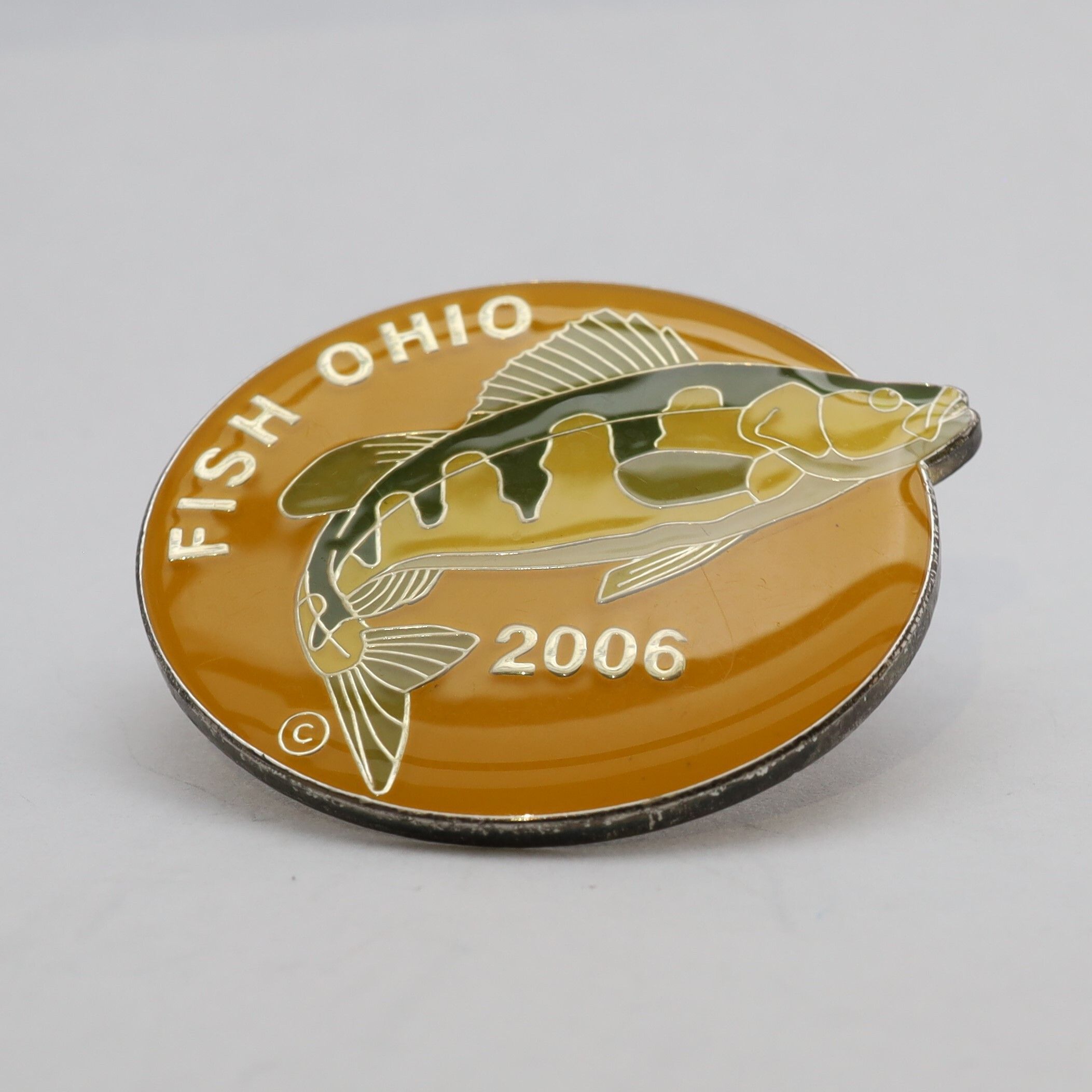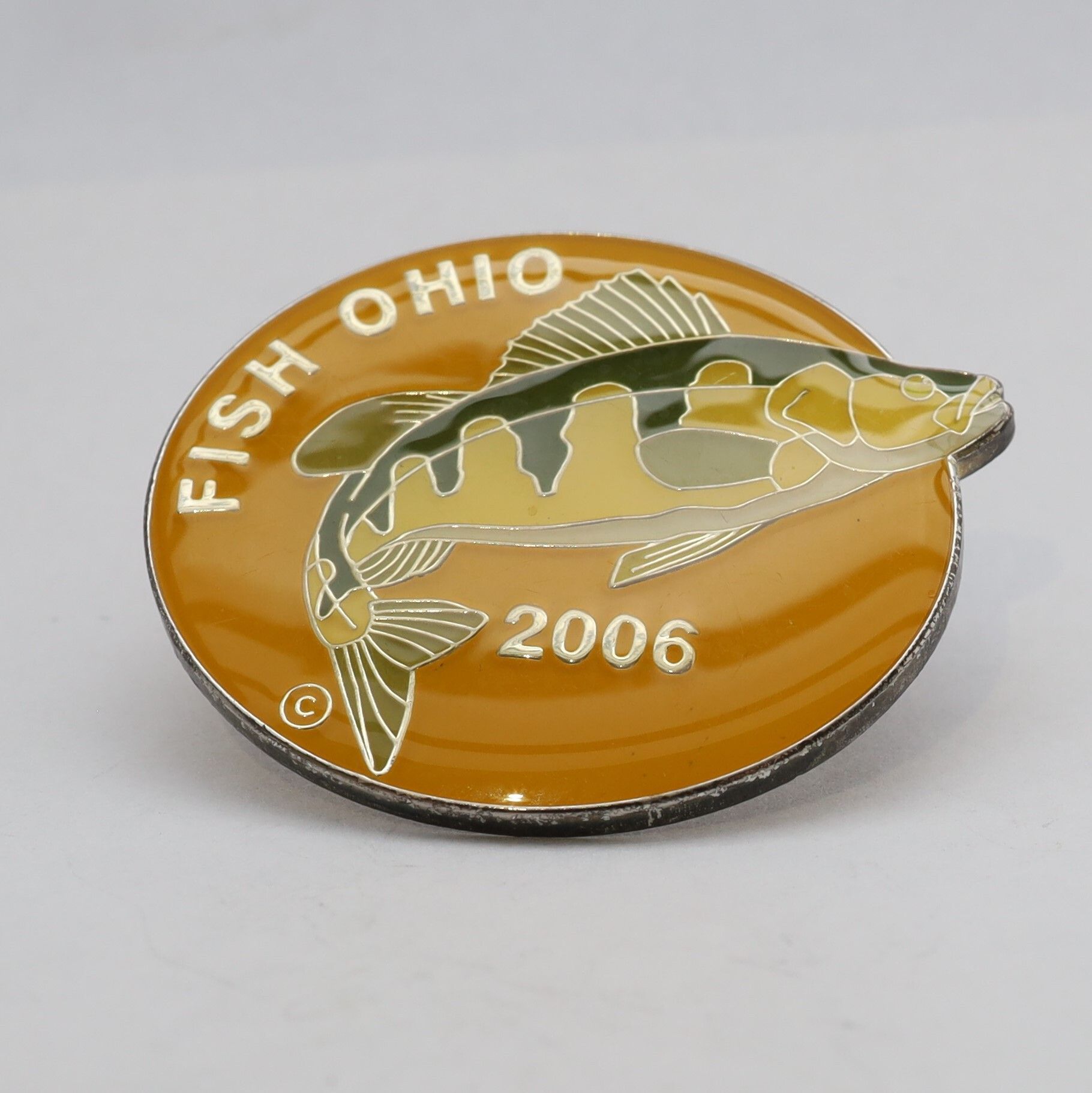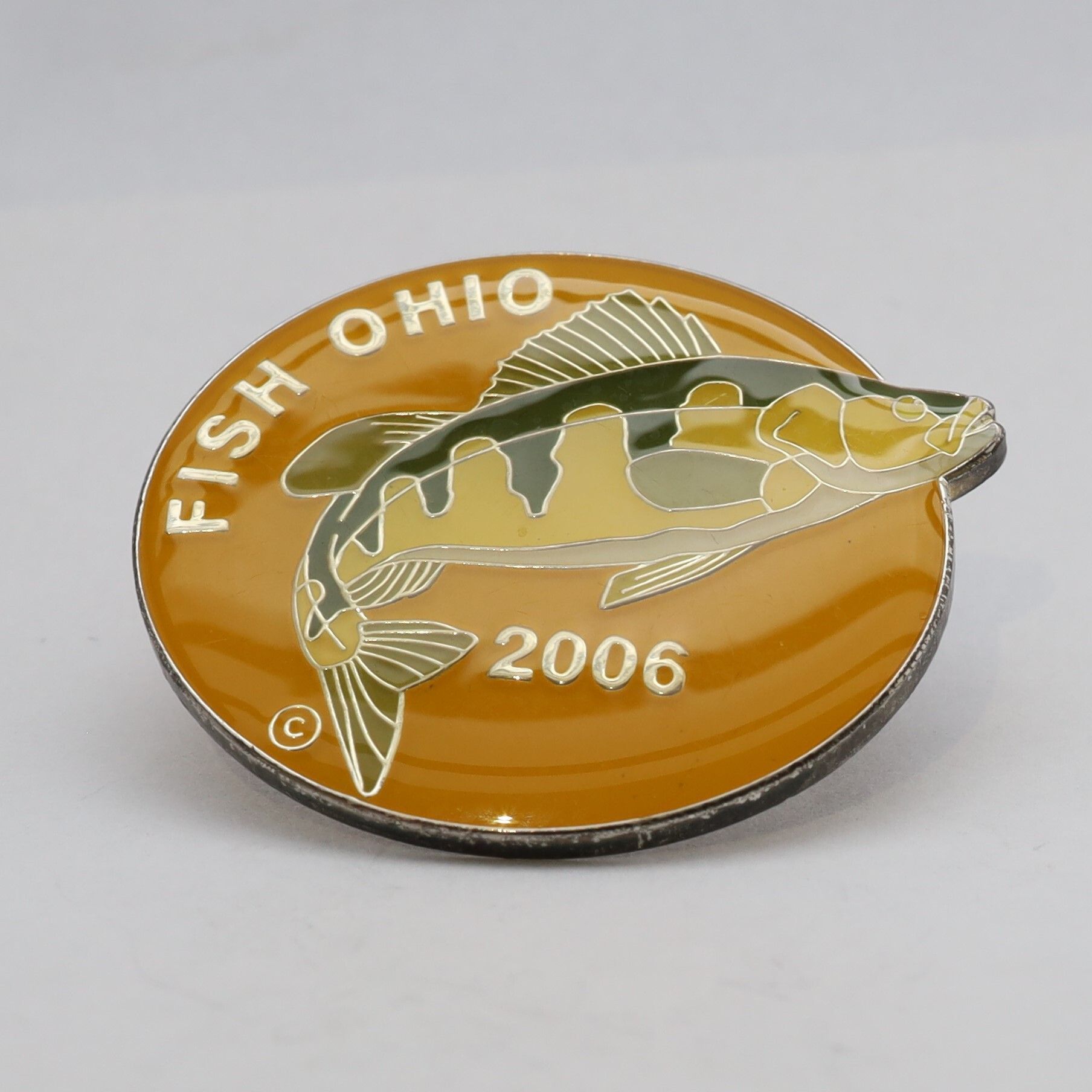 The 2006 Fish Ohio pin features a yellow perch. The fish is enameled in yellow and brown with a lighter belly and fins on a dark orange background. The mouth of the perch extends slightly past the edge of the circular pin. Fish Ohio is in silver along the edge of the circle above the fish. The date is in silver below the perch.Context