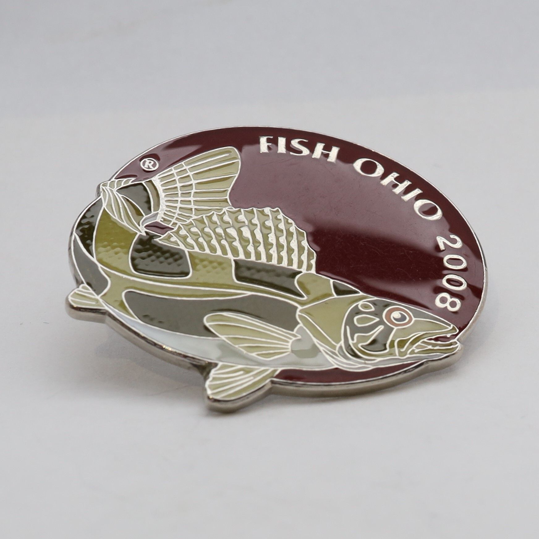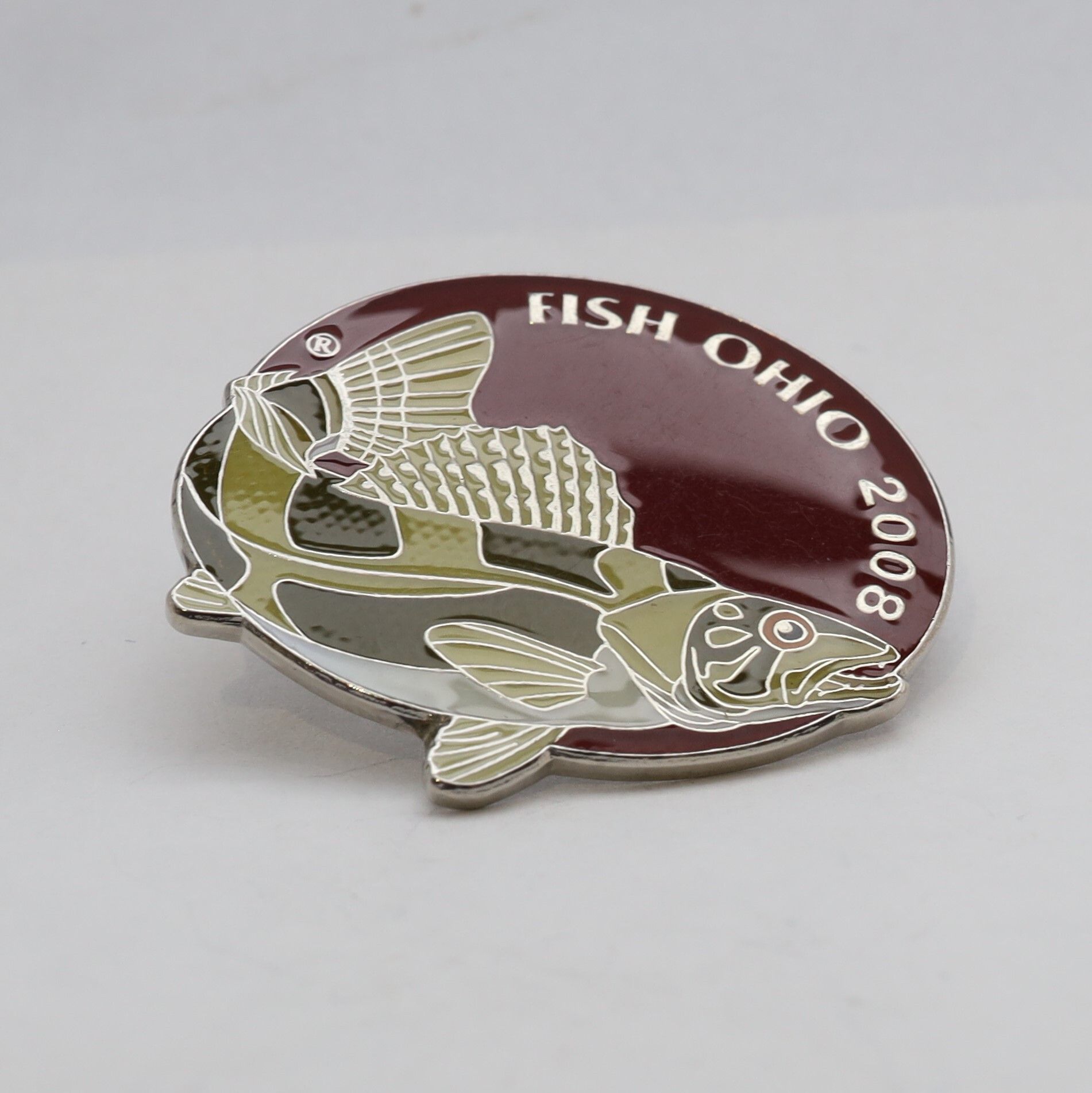The 2008 Fish Ohio pin features a sauger. The fish is enameled in shades of green-brown with a light belly. The eye of the sauger is enameled with a clear pupil and iris. As with the 2007 pin featuring the largemouth bass, the sauger is positioned in a way to give the fish more depth. The head of the sauger is at the bottom of the circular pin, with some of the body and bottom fins extending over the edge. Fish Ohio and the date are in silver on the dark maroon background.Context