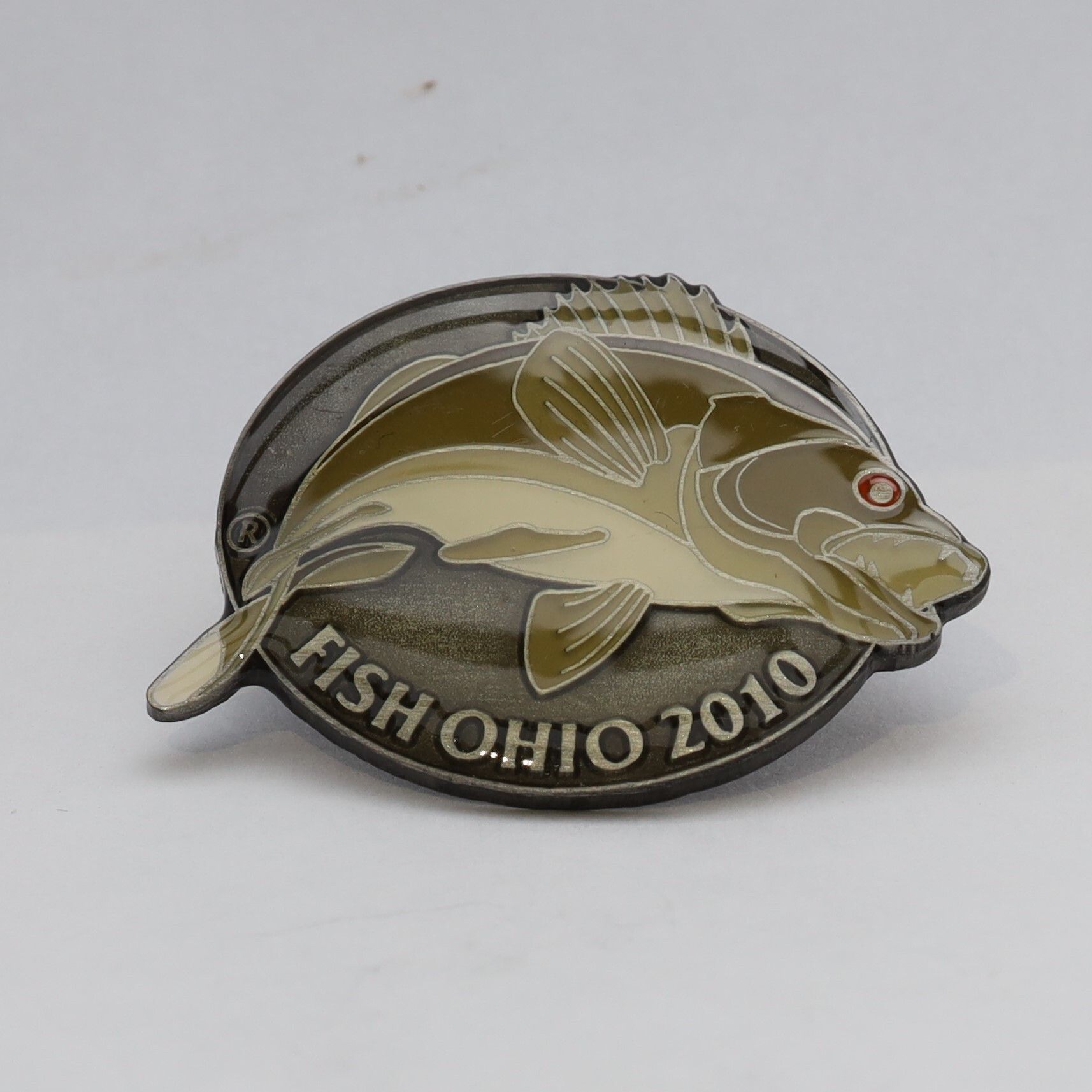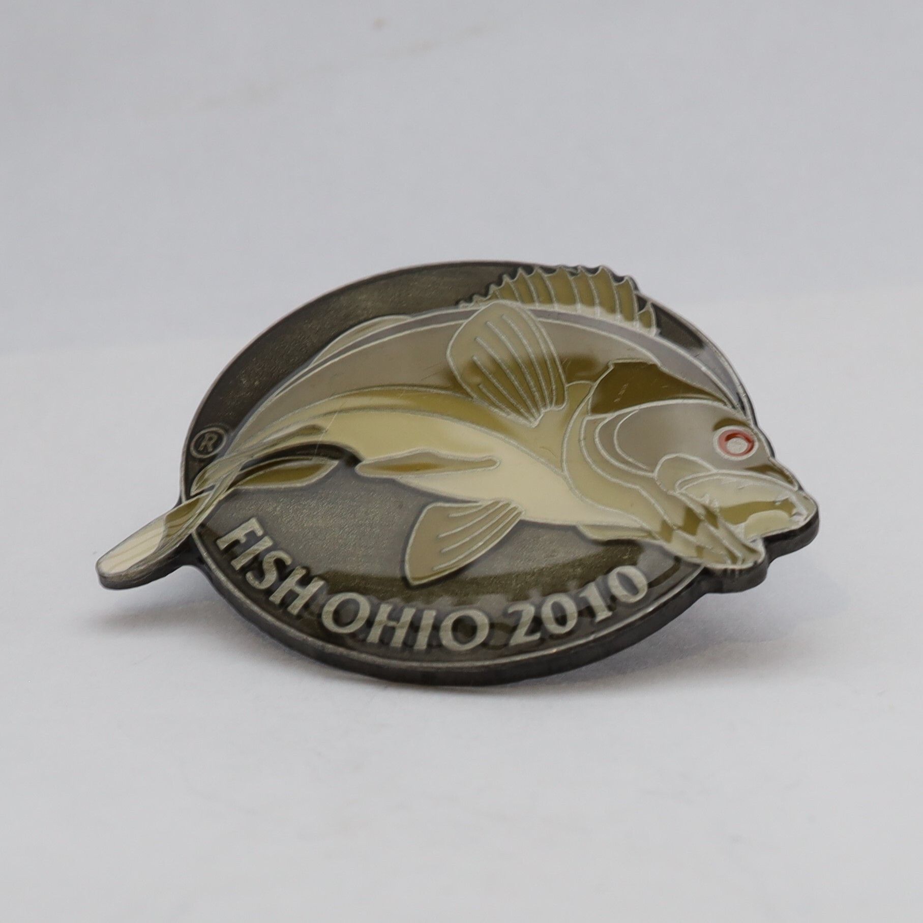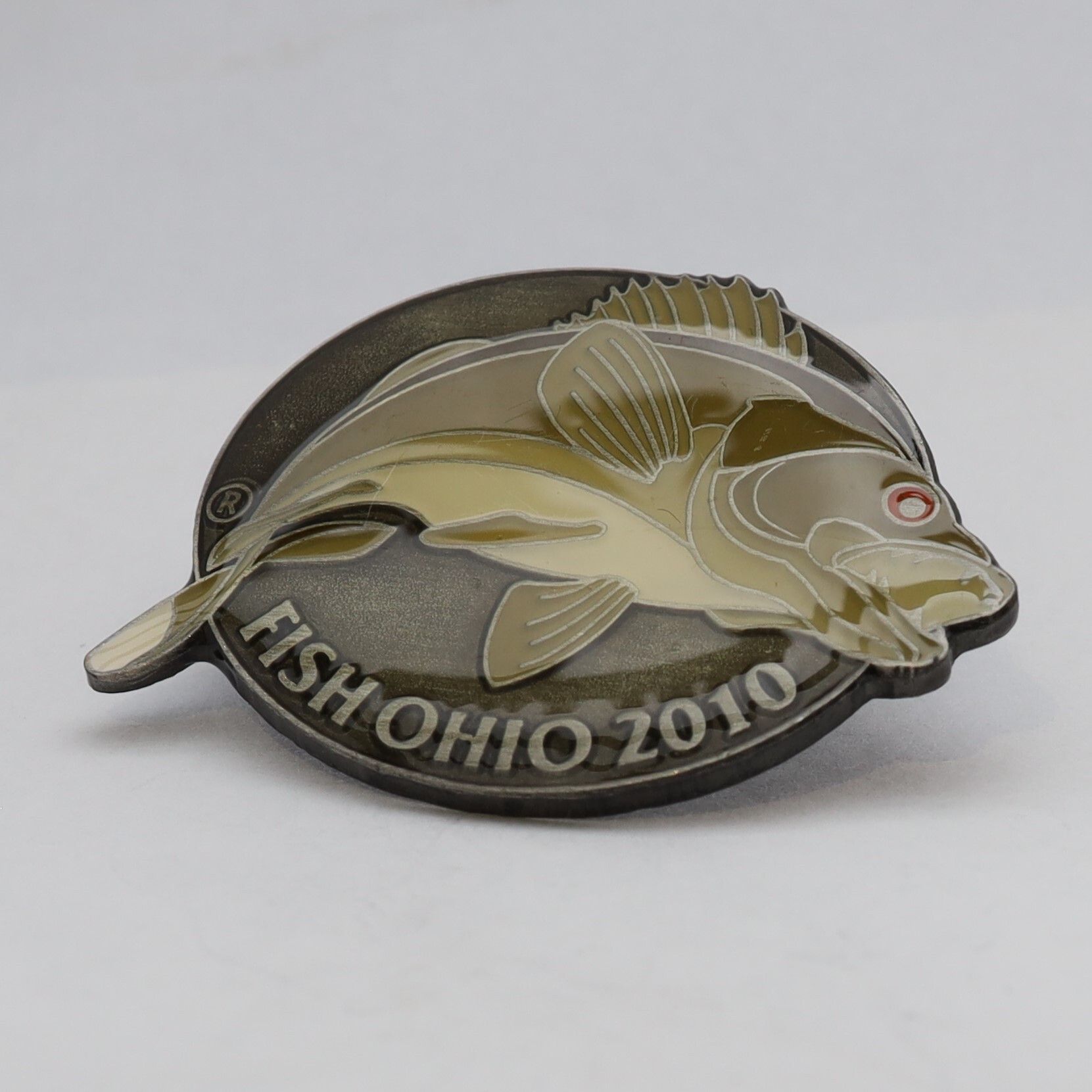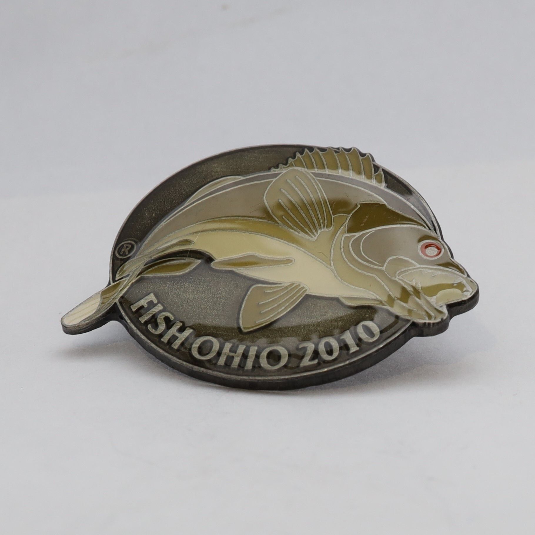 The 2010 Fish Ohio pin features a walleye. The fish is enameled in shades of brown with a red tinted eye. The fish is open mouthed and extends beyond the edges of the pin with its mouth, tail, and top fin. The background is not enameled other than the clear coat over the pin itself. Fish Ohio and the date are in silver under the walleye.Context