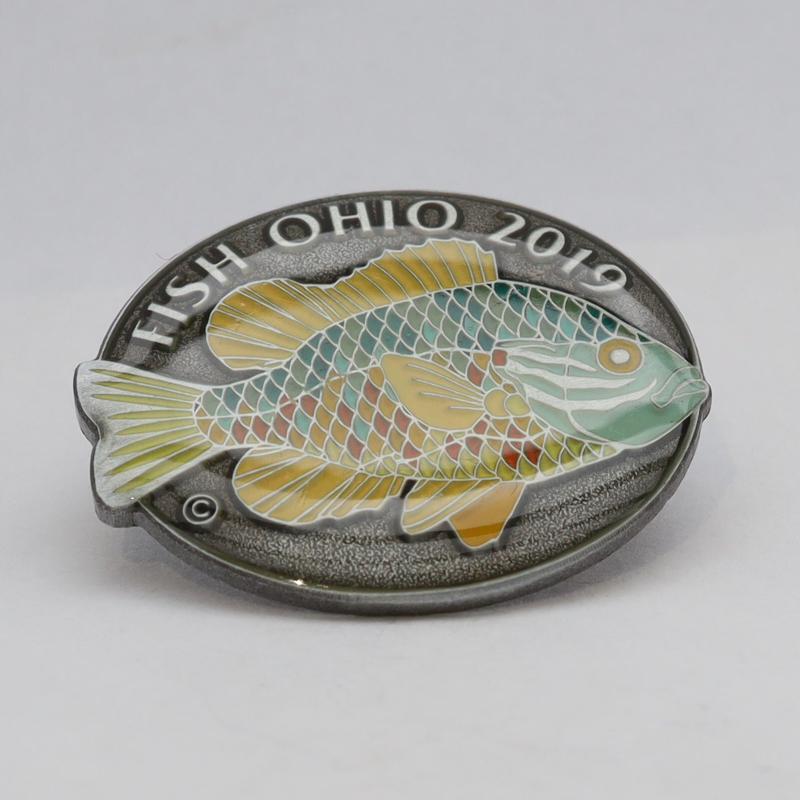 The 2019 Fish Ohio pin features a pumpkinseed sunfish. This is one of the most colorful fish featured on the pins. The scales are outlined in the same silver color as the words Fish Ohio and the date above the fish. They are individually enameled in shades of blue and green on the top half of the fish and shades or orange and red on the bottom half. The fins are a light orange and the face is blue. The background of the pin is not enameled in a color.Context