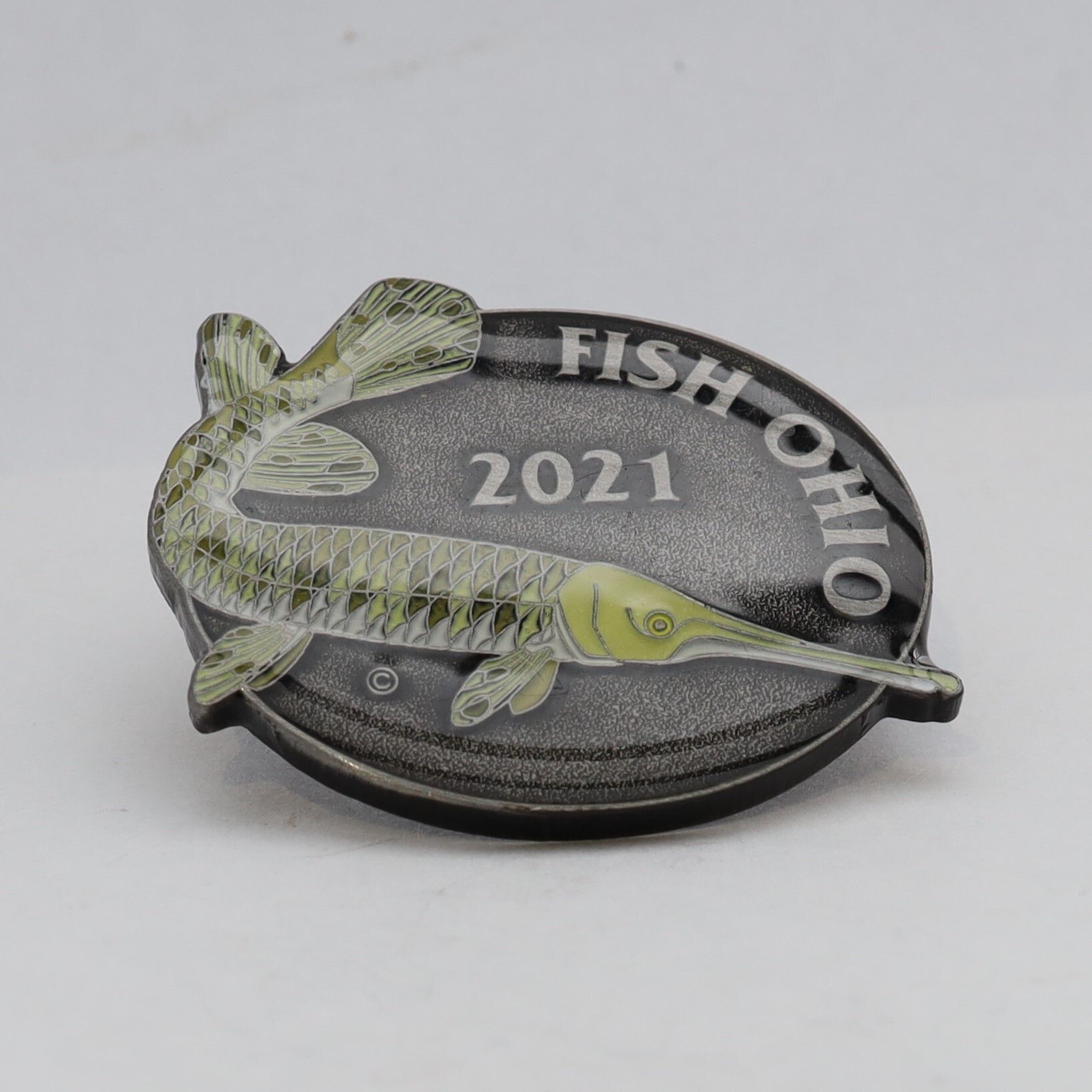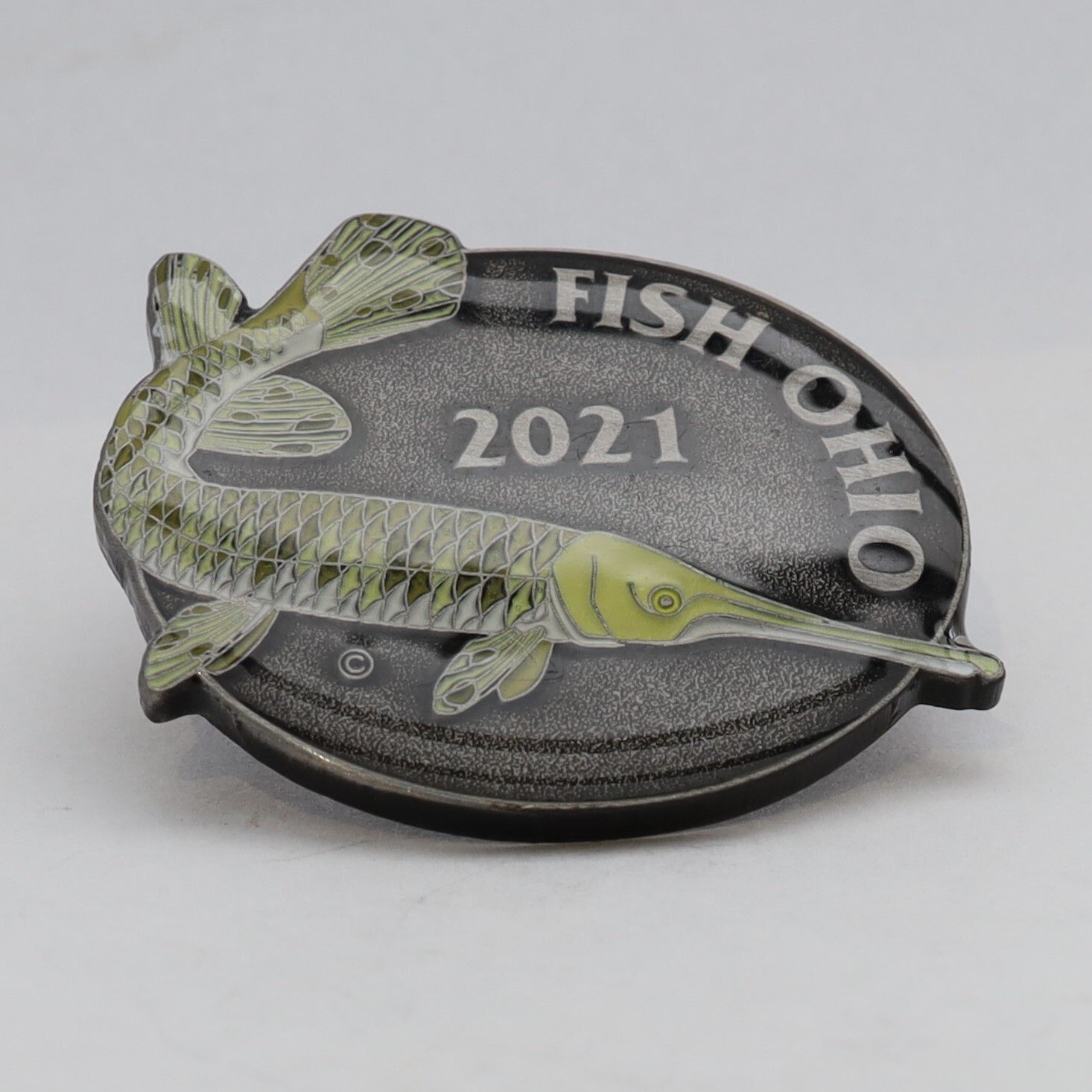 The 2021 Fish Ohio pin features a longnose gar. The fish's scales are shades of green with occasional dark brown spots. The belly is white. The nose and some of the fins of the longnose gar extend beyond the edge of the circular base of the pin. Fish Ohio is in silver around the edge of the pin and the date is centered just above the fish.Context